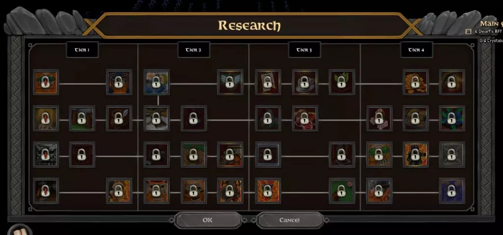 学者会为你研究科技点,你可以用这些科技点从科技树中解锁可用的科技。你可以建造标准的研究台,之后可以用升级版替换它,以加快研究进程。我倾向于保留一到两名学者来进行研究。和工匠一样,他们不需要太多维护,大多数时候你只需让他们专注于研究即可。科技树分为四个层级,每个层级需要更多的科技点才能解锁。