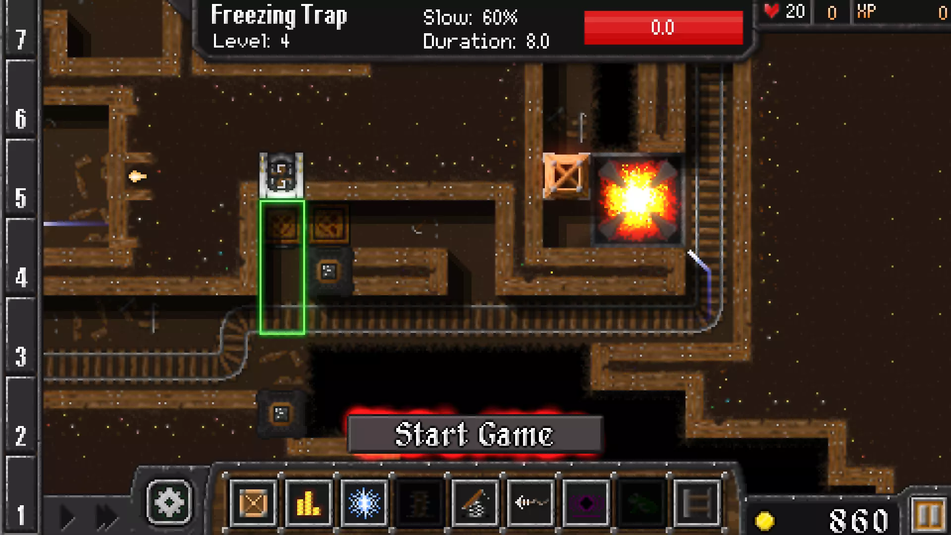 确保将冰冻陷阱升级到4级深度冻结。 设置弹簧陷阱将敌人弹回。 如果资金不足,无需在下方安装灵魂收割装置。 2. 早期回合