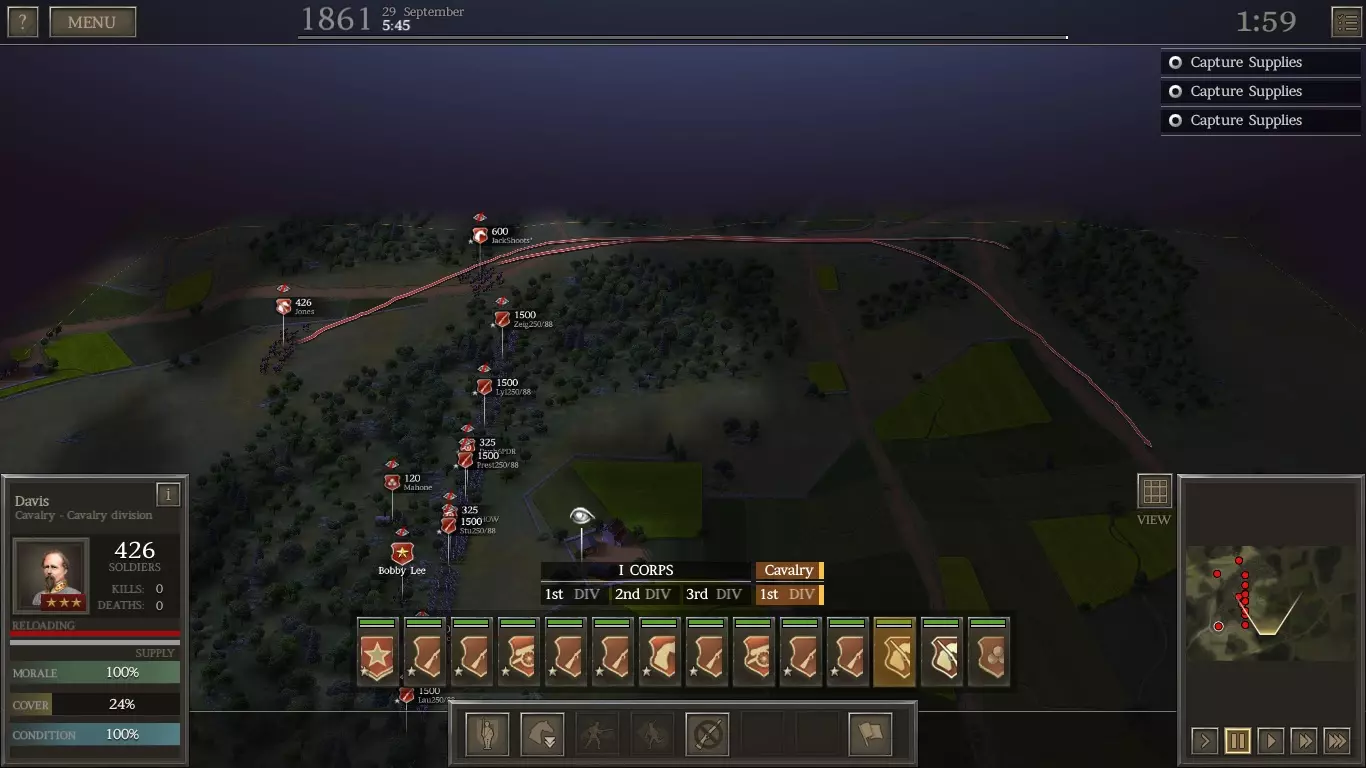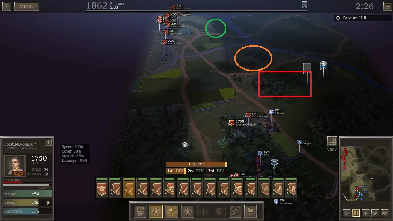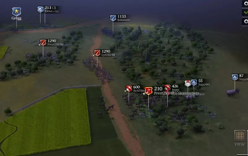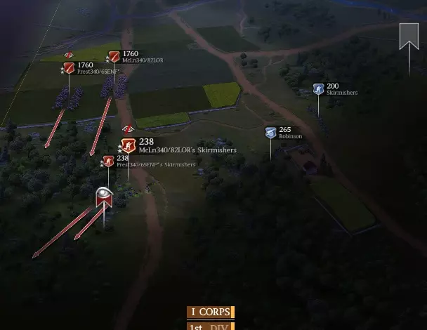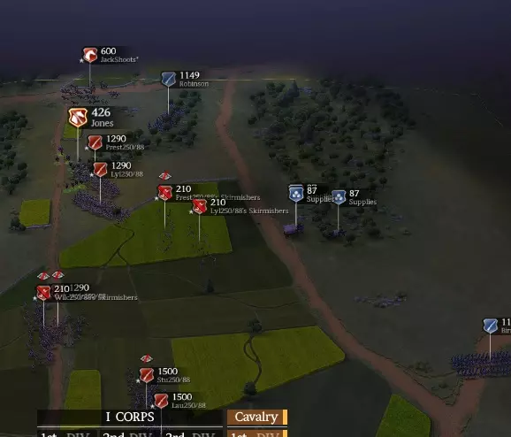 注意我们拥有的资金和兵力(蓝色方框)。在准备接下来的两场大型战役时,你会消耗掉这些资源。 你可能注意到我组建了第三军。我在那里添加了一些500人的基础旅来观察它们的效果,但并不明显。既然你已经知道方法,你可以自己尝试一下,也可以选择不尝试。 作战计划 初始你只有2个旅。部署你最好的2个步兵旅,让它们沿着左侧(西侧)边缘向下进入树林。然后它们将向东发起攻击(略早于你其他所有部队加入战斗)。 记住先派出散兵来保护他们的侧翼。会有1名敌方散兵逃跑,联邦炮兵会进行一些零星射击(最好让他们瞄准你的散兵,而不是你的整旅部队)。