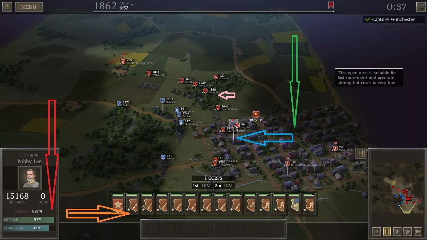 这就是我们只给那些将参加下一场战斗的部队补充兵员的另一个原因。给未参战的旅补充兵员会提高我方旅的平均规模,从而增加我们将面对的敌人数量。重要的是要提前规划,只给即将参战的部队补充兵员。你可以将添加500人“压舱旅”视为一种作弊行为,所以只有当你在次要战斗中陷入大麻烦并希望重玩时才应该这样做。 注意:你可以随时通过点击某个“压舱旅”,然后点击右上角的骷髅图标来解散它们。你不会有任何损失。士兵和军官会回到你的招募池,武器会回到军械库。 第一次温彻斯特战役策略 你奉命夺取城镇,有两种战斗方式可供选择。选项1:向东和向南推进(下方绿箭头和蓝箭头所示) 选项2:先沿西侧向下推进,再转向东(下方红箭头和橙箭头所示) 始终让配备最便宜武器的士兵打头阵,并让他们派遣散兵在前开路。 以下是我占领城镇后选项1的示例。