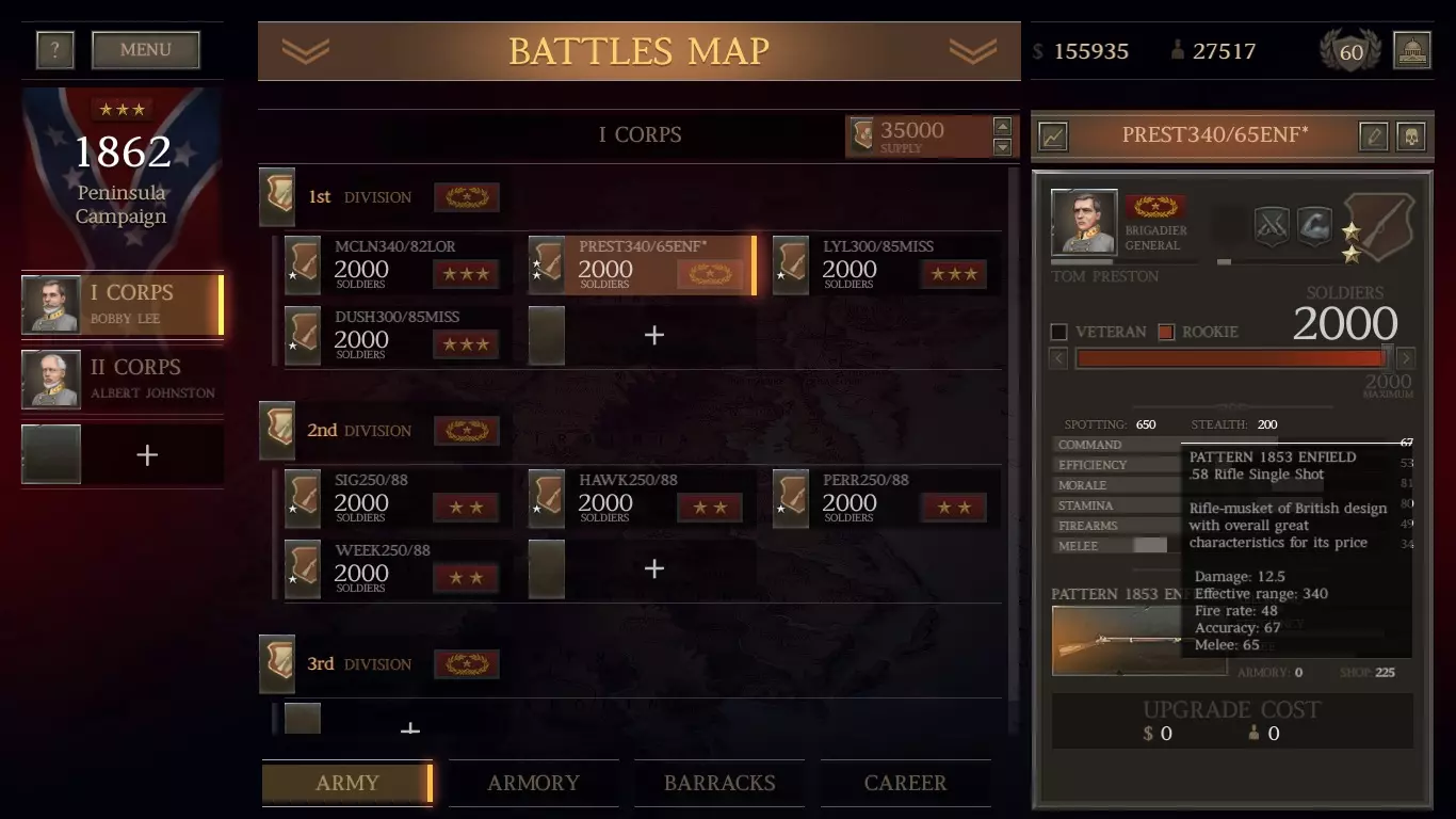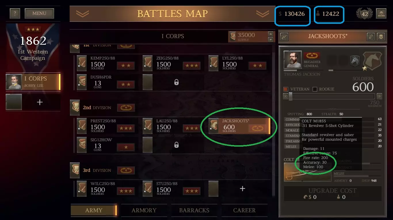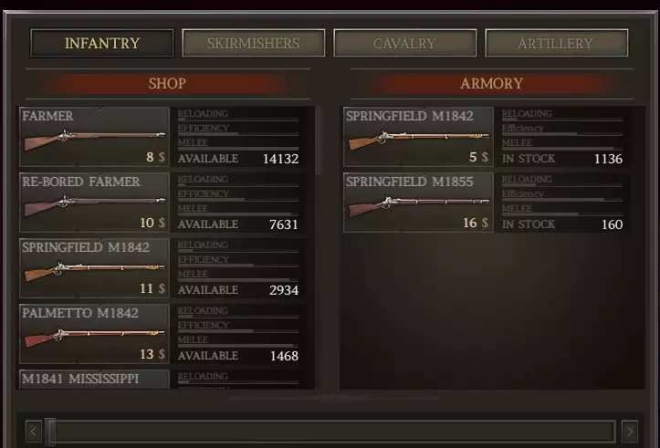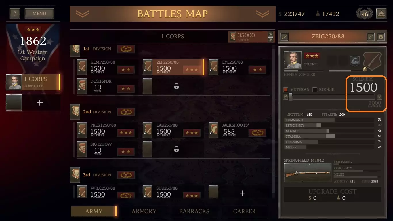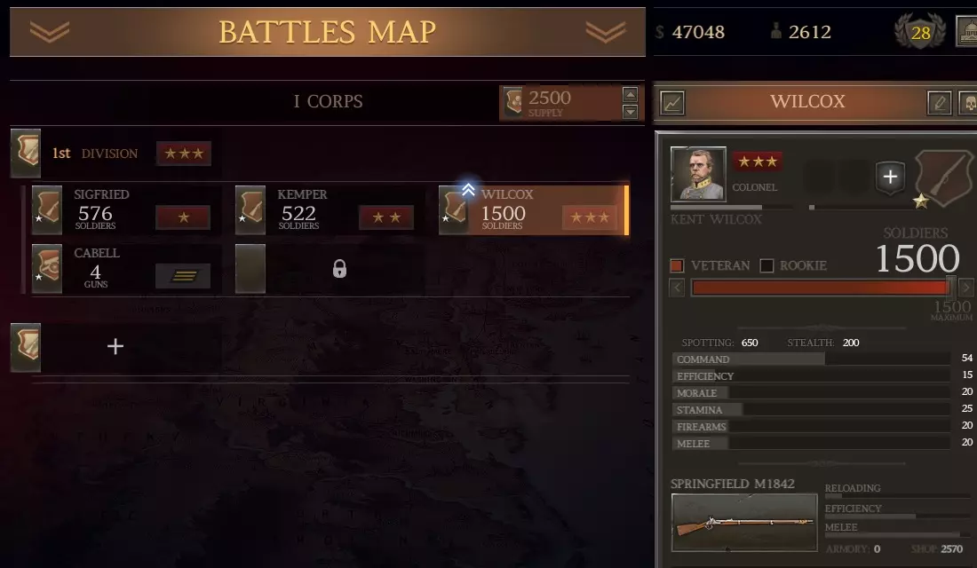 我这里有1136支春田1842型步枪(上一场战斗中从阵亡士兵那里收集到的)。我可以组建一个由新兵组成的旅,规模与此相当,且无需花费。但即将有一场大战,所以我想要最大规模的旅。我愿意花钱从商店以每支11美元的价格(左列)购买剩余的步枪,组建一支满编1500人的春田步枪旅。 军队方面: 前往你的军队界面,创建一个旅并选择一名三星上校来领导它。 原因如下: 对于南部邦联(CSA)而言,如果你使用三星或更高等级的指挥官,你的旅会自动获得一星评级并得到一项“ perk”强化。点击“+”号,选择肌肉手臂(最右侧)强化。给他们配备春田1842型步枪。