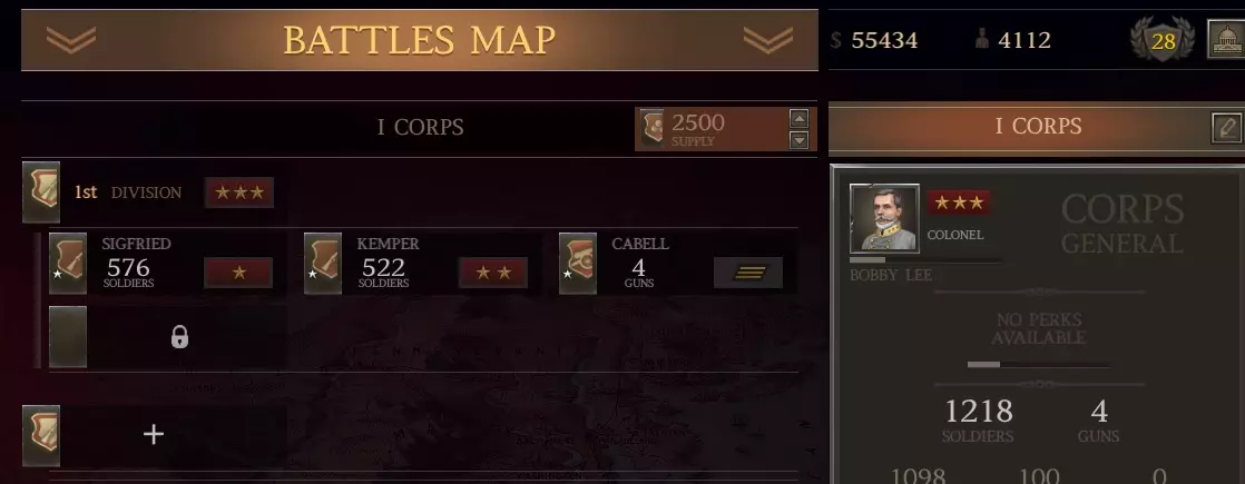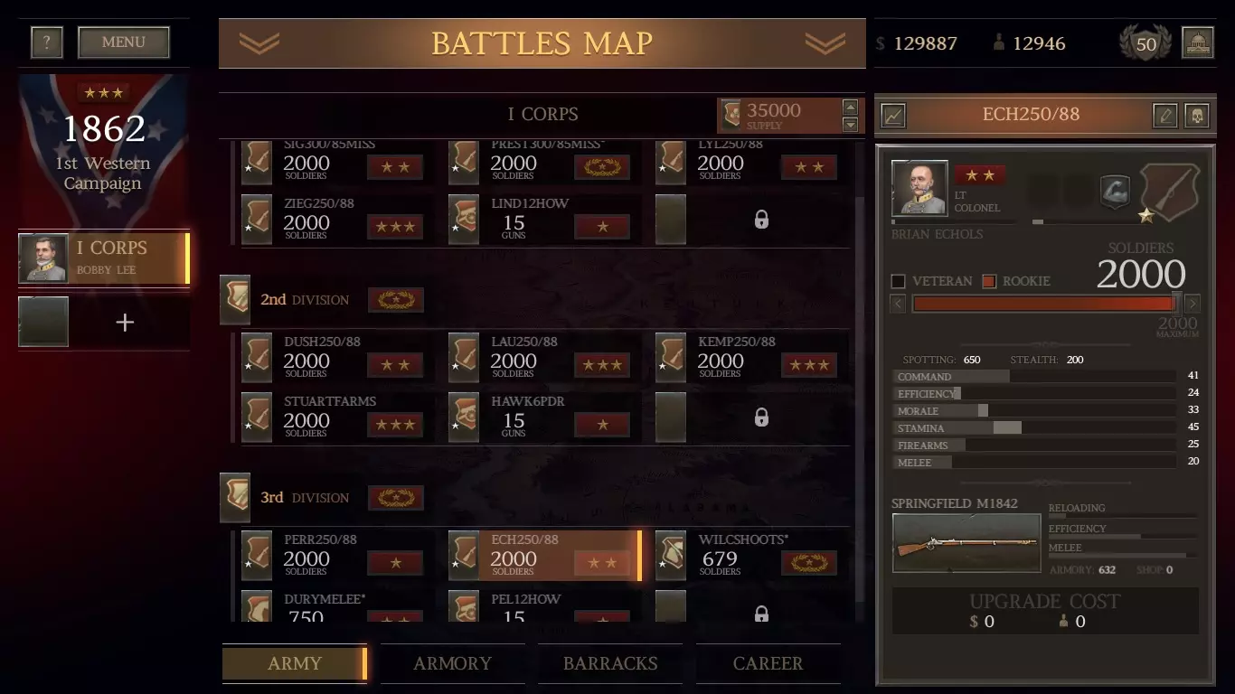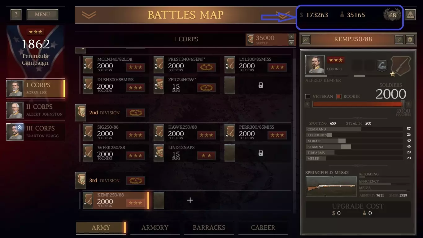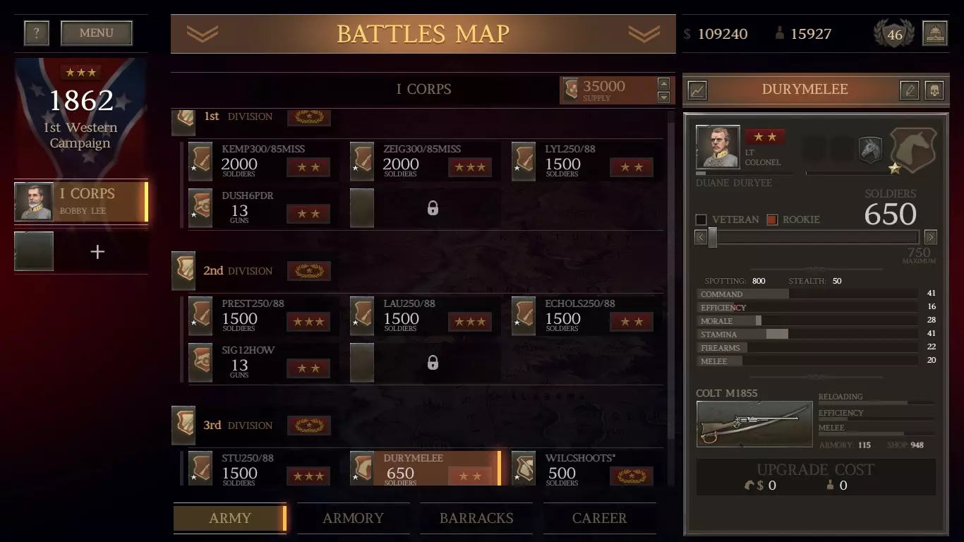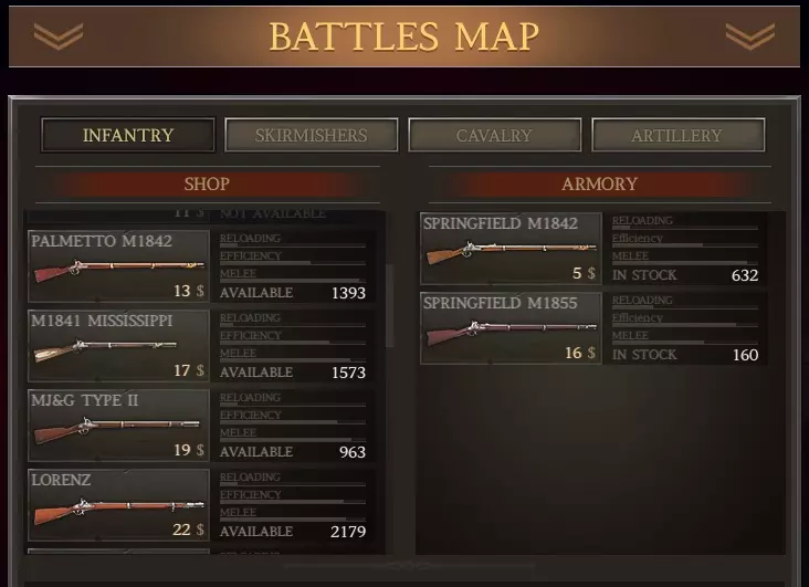 我这里有1136支春田1842型步枪(上一场战斗中从阵亡士兵那里收集到的)。我可以组建一个由新兵组成的旅,规模与此相当,且无需花费。但即将有一场大战,所以我想要最大规模的旅。我愿意花钱从商店以每支11美元的价格(左列)购买剩余的步枪,组建一支满编1500人的春田步枪旅。 军队方面: 前往你的军队界面,创建一个旅并选择一名三星上校来领导它。 原因如下: 对于南部邦联(CSA)而言,如果你使用三星或更高等级的指挥官,你的旅会自动获得一星评级并得到一项“ perk”强化。点击“+”号,选择肌肉手臂(最右侧)强化。给他们配备春田1842型步枪。