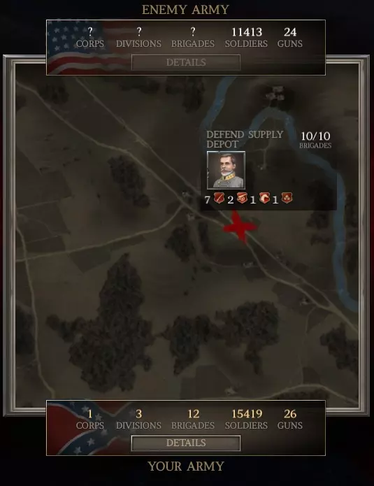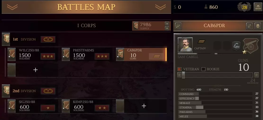 你的16100名士兵将面对约11400名敌人。 返回营地。 前往你的第二军。 添加7个旅,每旅500人。给他们安排你现有的任何指挥官。给他们配备斯普林菲尔德步枪,直到用完为止,然后再配备农民步枪。如果必须购买武器,就买农民步枪。