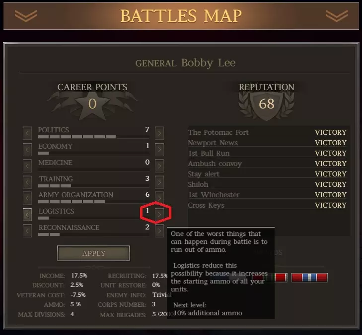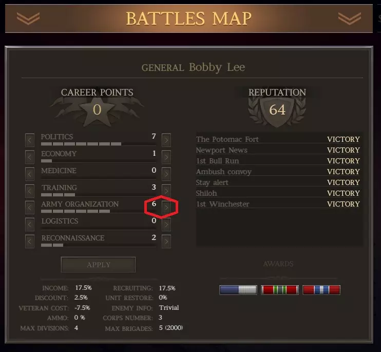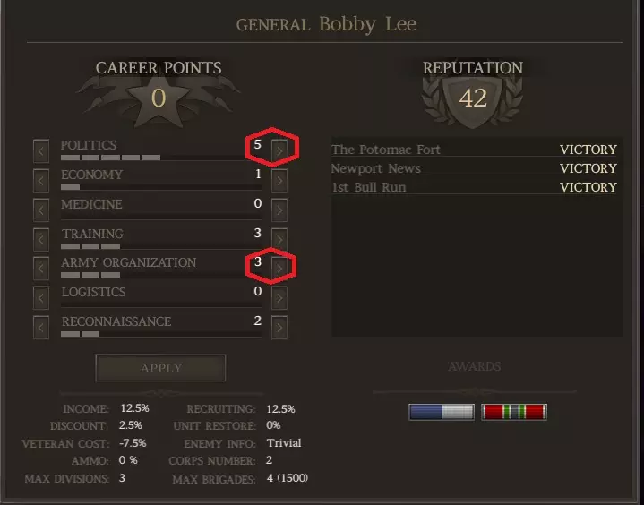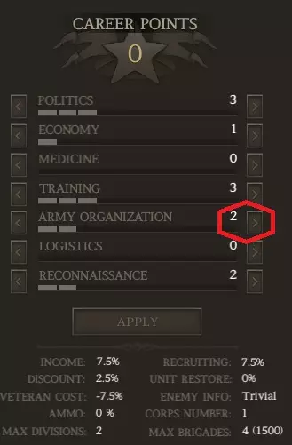齐格飞通常会战死,但我这次运气不错。如果他牺牲了,只需“招募”一名二星将领作为替代。 生涯 进入生涯标签页,将1点技能点加到军队编制上,使其数值达到2。从现在开始,你所有的生涯点数都应分配给政治或军队编制。原因如下: a) 作为南部邦联,你通常在兵力上处于劣势。军队编制能让你组建更庞大的军队。 b) 拥有大量旅级部队来填补战线缺口、承受伤害等非常有用,这为战斗中部署部队提供了更大的灵活性。 c) 南部邦联很容易出现人力和资金短缺的情况,因此政治也很重要。 当你分配这1点生涯点数后,结果如下: