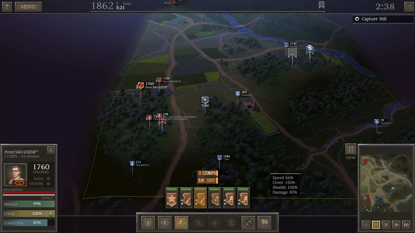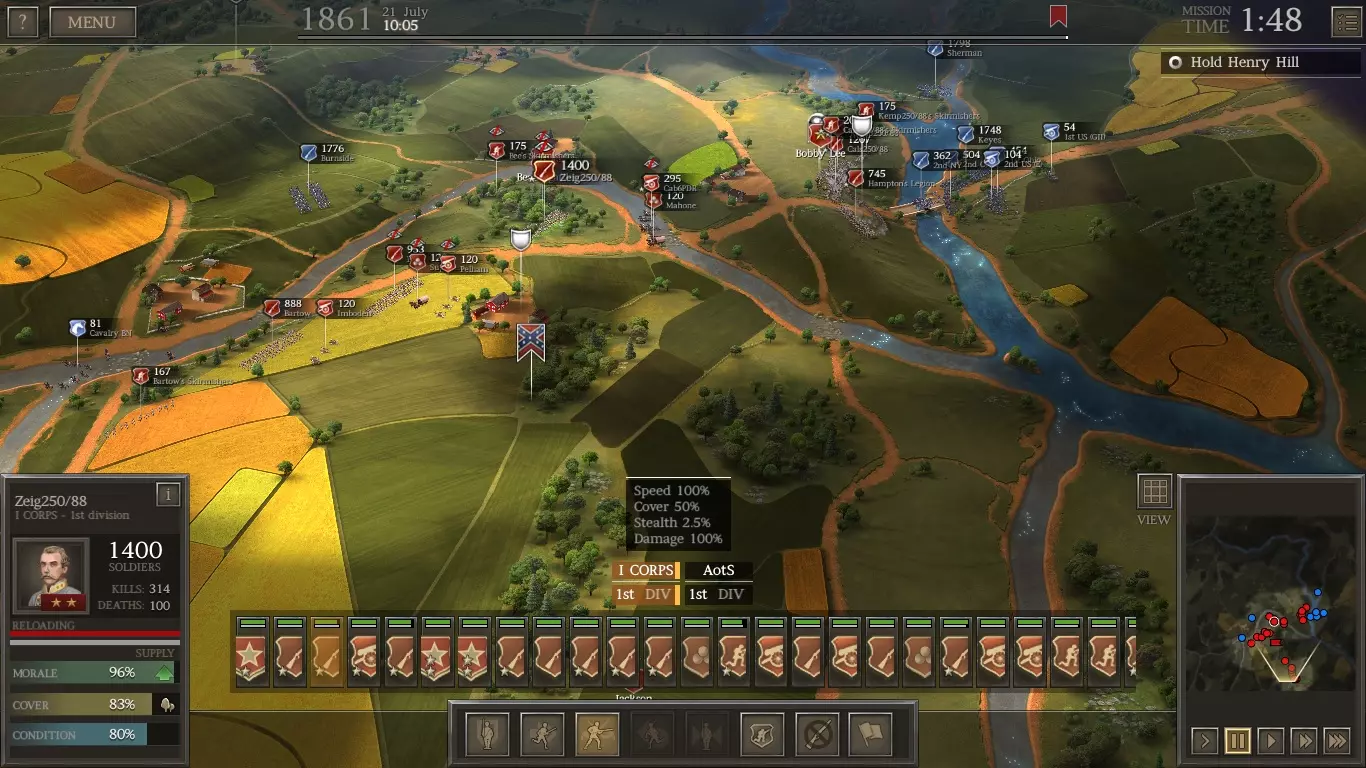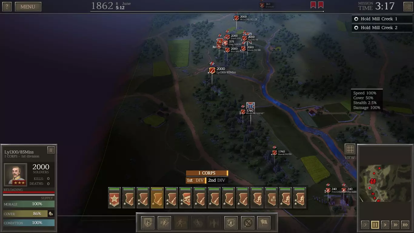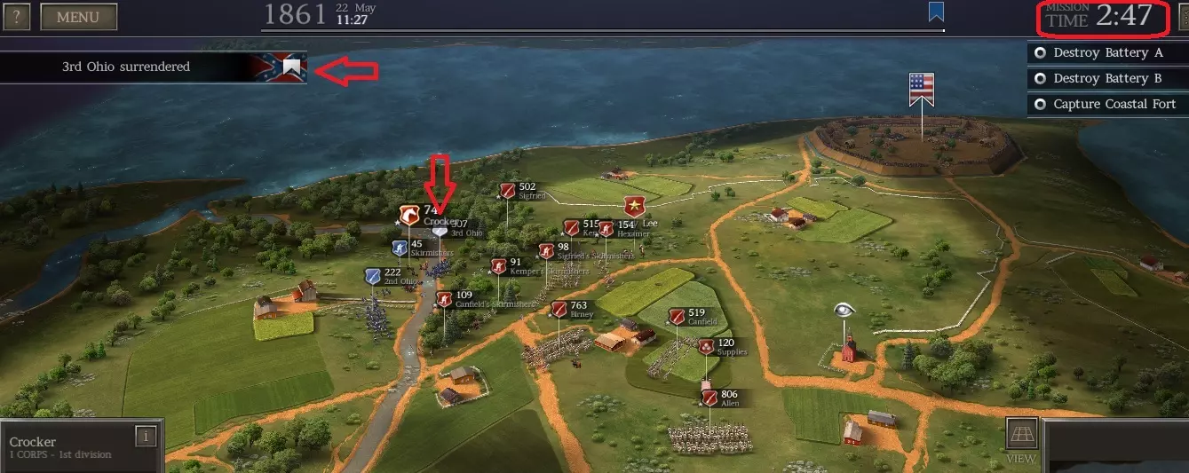 第一部分:夺取堡垒 这一阶段的关键在于攻击从地图最左侧出现的联邦旅,要赶在他们在堡垒中构筑防御工事之前行动。你应尝试在河流渡口附近牵制住他们。当援军抵达后,将其投入进攻,歼灭敌方旅团。以下是一个示例(我在其中成功俘获了一支联邦部队)。
