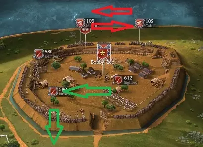 歼灭联邦军后,让你的士兵休整,直到剩余时间在2小时到1.5小时之间,然后迅速冲入并攻击堡垒。 肯珀和齐格弗里德将在战斗结束后作为你的初始旅赠予你,因此要尽可能保全他们。此外,在你占领堡垒后,他们最初将负责驻守,所以你希望他们保持最佳状态。 第二部分:防御堡垒 这里有个技巧,战斗结束后,卡贝尔会作为你的炮兵单位赠予你,而敌方舰队主要会攻击卡贝尔初始所在的最右侧炮兵阵地。因此,立即交换你的炮兵位置(红色箭头处)。