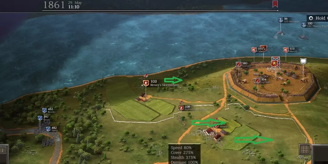 作战计划 从所有斯普林菲尔德1842型部队中派出散兵作为先锋。敌方有大量散兵,你需要找到他们。 两个旅应沿着河流两侧向左翼推进。其余所有部队应斜向推进至右上方,从那里突破敌军防线。
