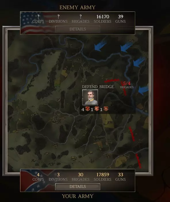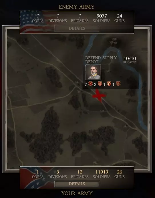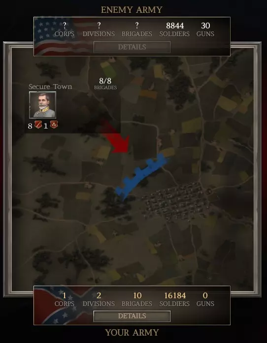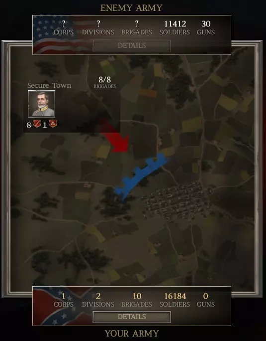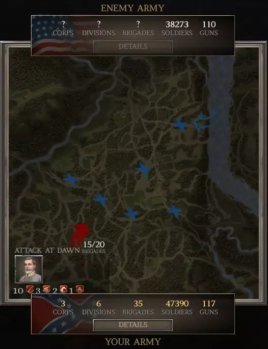 还记得我之前提过,对于小型战役,你的旅平均规模很重要吗?通过添加许多小型旅,你降低了平均规模。 现在回到战役界面,把你的第1军重新部署进去。 看!我们的步兵现在在数量上远超联邦军了(16,100对约8,800)。