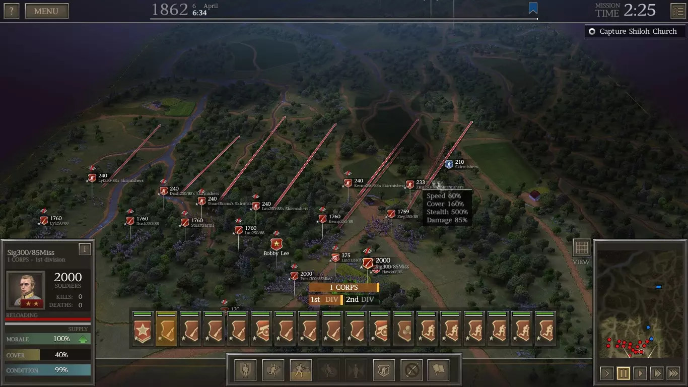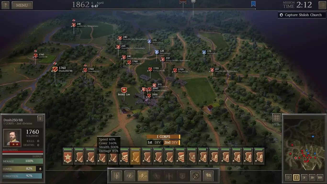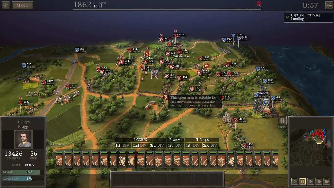 注意你那两支2000人的精锐部队的部署位置。它们在良好的掩护下将在那里进行大量战斗。此外,从你较弱的步兵中派遣散兵,并将他们分散部署,以应对即将到来的敌方骑兵。如果侧翼情况危急,你可以从更精锐的部队中派遣更多散兵。尽量保持在掩护状态。 #6 夏洛战役 要在夏洛战役中取得胜利,绝对有必要在第一天夺取匹兹堡登陆点。你不会希望战斗进入第二天。 实现这一目标的方法是,用你的部队沿着初始地图的东侧(右侧)发起猛攻。 面对第二张地图上的电脑部队时,你要沿着西侧(左侧)推进。 当两张地图合并时,你的两支军队将在中央区域相互靠近。率领部队穿过中央缺口前往匹兹堡登陆点,要赶在联邦军之前抵达,阻止他们靠近。 为夏洛战役组建部队 将1个生涯点数加到陆军编制上(使其达到5点)。 你只能带领15个旅(而非夏洛战役允许的20个),因此要将所有步兵旅补充至最大规模2000人。如果某个部队的经验条达到一半,可优先补充老兵(但花费不超过10000美元),帮助他们提升等级(并获得技能)。
