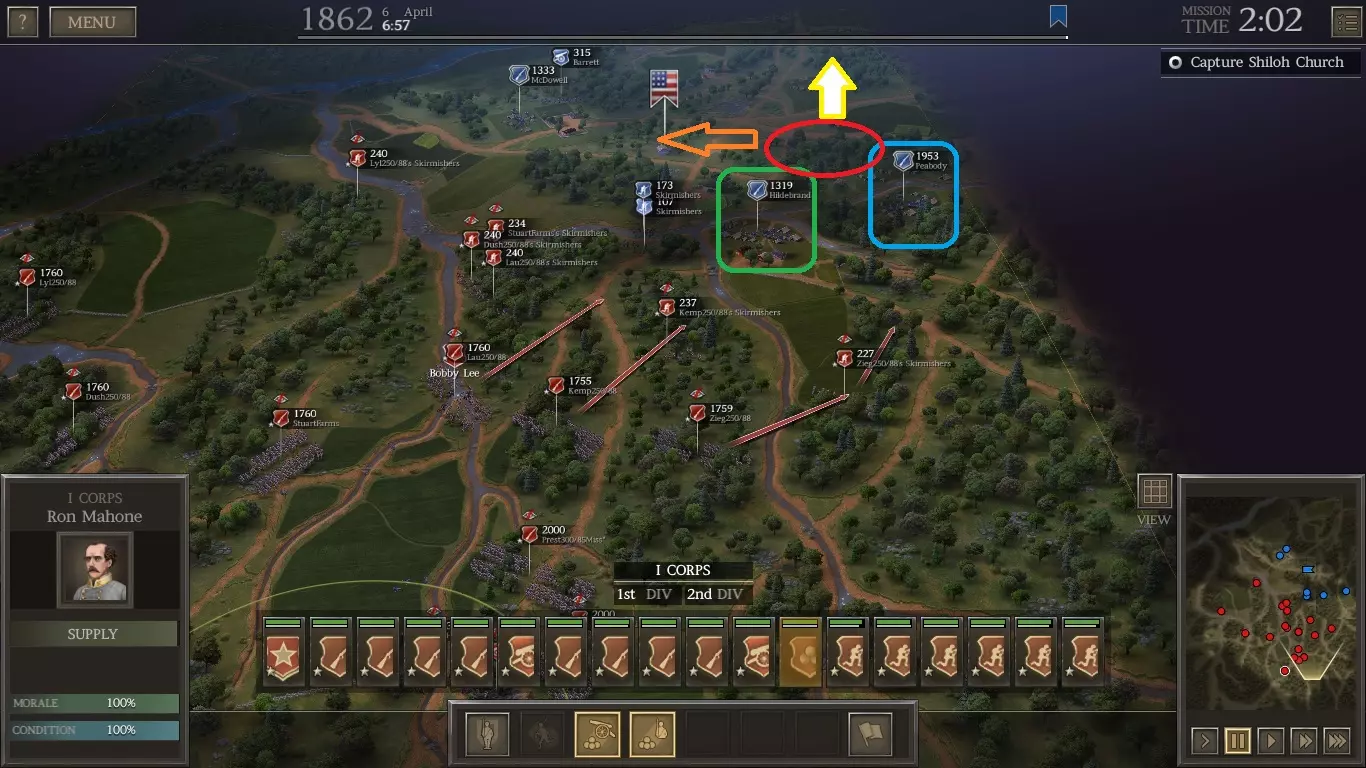 步骤1:让你的春田步枪兵和炮兵向希尔德布兰德(绿框处)开火。你的其中一支密西西比部队应该能在掩蔽处开火,且不会遭到反击,因为敌人会瞄准更近的部队。希尔德布兰德的部队很容易溃败,无需冲锋。 步骤2:移动至皮博迪(蓝框处),用多支部队向其开火。你可能需要让一支春田步枪兵冲锋,但尽量避免。 步骤3:占领红色椭圆标记的森林。 步骤4:向旗帜旁的部队(橙色箭头处)开火,将他们击退。占领旗帜。 步骤5:会有联邦军从北方来袭。从掩蔽处(黄色箭头处)向他们开火。 最终,你需要向西推进并夺取夏洛教堂,然后向北移动(黄色箭头处)并占领那些树林。你需要占据地图的北侧和东侧(即大片蓝色区域及其边界所在的位置)。 阶段二: 当战斗转移到右侧地图时,你将拥有所有AI单位。在此阶段,你需要占据地图的左侧和北侧。无需夺取东北方向的VP点,直接忽略它。 注意搜寻并夺取敌方补给 wagon(补给车),在这场漫长的战斗中,你可不想耗尽弹药。 阶段三: 回到夏洛战场,将联邦军压制在西侧。当两张地图合并后,你需要迅速派遣状态最佳的精锐部队前往匹兹堡登陆点。派遣你的骑兵部队。那里可能有一些联邦军炮兵,但骑兵可以轻松击溃他们。前往右侧树林,阻止“蜂巢”的部队向北撤退至兰丁。 你无需将联邦军赶出“蜂巢”。实际上,最好不要发动过于猛烈的进攻,这样他们就会留在原地,不会比你先抵达匹兹堡兰丁。 在本阶段接近尾声时,联邦军将从地图的东北部和西北部获得增援。做好应对准备。此时,在还剩一小时的情况下,我已调动几乎所有部队去保护兰丁。