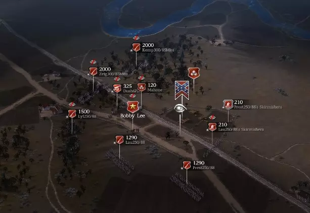 敌军兵力已增至11,400人,而我方兵力现为15,400人。敌军增加了2,400人,我方则增加了3,400人,所以我方占据优势!但在更高难度下,敌军拥有比你好得多的武器,星级评分也高得多(在传奇难度下大多为三星)。因此在高难度下,你的处境会更不利。这就是为什么在讨论区你会看到相关话题。正如本指南中将要介绍的,这种影响在后期规模更大的战斗中也更为明显。 为【保持警惕】做准备 回到每个旅有1,500人的存档。挑选你最好的2个旅,用老兵将它们扩充到2,000人,并为他们配备更好的密西西比武器。保持警惕状态下,在援军抵达前应以防御为主,这两支单位将部署在树林中,既能得到掩护,也会参与大量战斗。