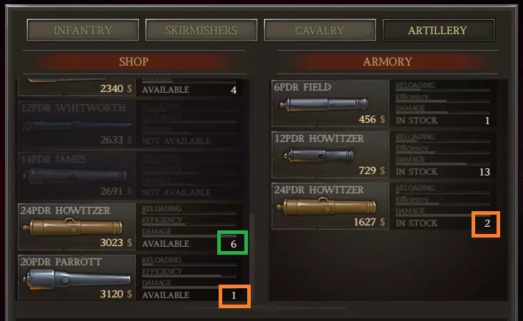 购买六门24磅炮和一门20磅帕罗特炮(唉,只有一门)。这样你就会拥有8门(6+2,抱歉,数字2外的方框应该是绿色的)这种能发射恐怖霰弹的死亡武器,为未来的战斗做准备。 注意我已经缴获了一些12磅榴弹炮(13门)。我们要用这些组建一个新的炮兵单位。 另外,进入散兵选项卡,趁你还没忘,把所有惠特沃思(TS)狙击步枪都买下来。应该有大约64支。 军队调整 用三星上校创建3个新旅,这样他们就能获得一星升级 perk(同样,选择强壮手臂图标)。如果你的其他更资深的部队有三星指挥官,把他们换成二星指挥官,这样你就能把那些上校派给新兵旅。给你现有的步兵补充老兵,让他们恢复到1500人。你应该有足够的武器给每个人配备春田1842型步枪。用军械库的免费火炮组建榴弹炮炮兵部队,并将现有的6磅炮升级到13门(我喜欢比12门多一门,但最多不超过15门)。再次强调,升级炮兵时只能使用老兵。