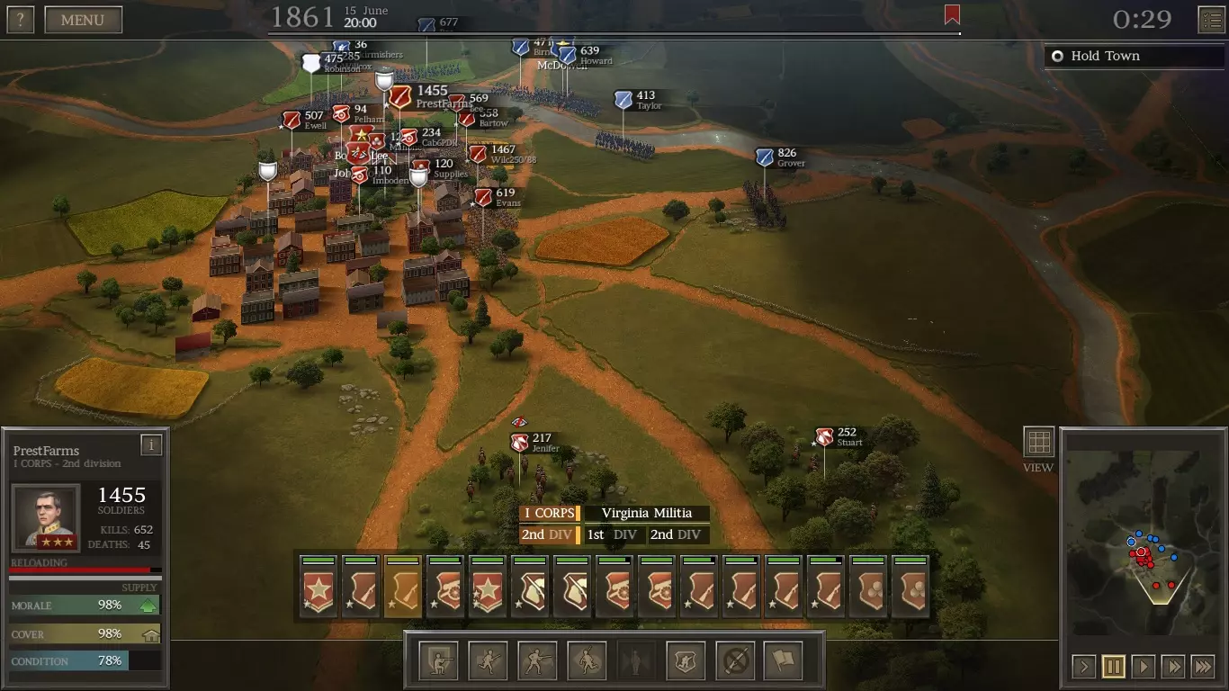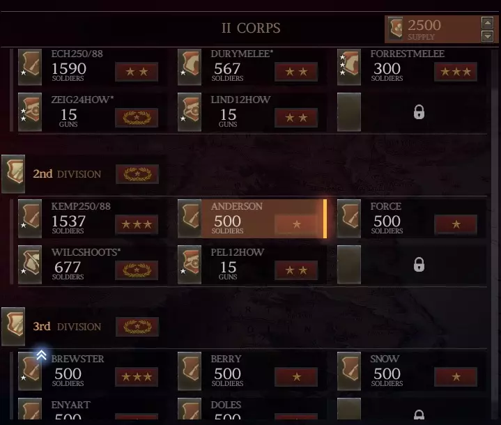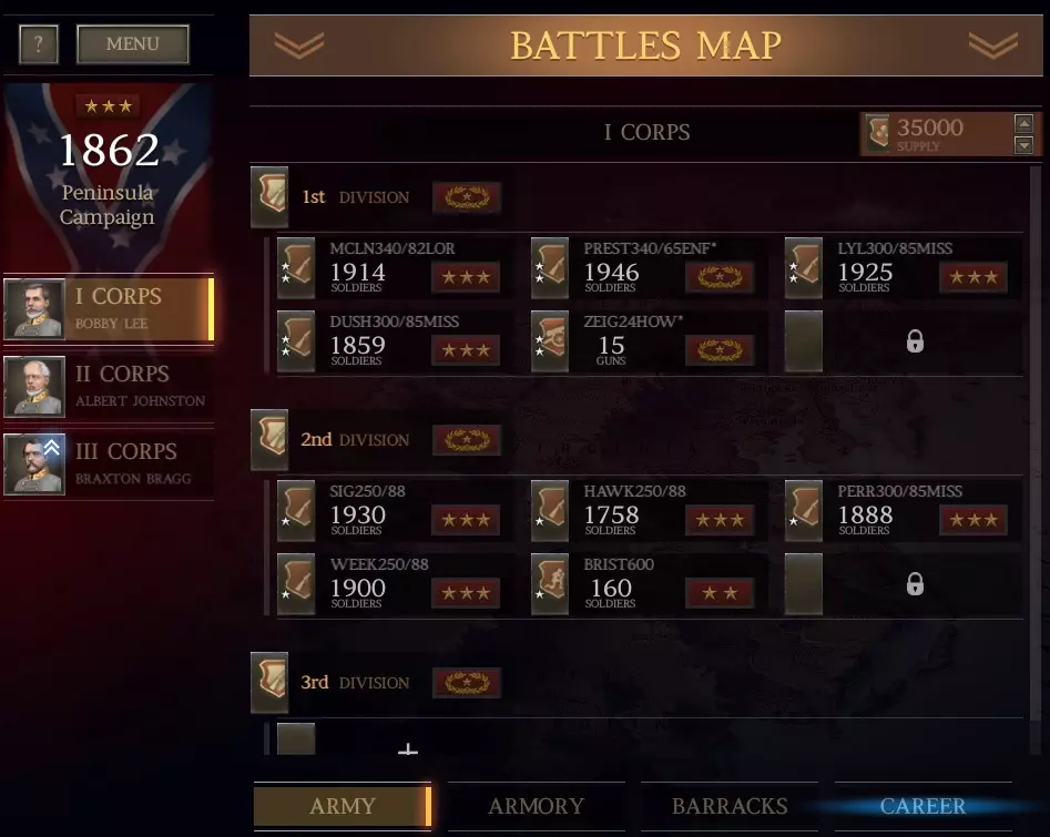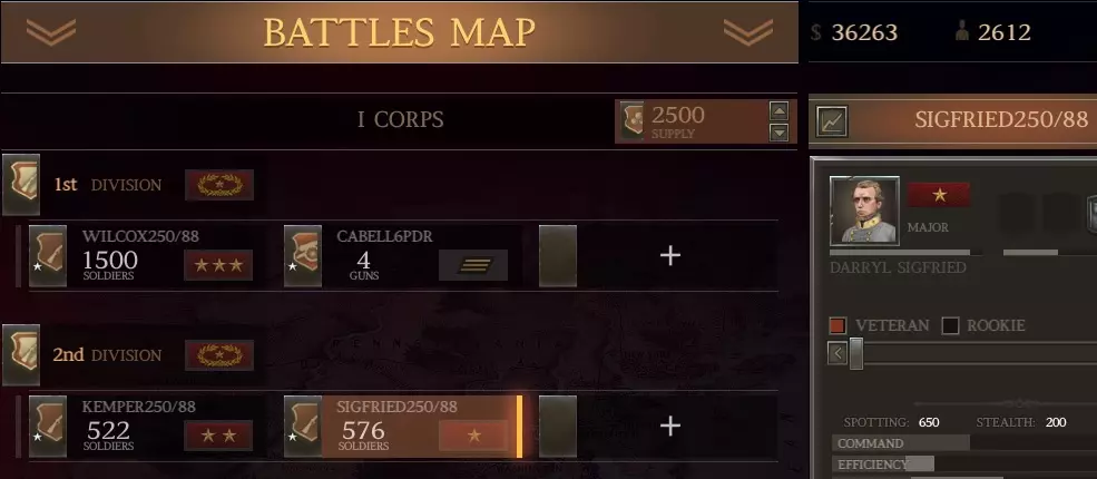 祝你好运! #7 第一次温彻斯特战役 成功赢得夏洛战役后,你将获得2点生涯点数。 将这两点都投入到【政治】属性中(使其达到7点)。政治属性越高,获得的兵员和资金奖励就越多。 目前你的【军队编制】已足够,在下一场大型战役前还有3场小型战斗。 夏洛战役后的军队调整(第一部分) 第一次温彻斯特战役只需8个旅,因此我们只需将这8个旅编入第一军(以便更清晰地查看任何调整所产生的效果)。 创建第二军(由二星少将约翰斯顿指挥)。我自己继续担任第一军指挥官以积累经验。 在第二军内创建2个师。 将你所有的炮兵和骑兵调至第二军。 将2个密西西比步兵团以及你最好的其他6个步兵团留在第一军,其余部队调至第二军。(这是你将带入战斗的8个旅。考虑到战场开阔,你可以考虑带1个骑兵单位,也可以考虑带一些炮兵。这取决于你的战略。) 夏洛战役后的军队调整(第二部分) 我们现在将把第1军调整为如下编制: