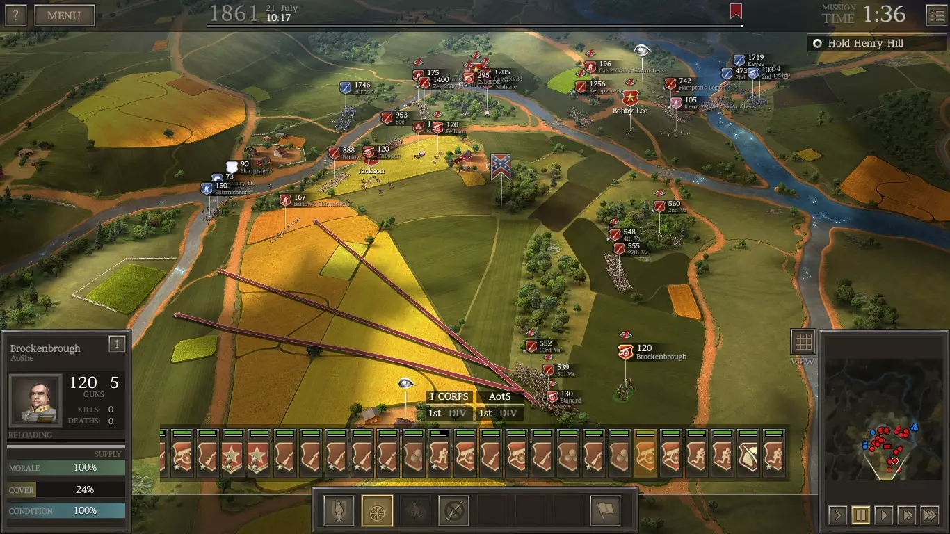 你可以继续坚守桥梁,但要在那里部署一些散兵以防需要撤退——他们可以拖延敌人。 当斯图尔特旅出现时,派一半兵力到左翼支援,另一半到右翼协助守住河东部分。让桥上剩余的部队撤退。你需要让向西行进的部队迅速支援比伊。