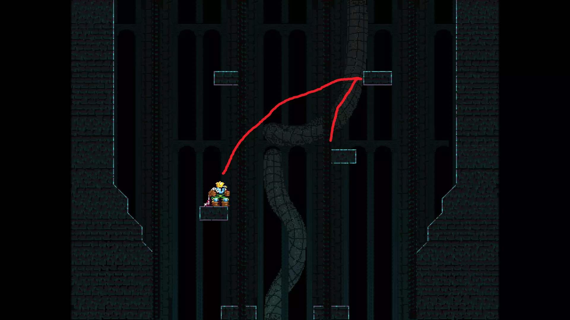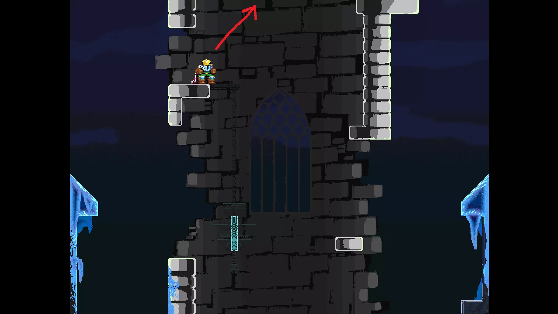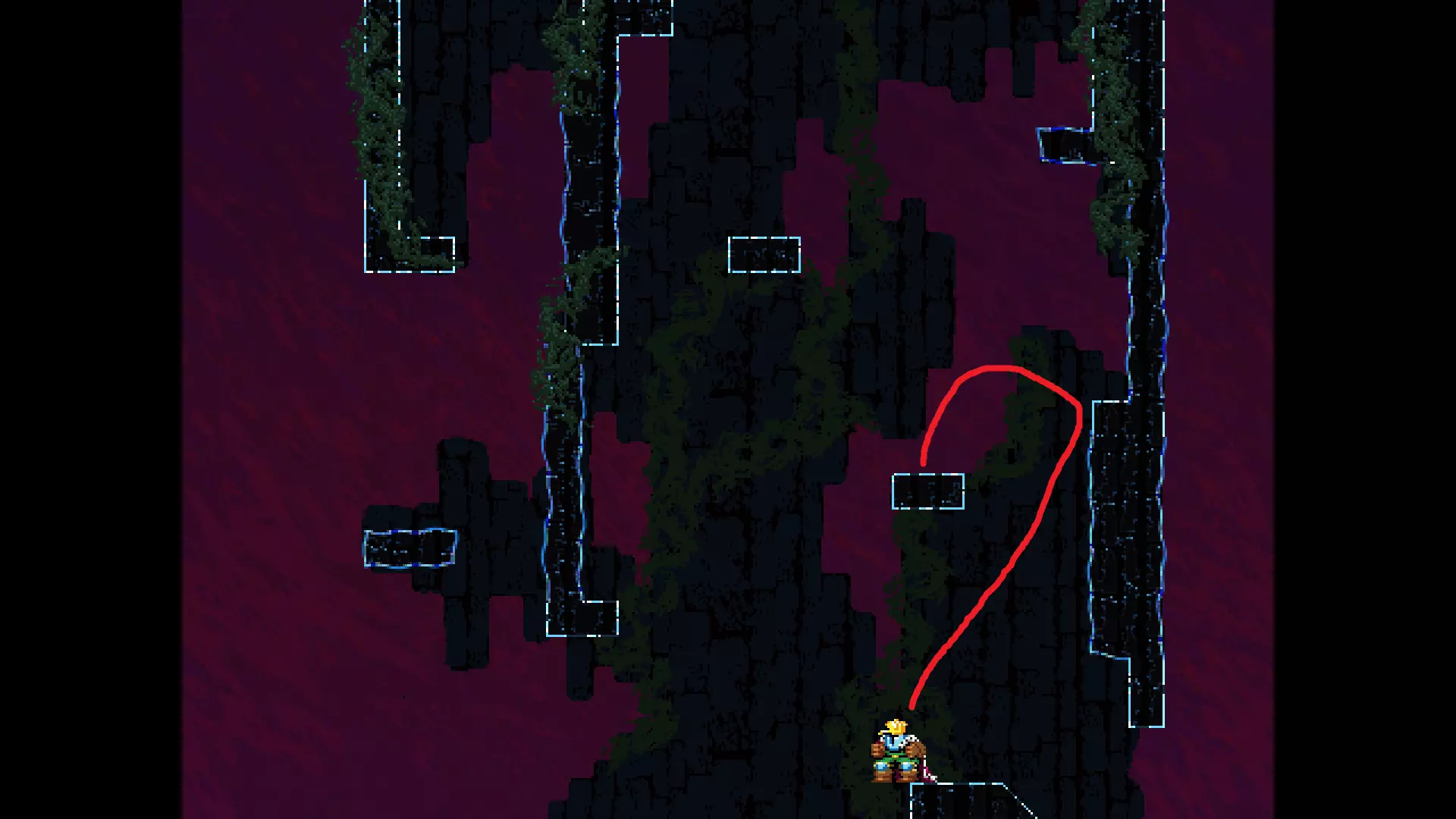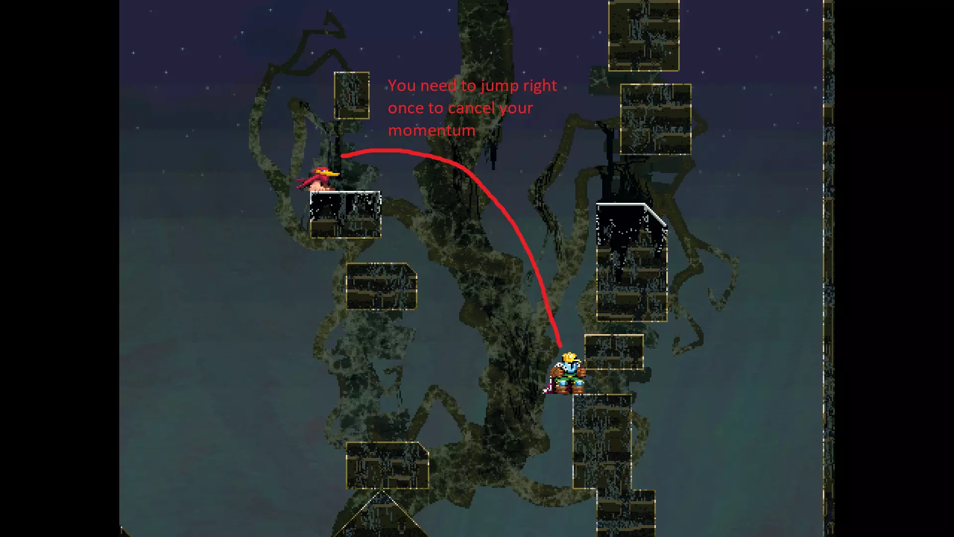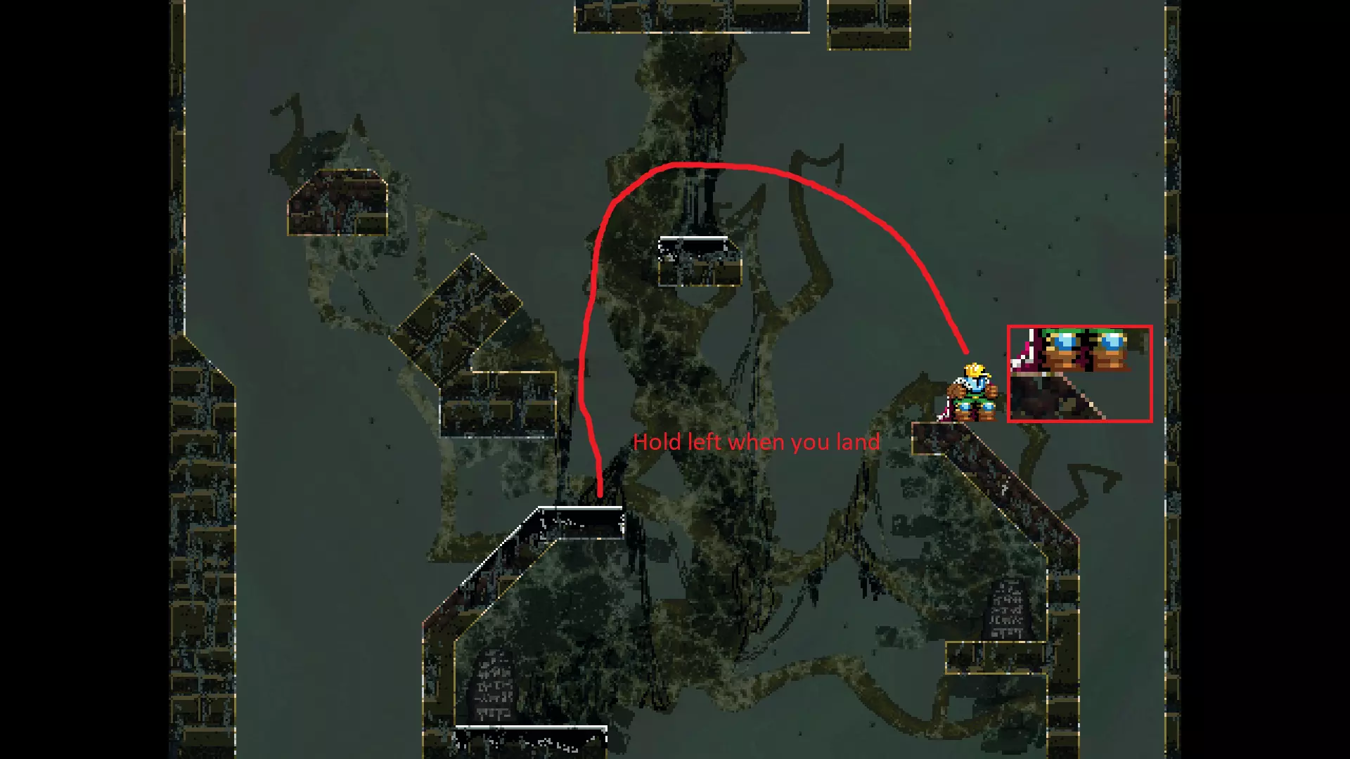请注意,以下跳跃需要【亚像素级】的精准操作。即使你处于这个精确像素位置,也可能无法成功,除非你使用蛇形戒指稍微向右移动,确保自己处于正确的亚像素位置。