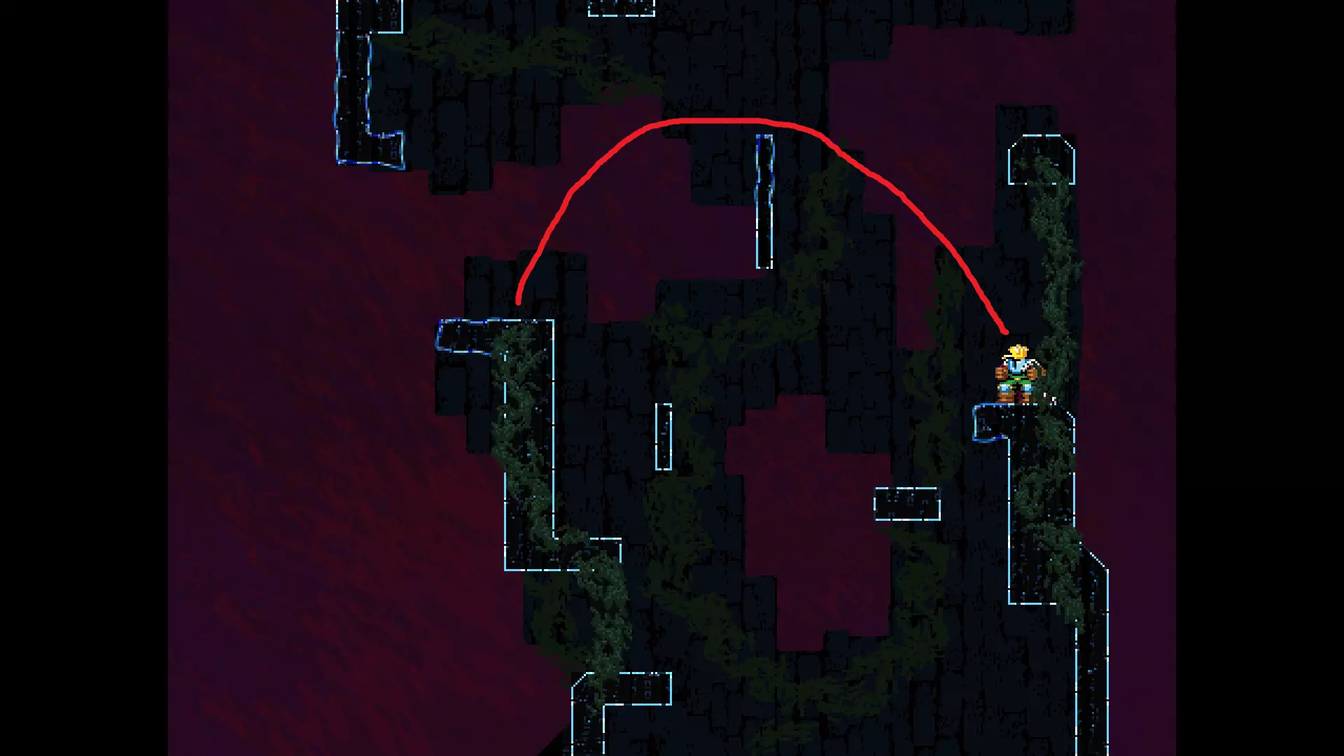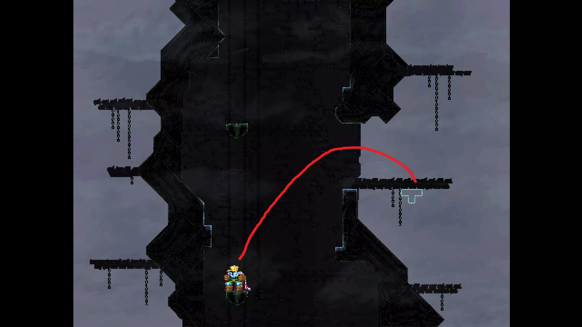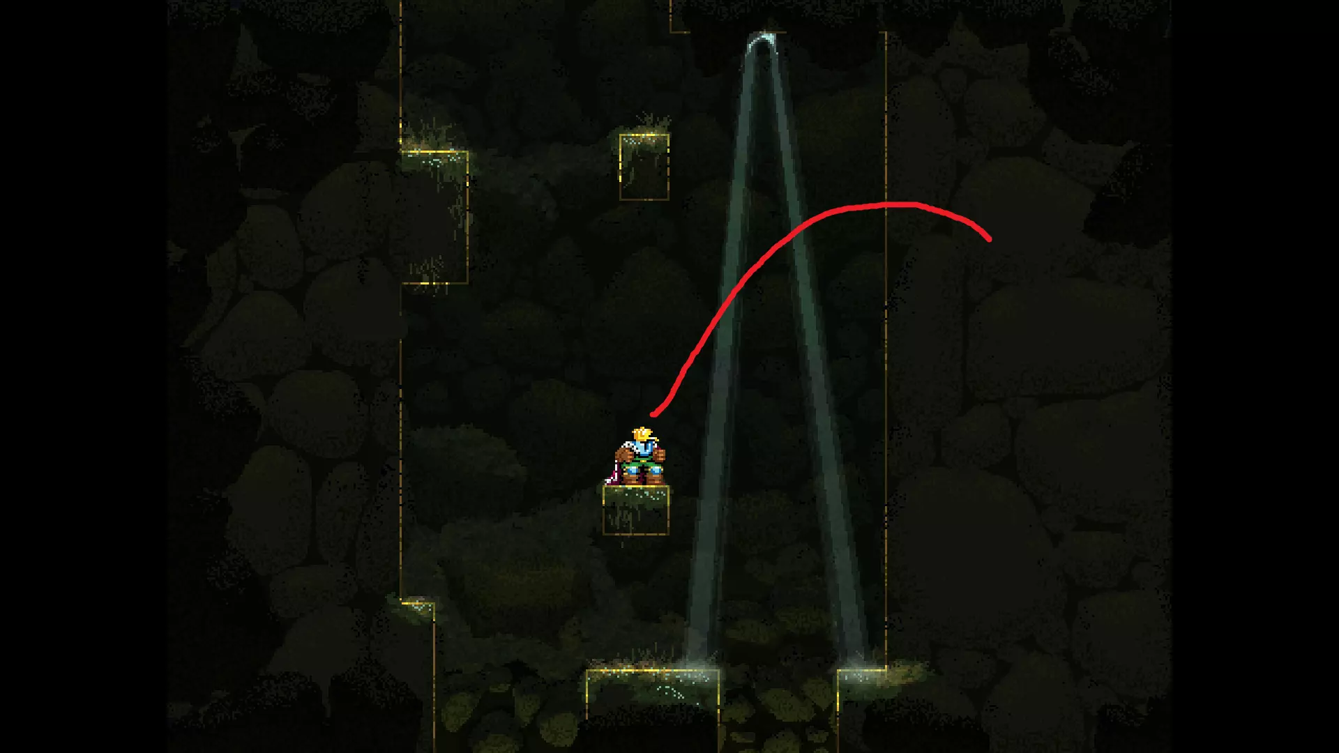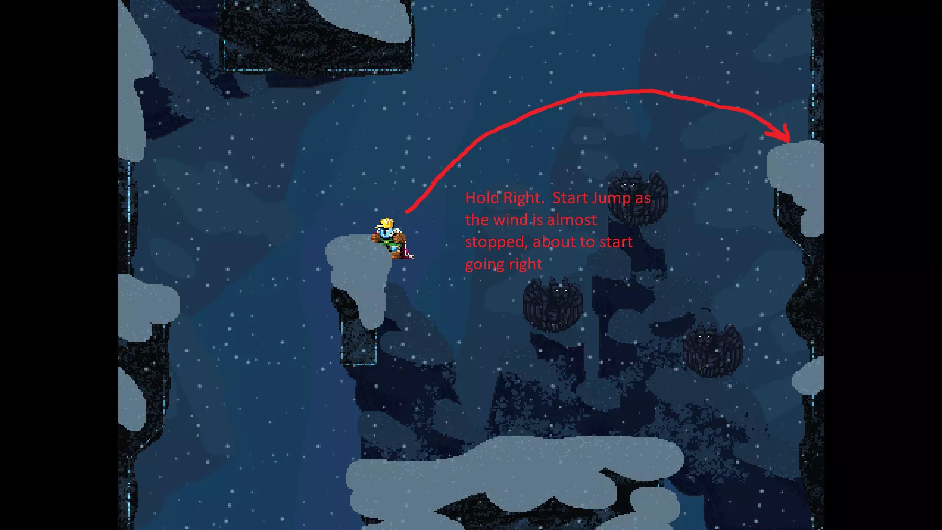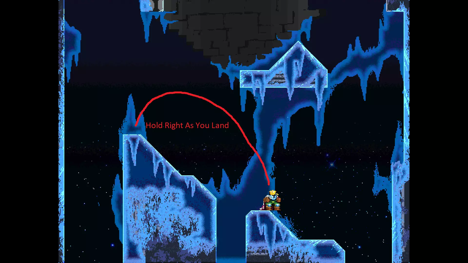 请注意,以下跳跃需要【亚像素级】的精准操作。即使你处于这个精确像素位置,也可能无法成功,除非你使用蛇形戒指稍微向右移动,确保自己处于正确的亚像素位置。