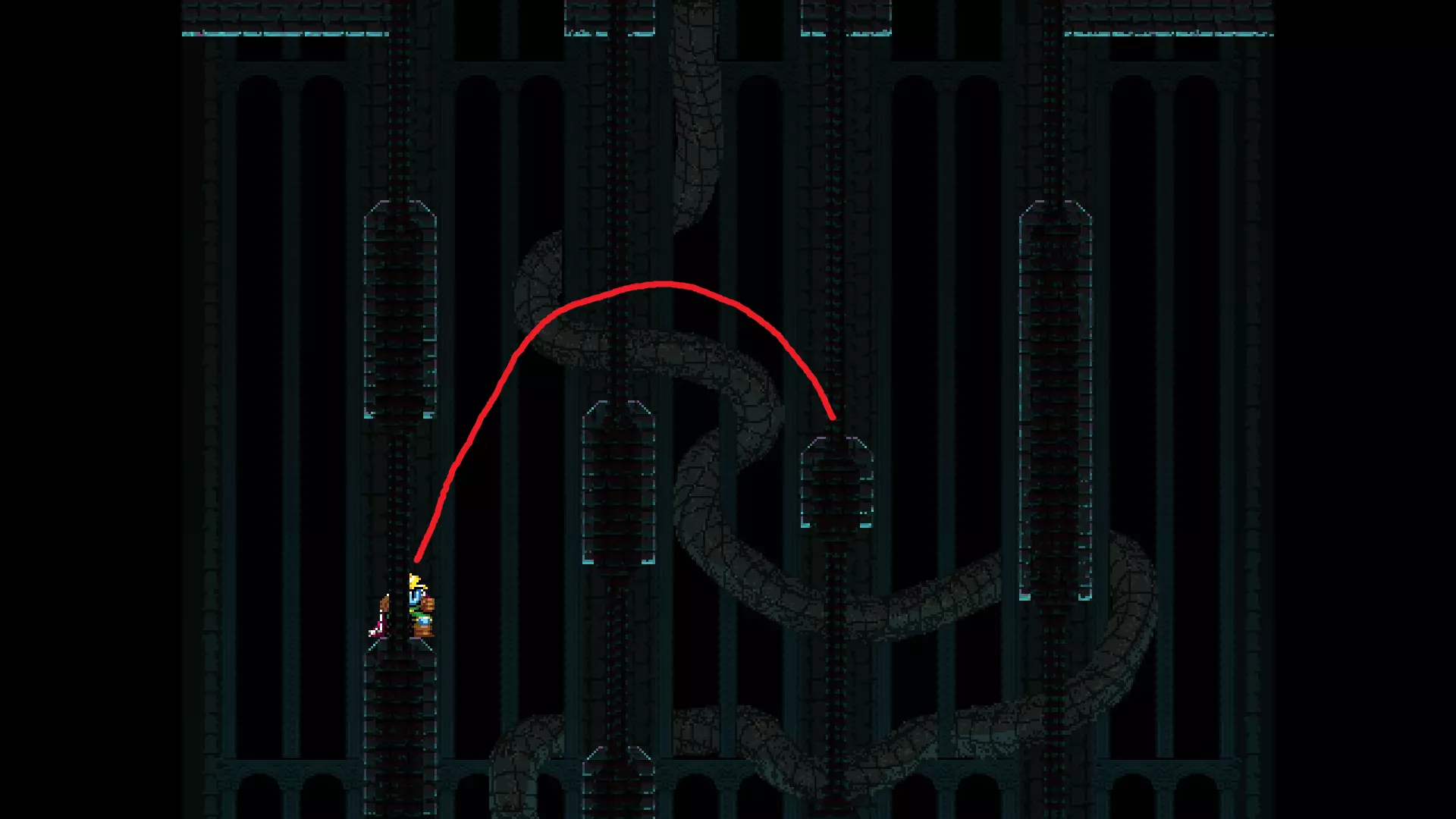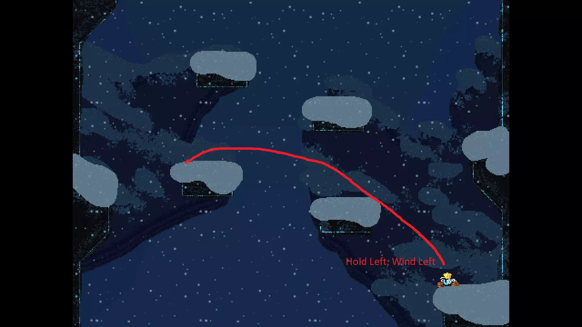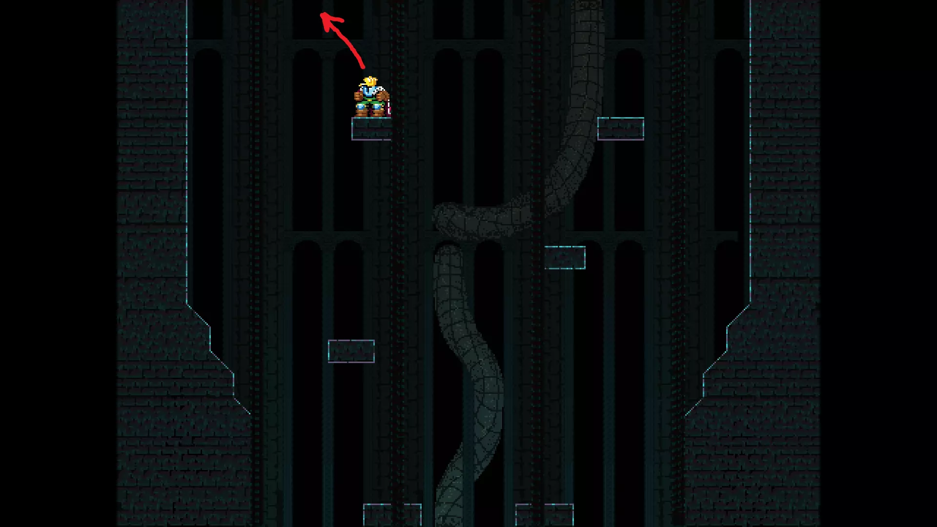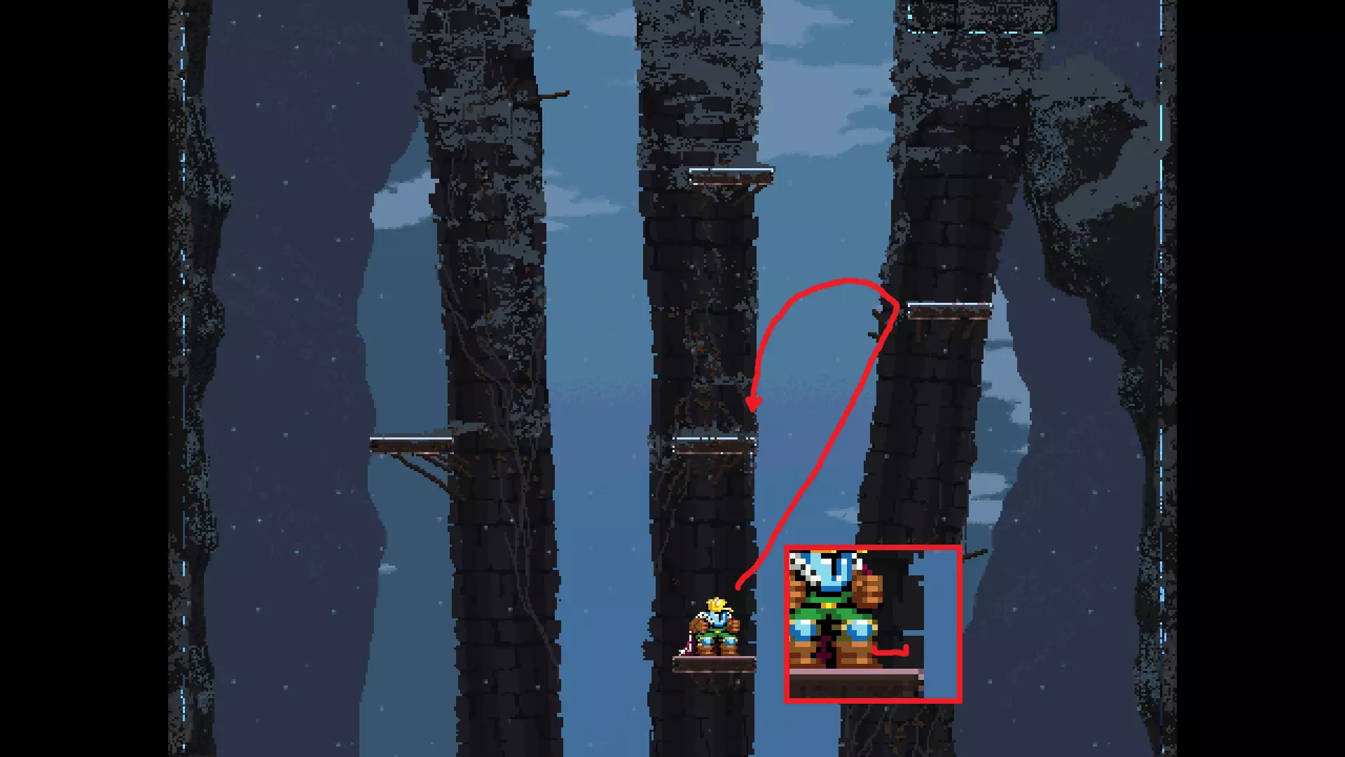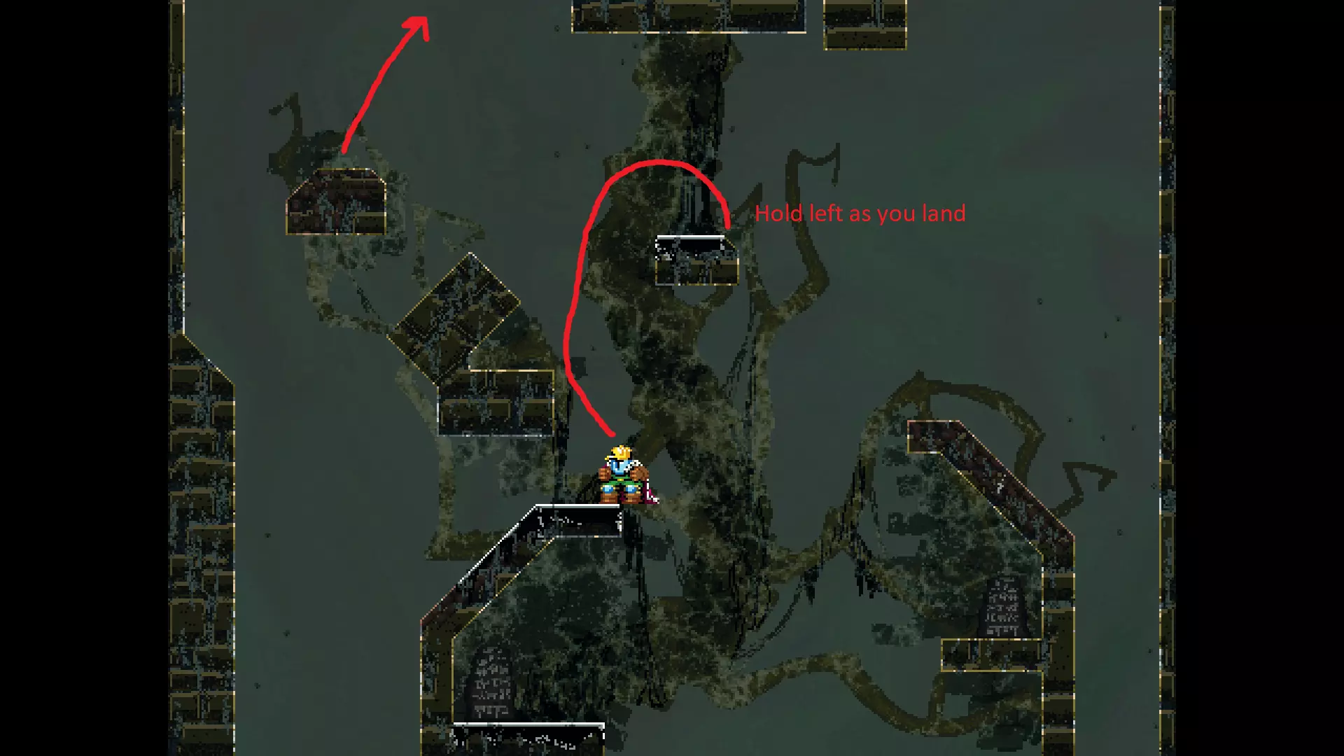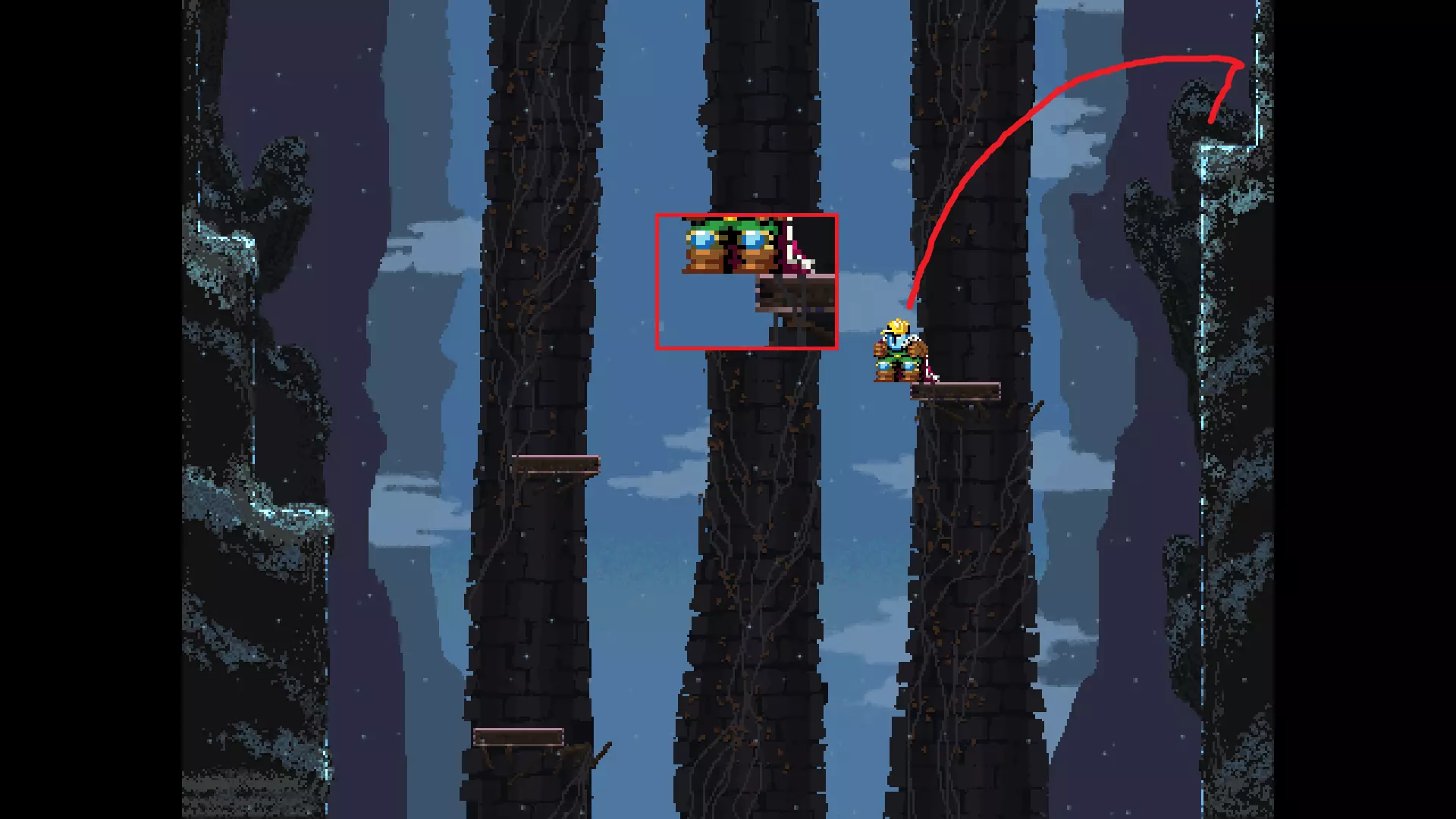 请注意,以下跳跃需要【亚像素级】的精准操作。即使你处于这个精确像素位置,也可能无法成功,除非你使用蛇形戒指稍微向右移动,确保自己处于正确的亚像素位置。