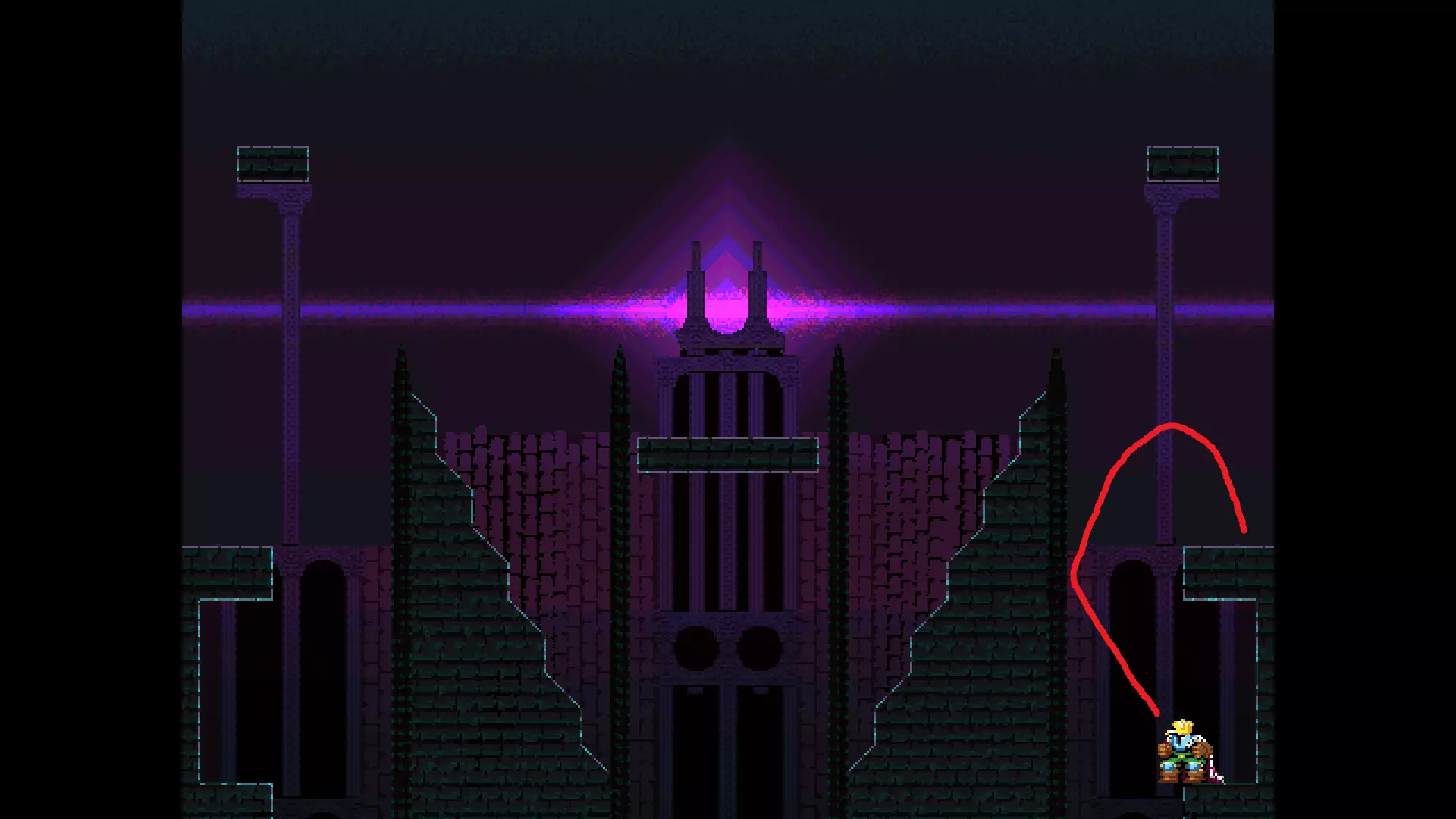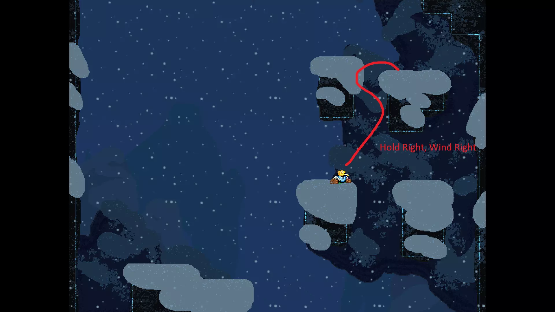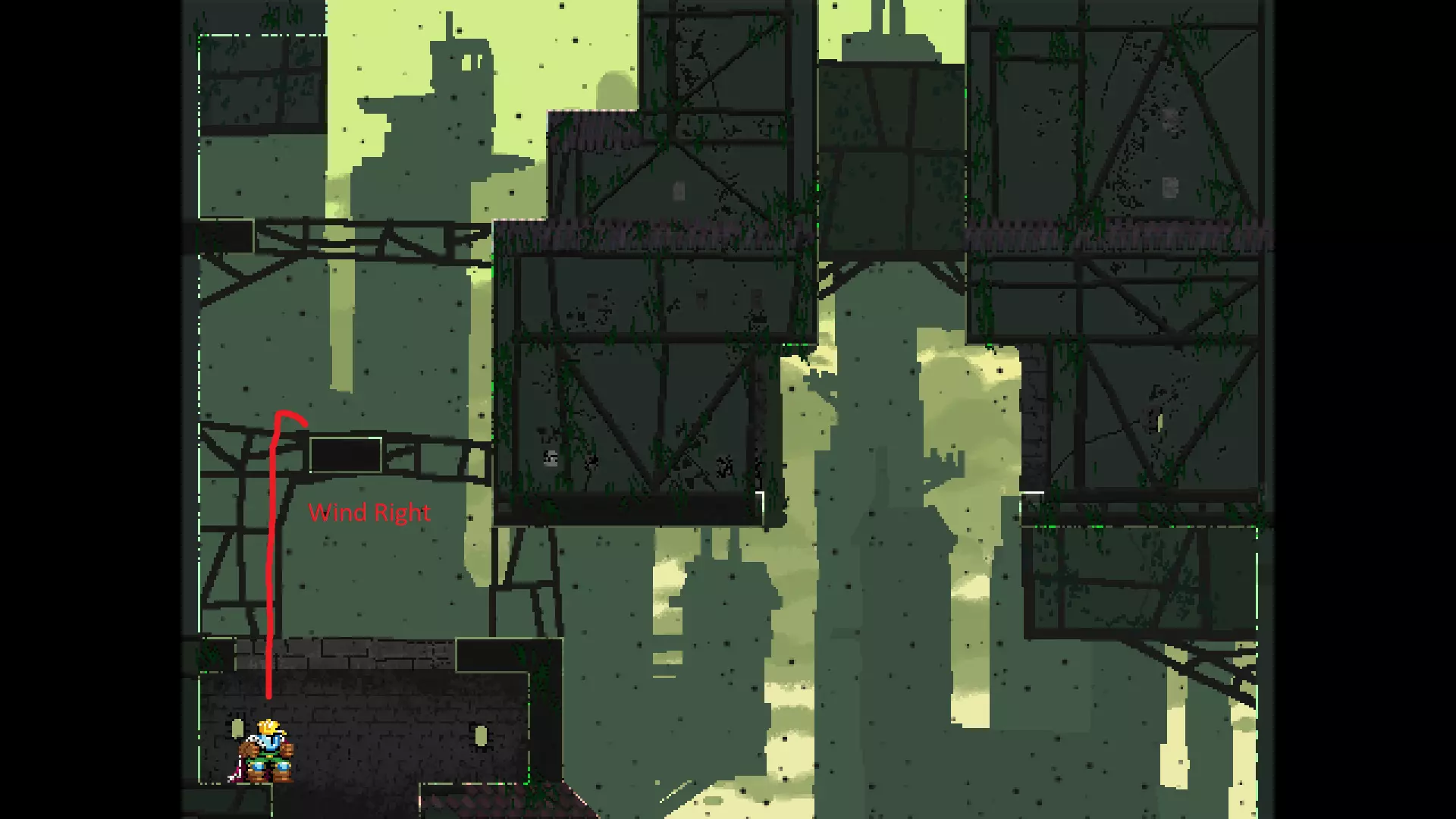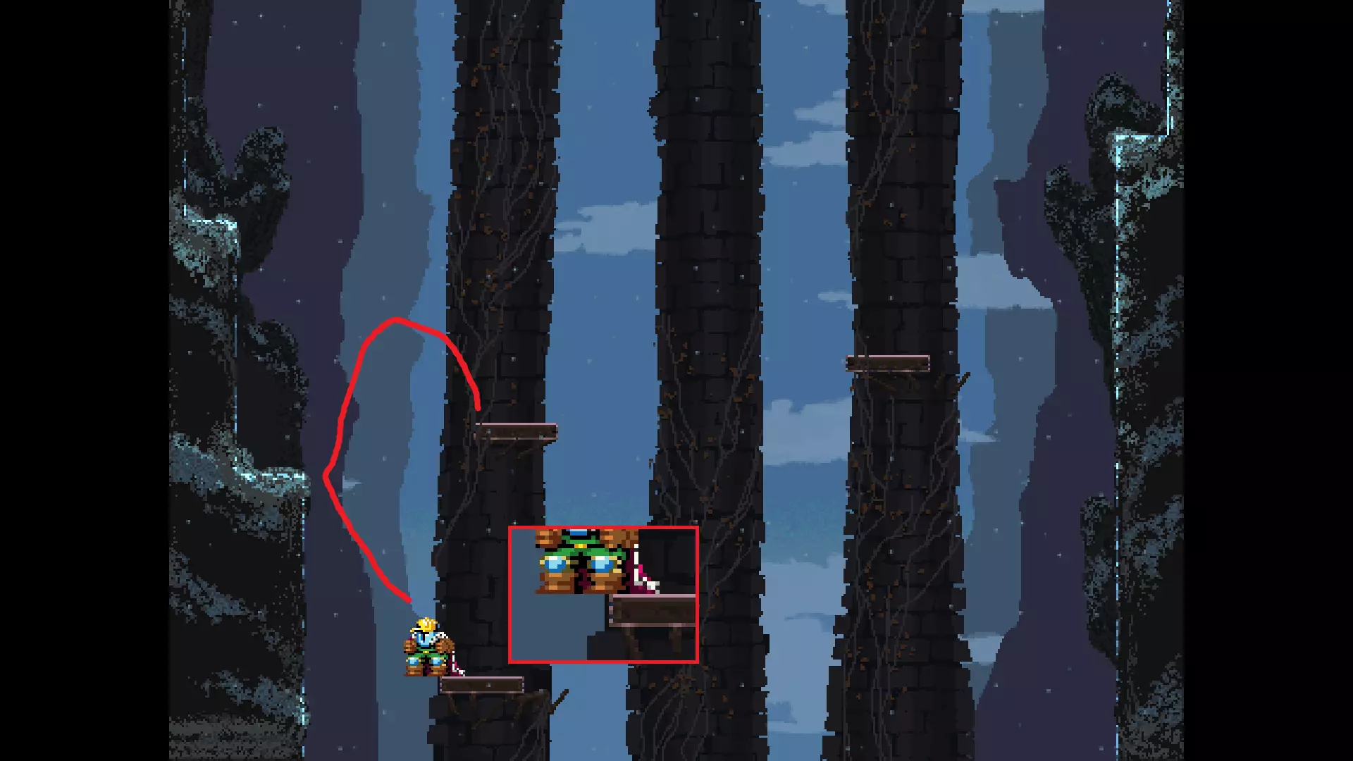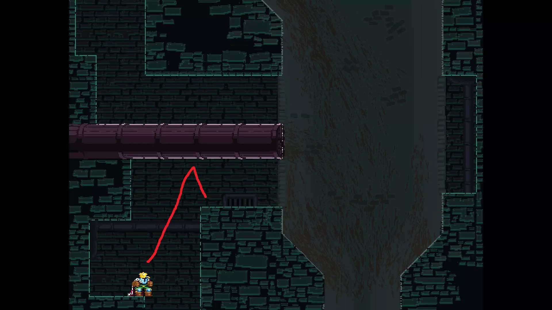 请注意,以下跳跃需要【亚像素级】的精准操作。即使你处于这个精确像素位置,也可能无法成功,除非你使用蛇形戒指稍微向右移动,确保自己处于正确的亚像素位置。