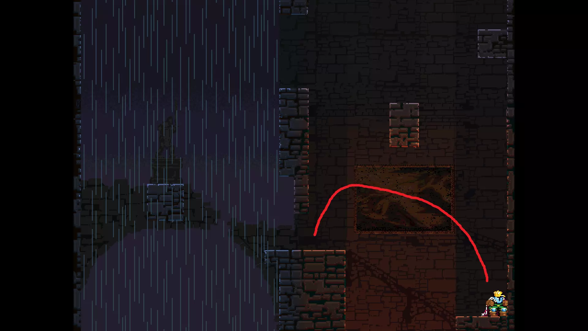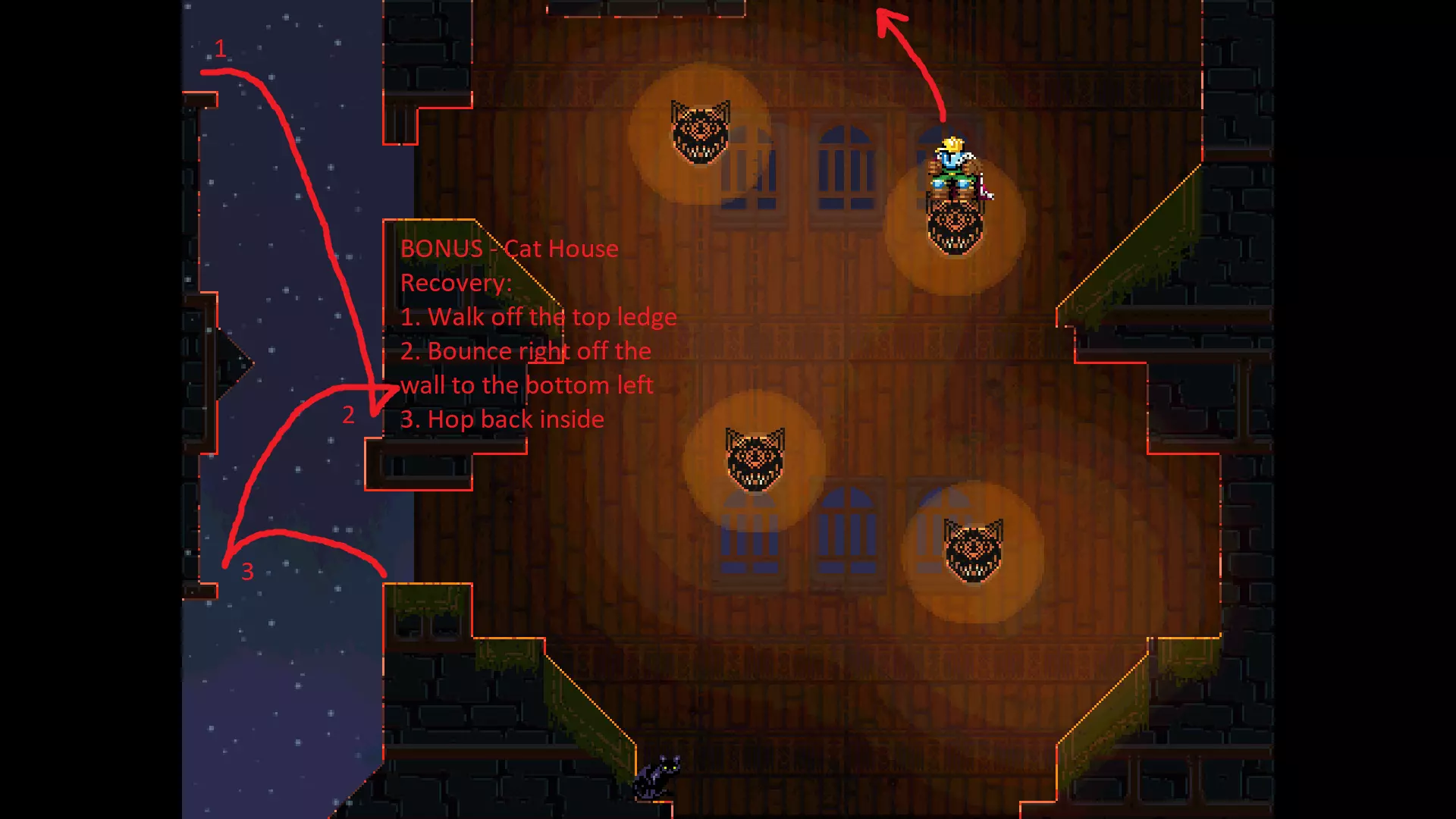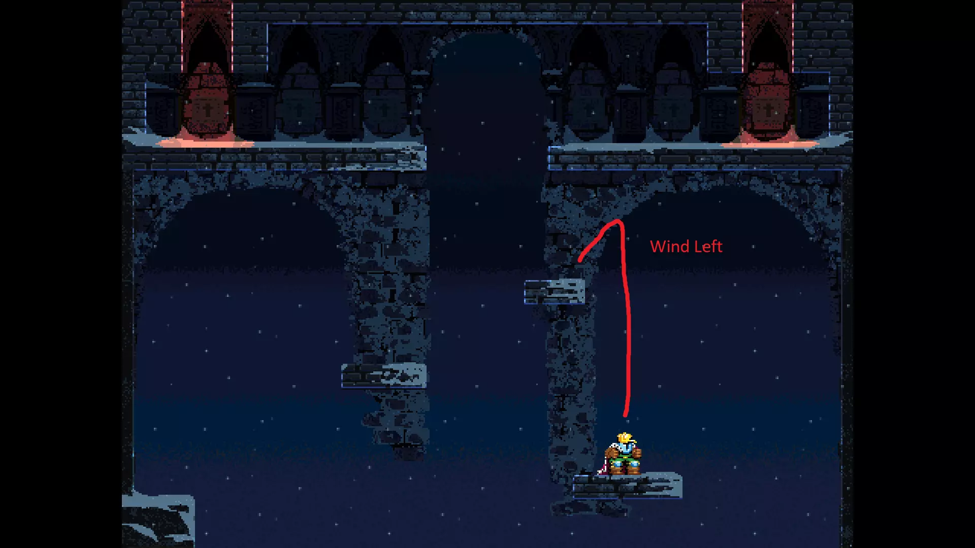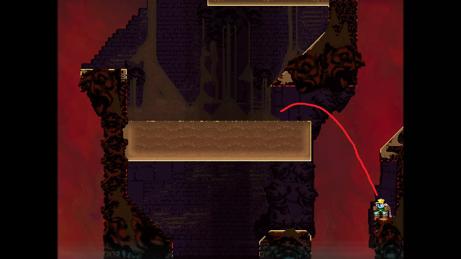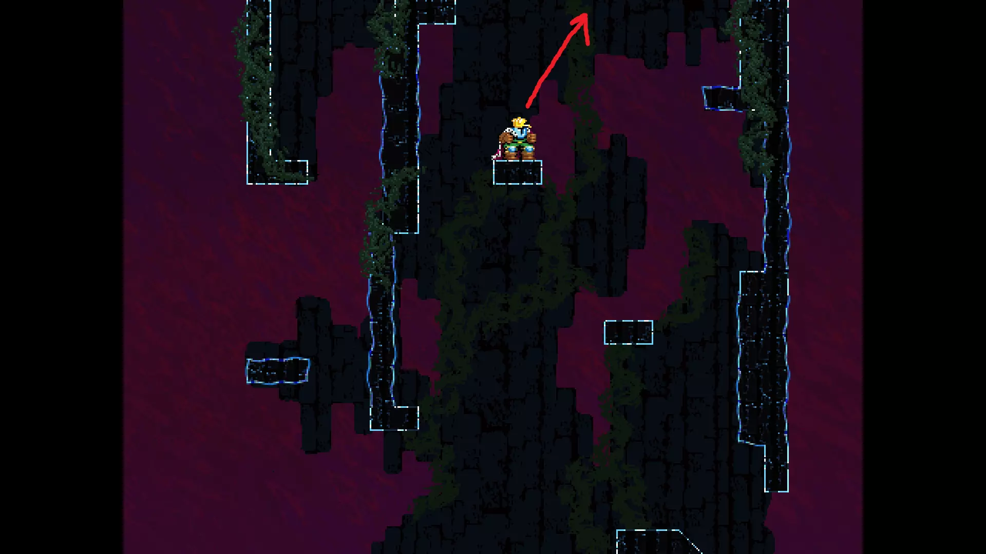 请注意,以下跳跃需要【亚像素级】的精准操作。即使你处于这个精确像素位置,也可能无法成功,除非你使用蛇形戒指稍微向右移动,确保自己处于正确的亚像素位置。