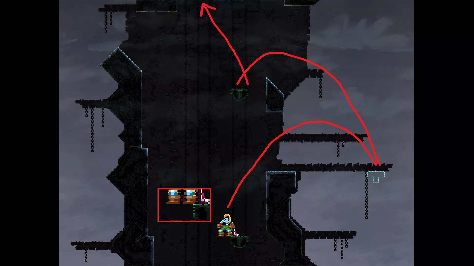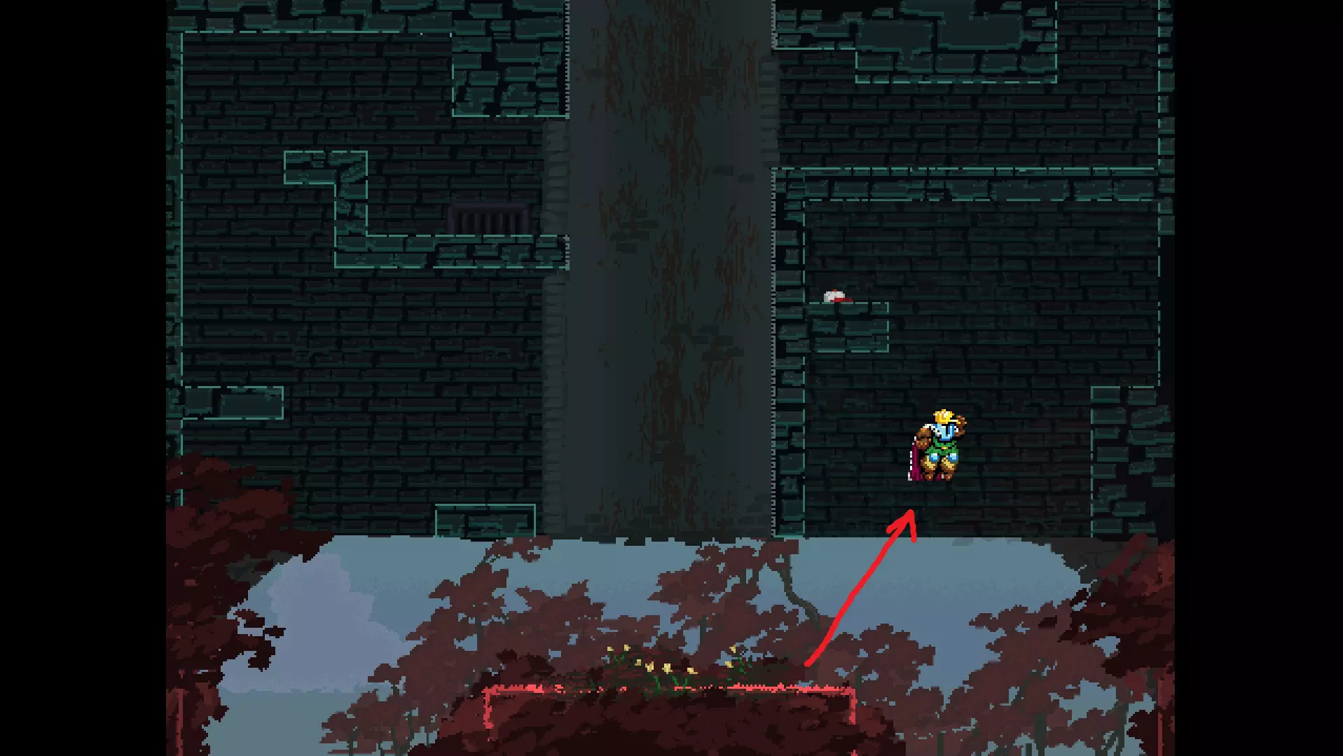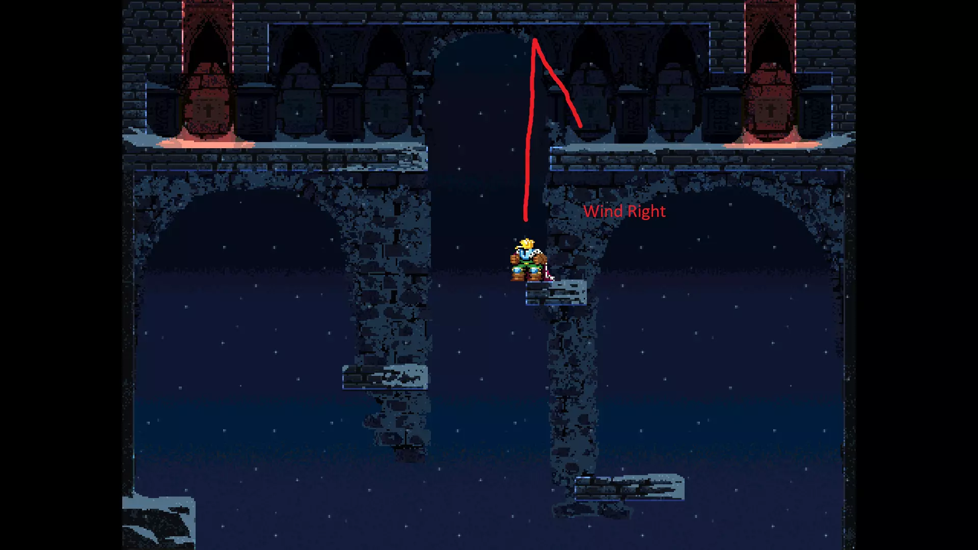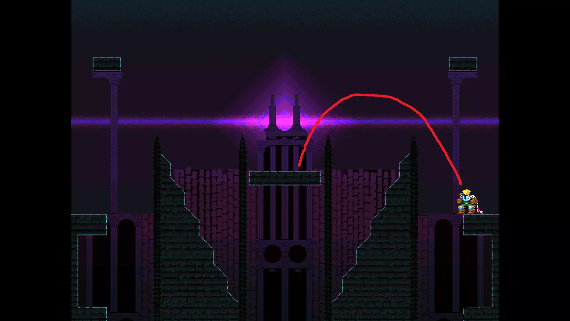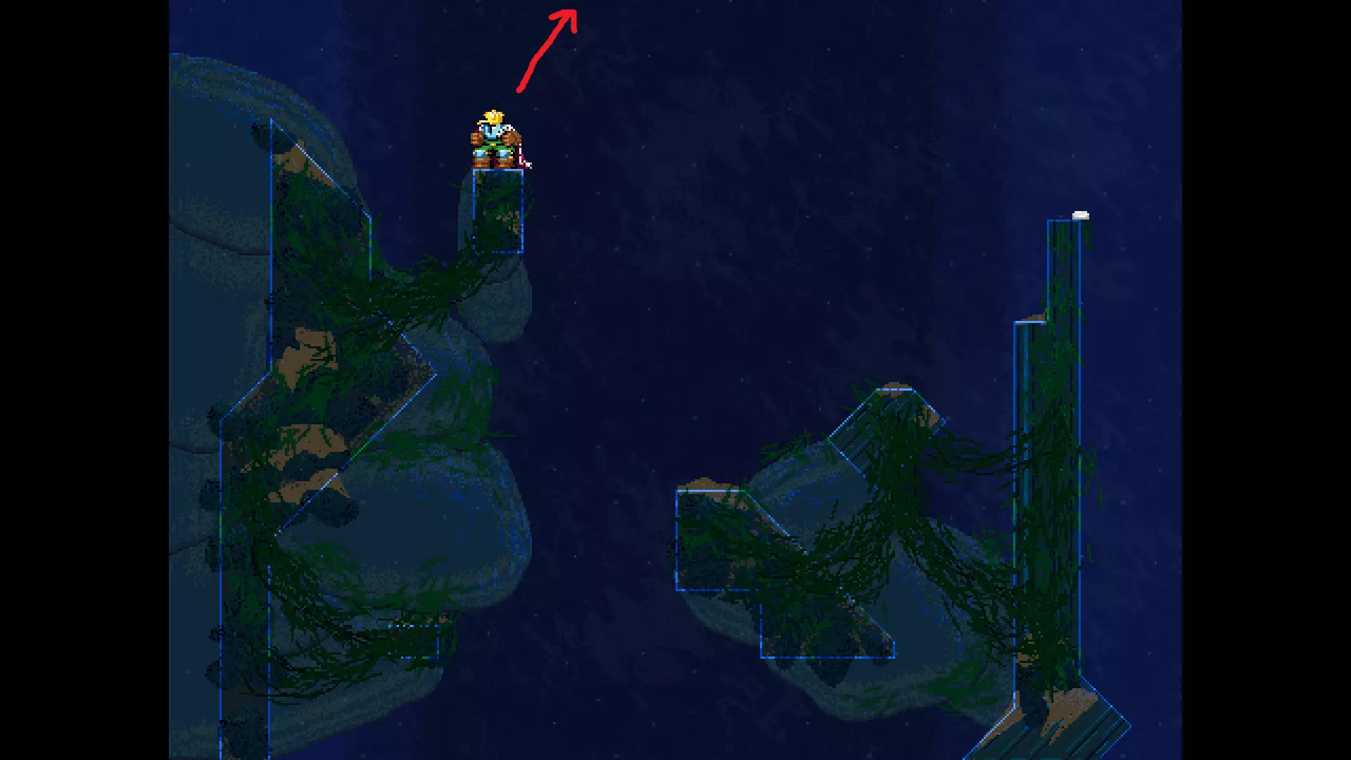请注意,以下跳跃需要【亚像素级】的精准操作。即使你处于这个精确像素位置,也可能无法成功,除非你使用蛇形戒指稍微向右移动,确保自己处于正确的亚像素位置。