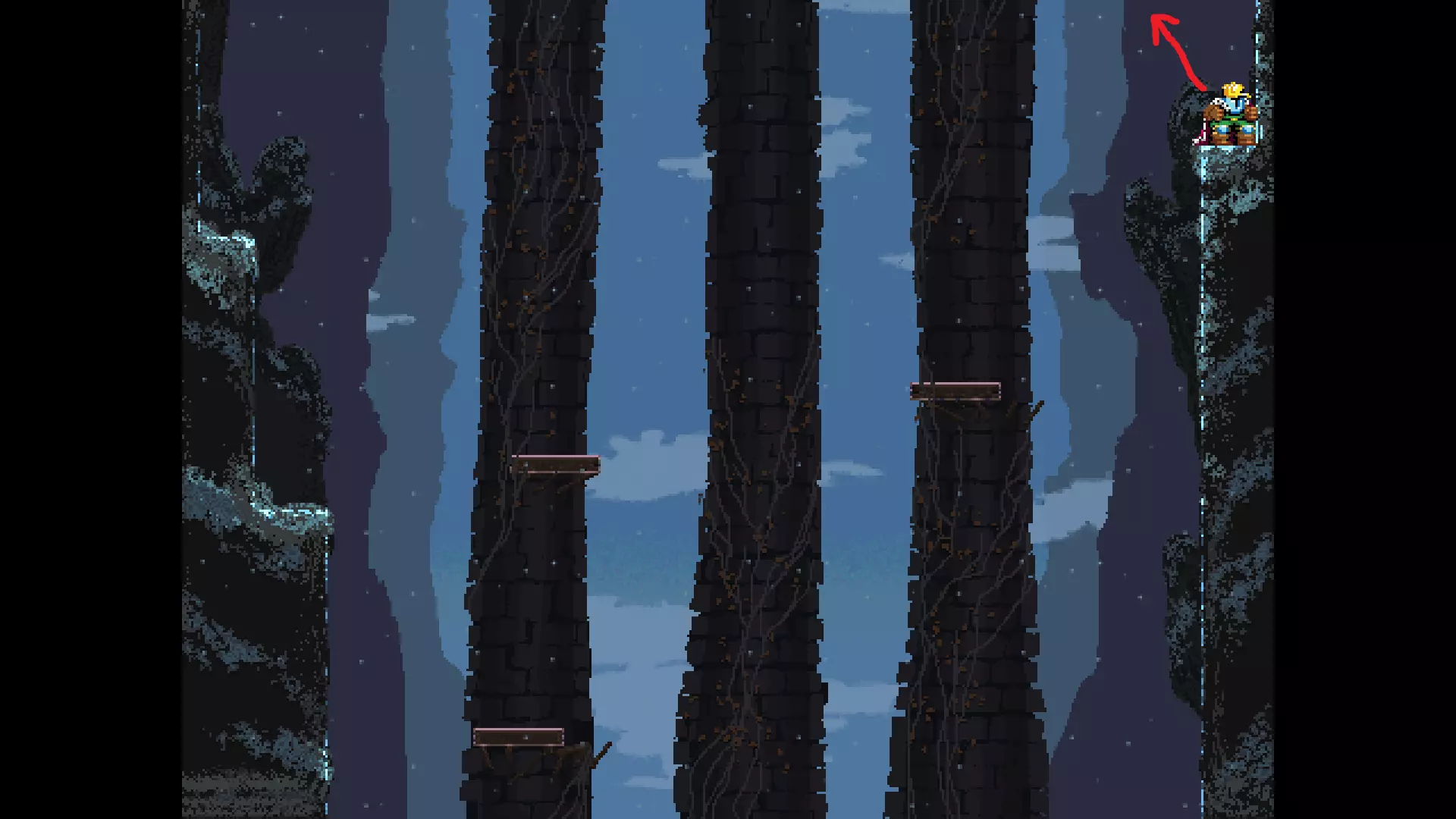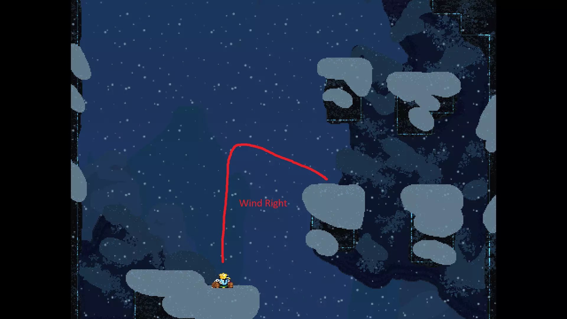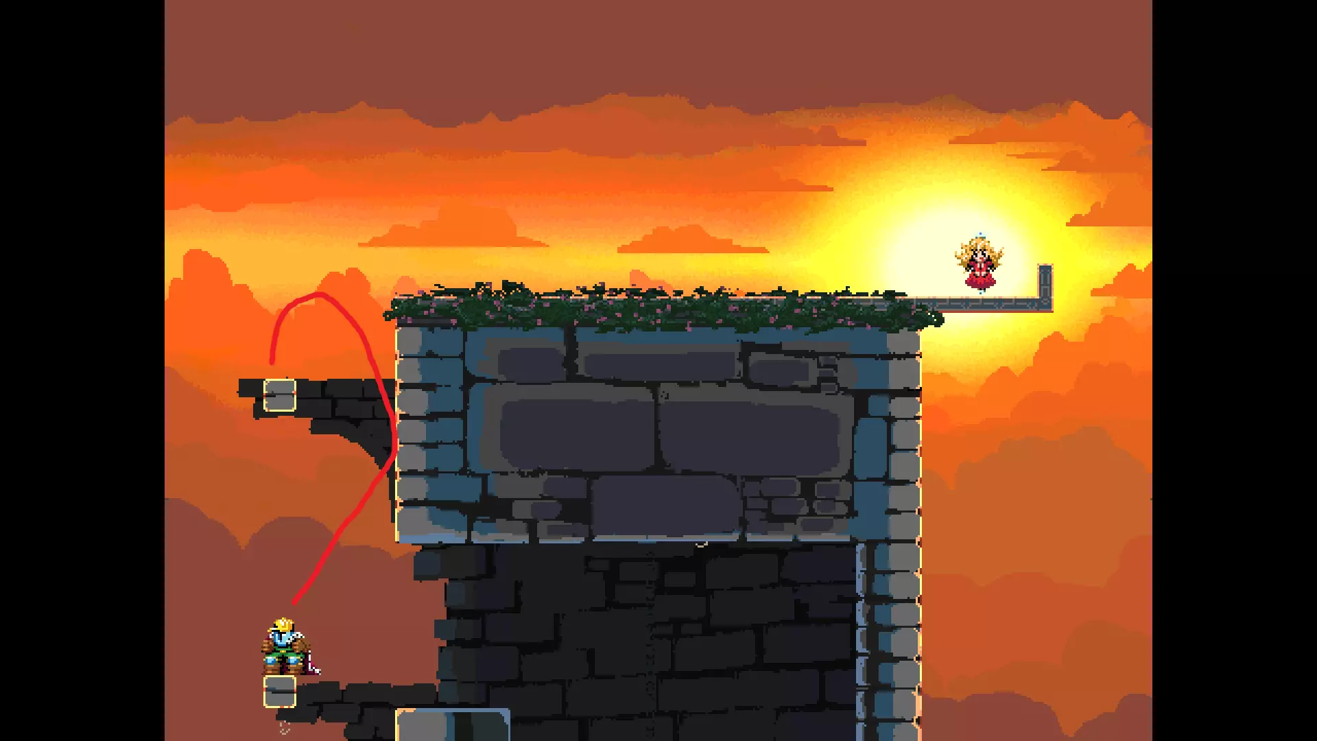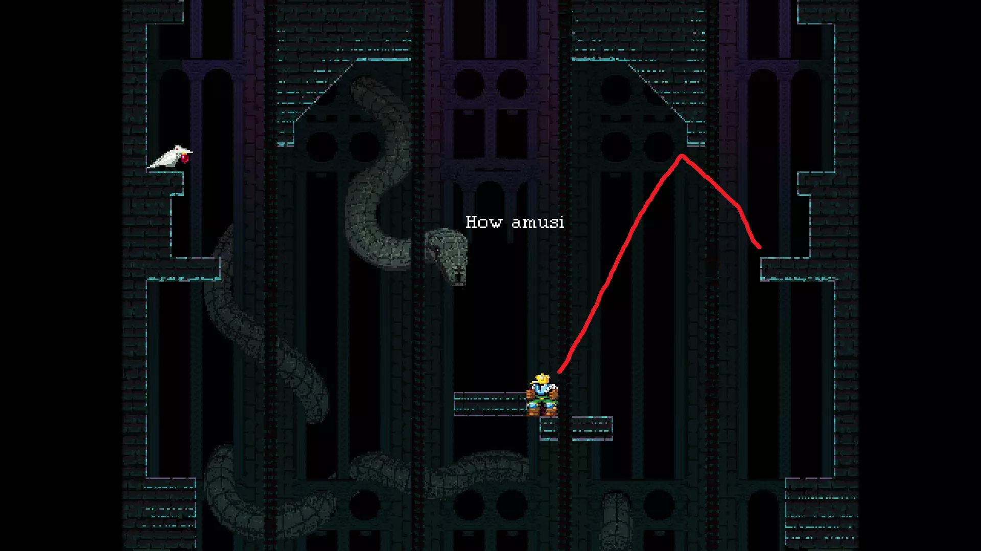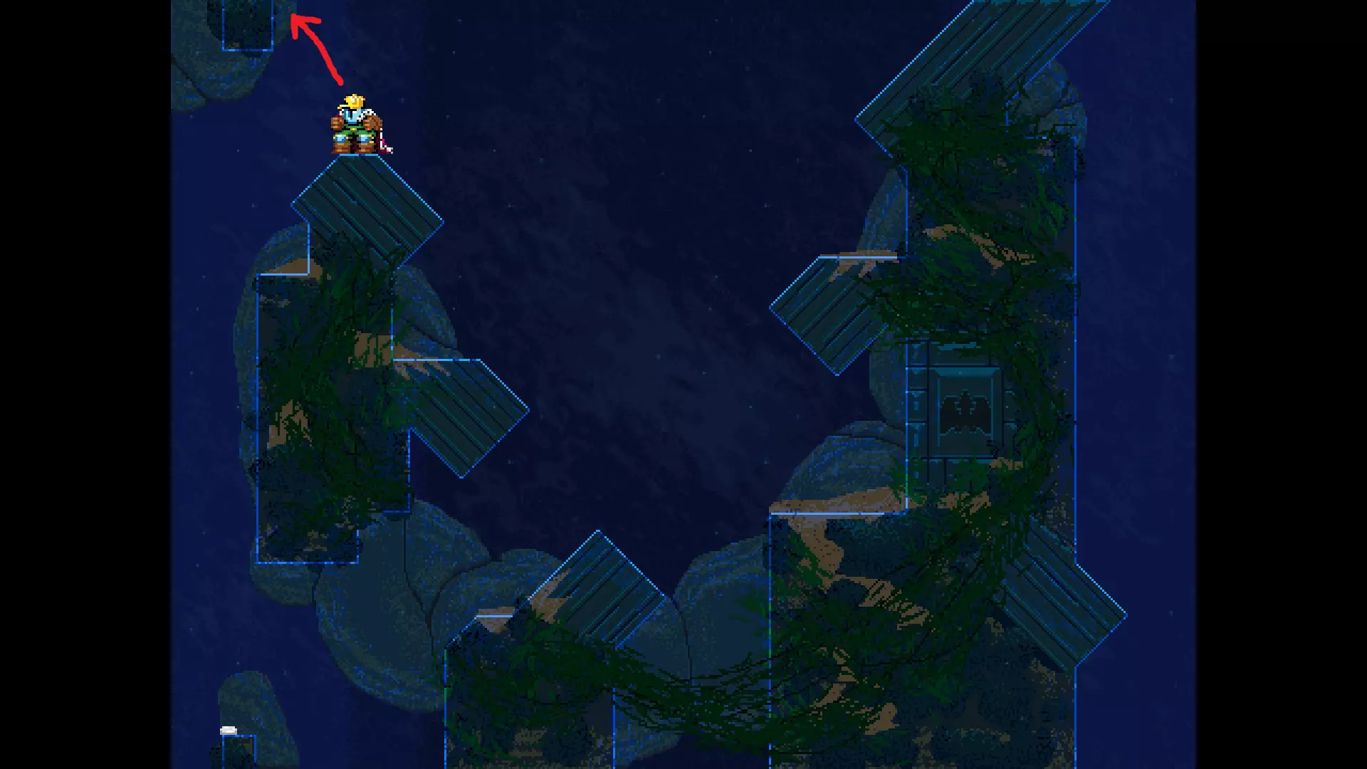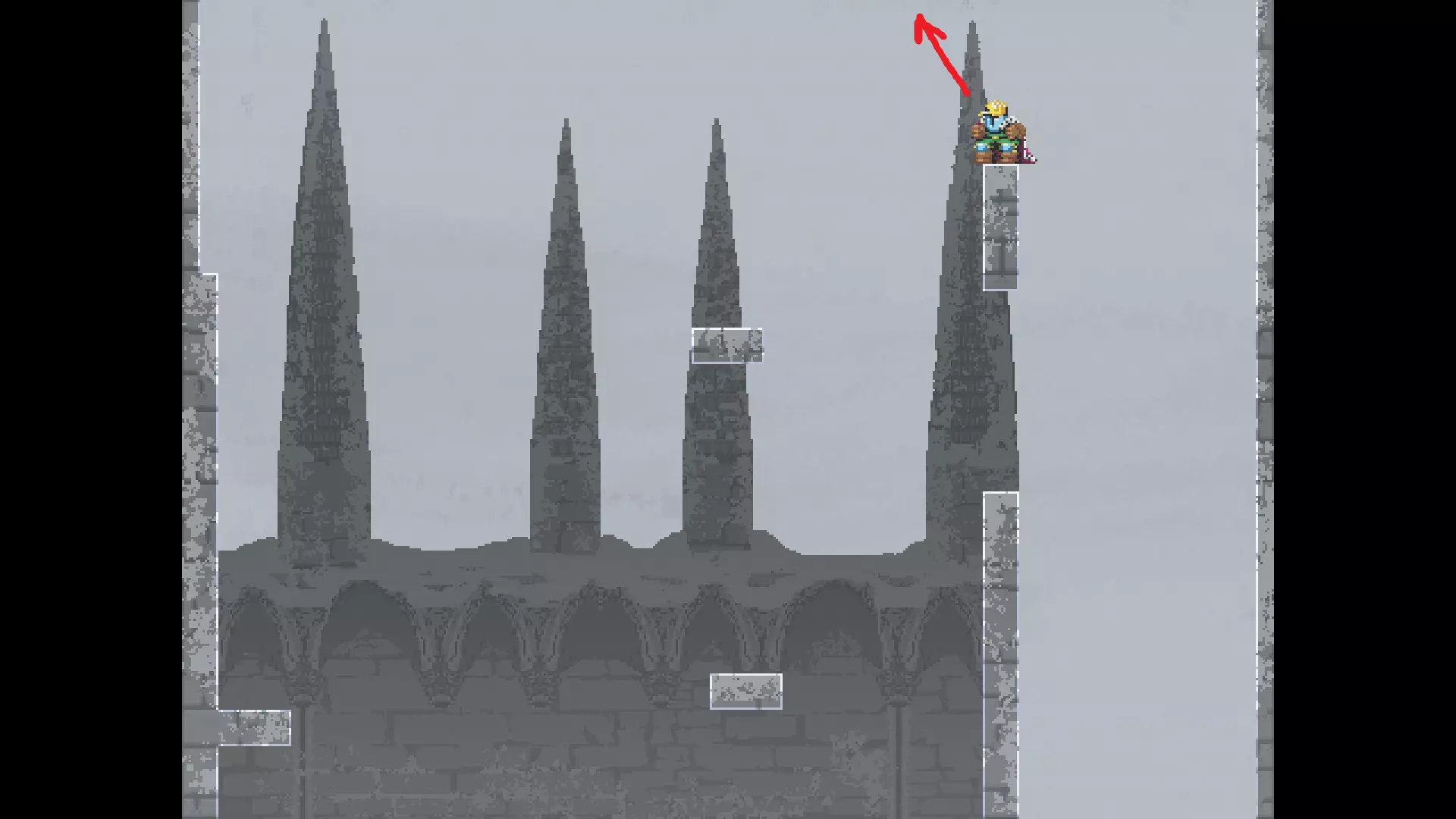 请注意,以下跳跃需要【亚像素级】的精准操作。即使你处于这个精确像素位置,也可能无法成功,除非你使用蛇形戒指稍微向右移动,确保自己处于正确的亚像素位置。