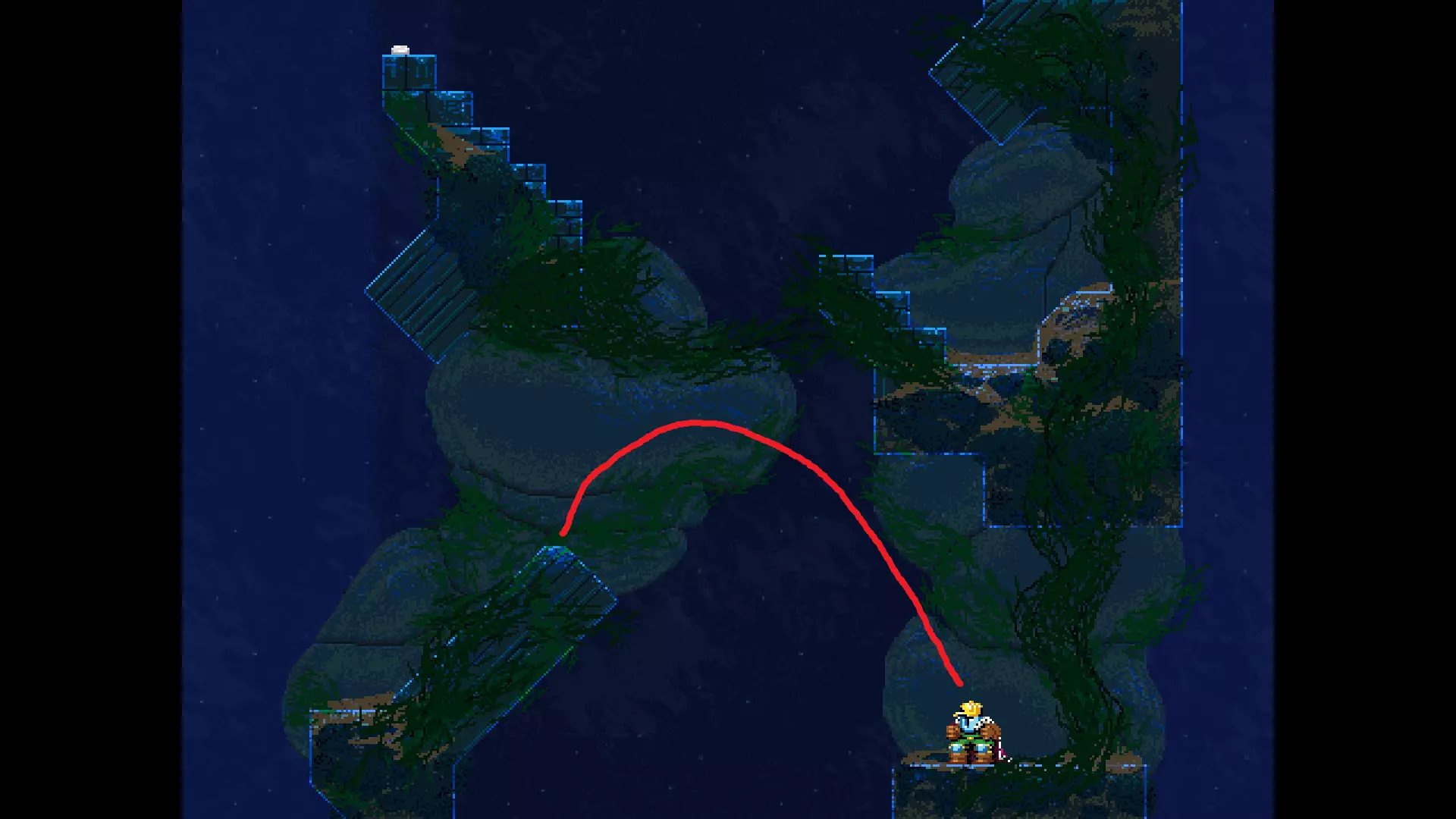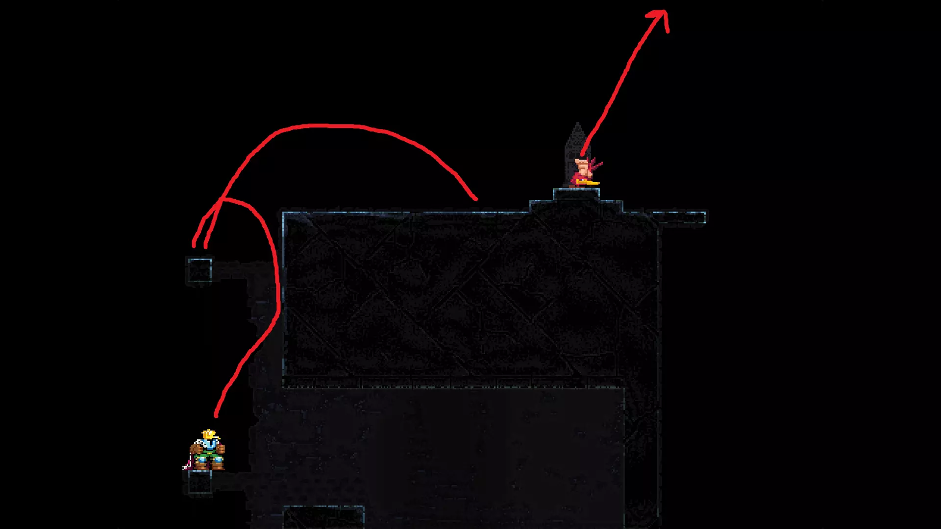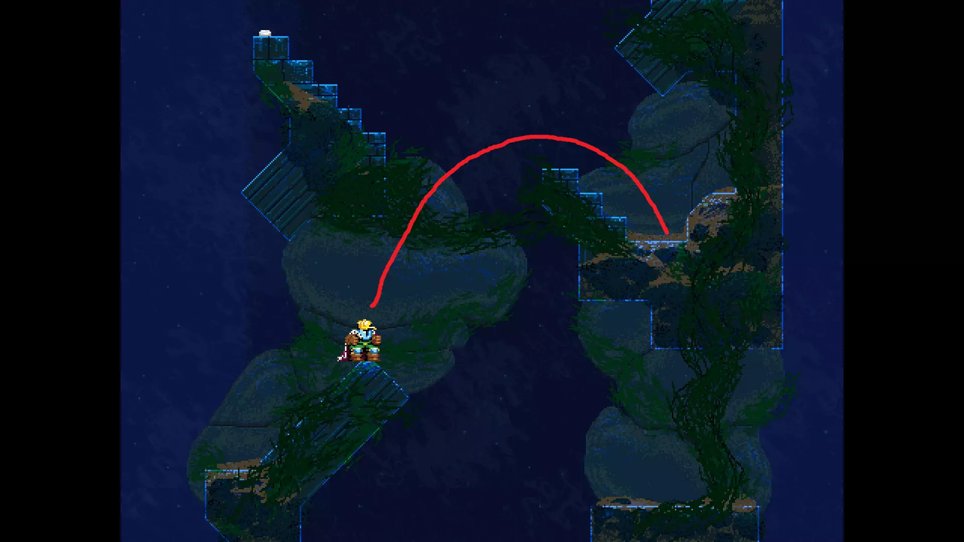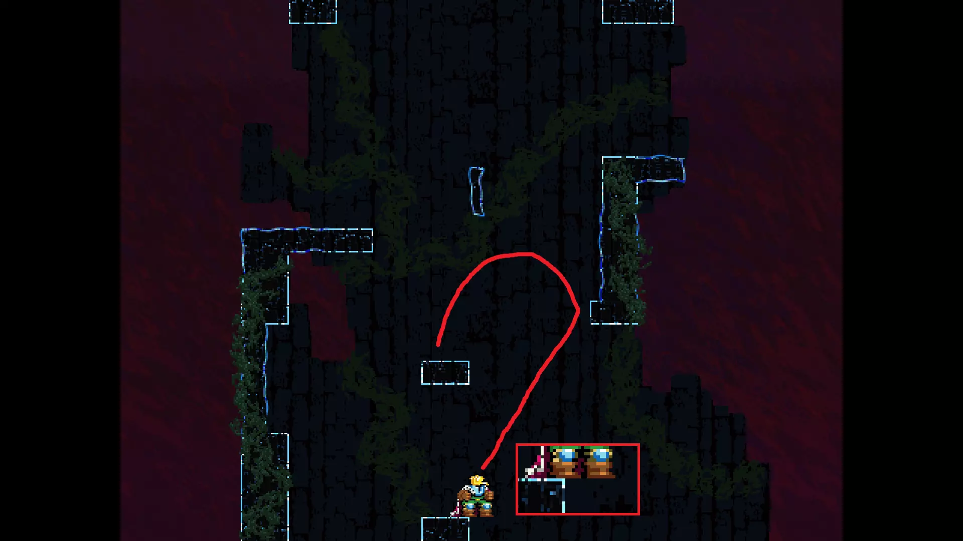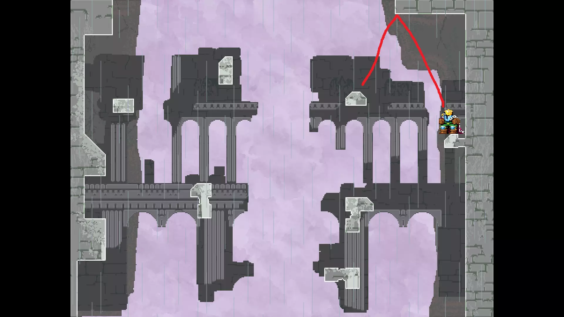 请注意,以下跳跃需要【亚像素级】的精准操作。即使你处于这个精确像素位置,也可能无法成功,除非你使用蛇形戒指稍微向右移动,确保自己处于正确的亚像素位置。