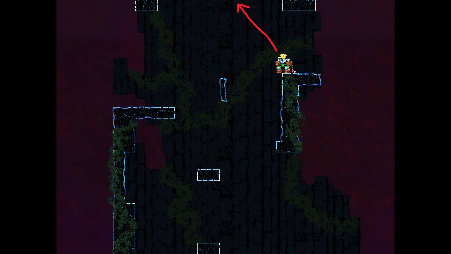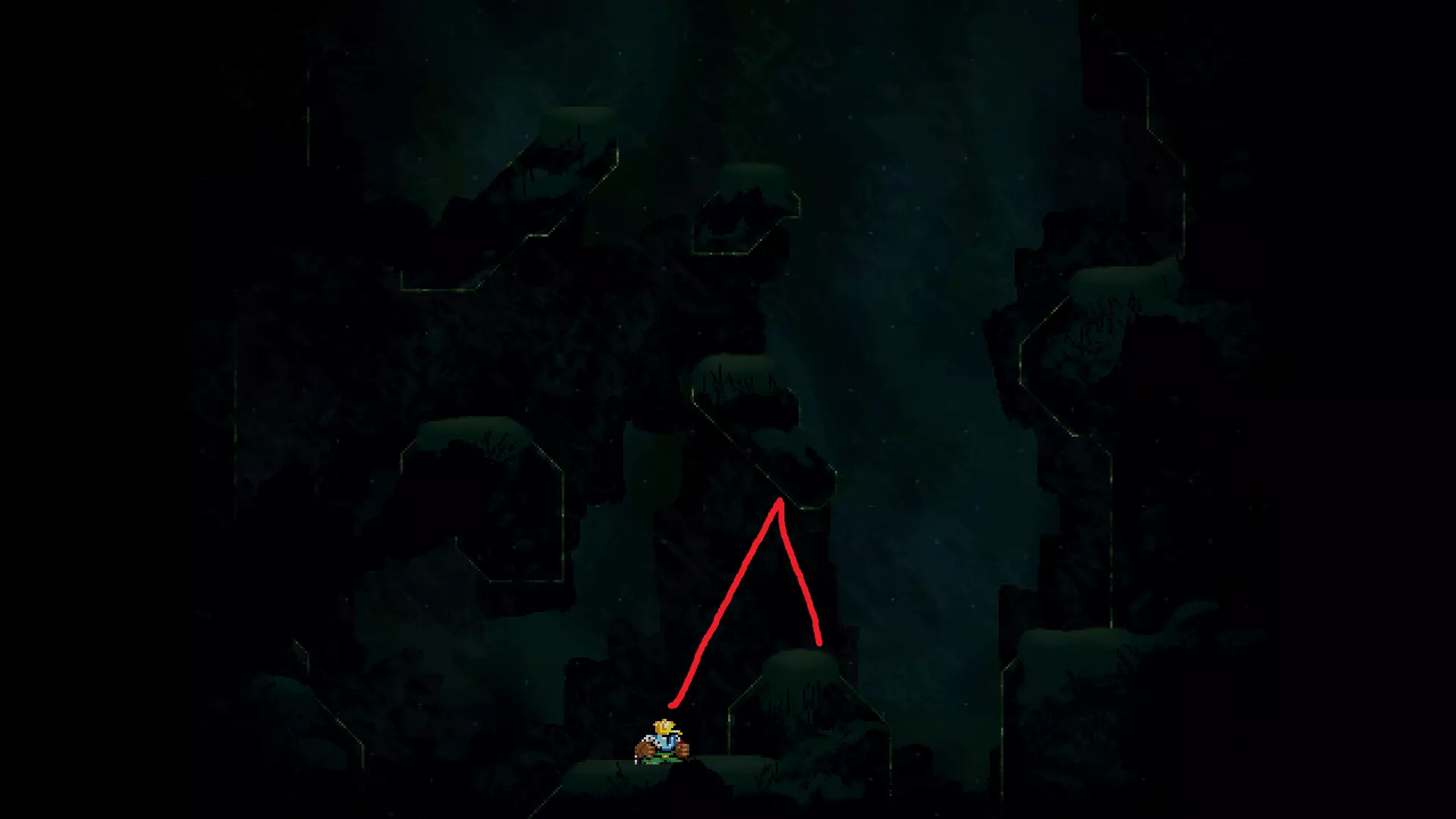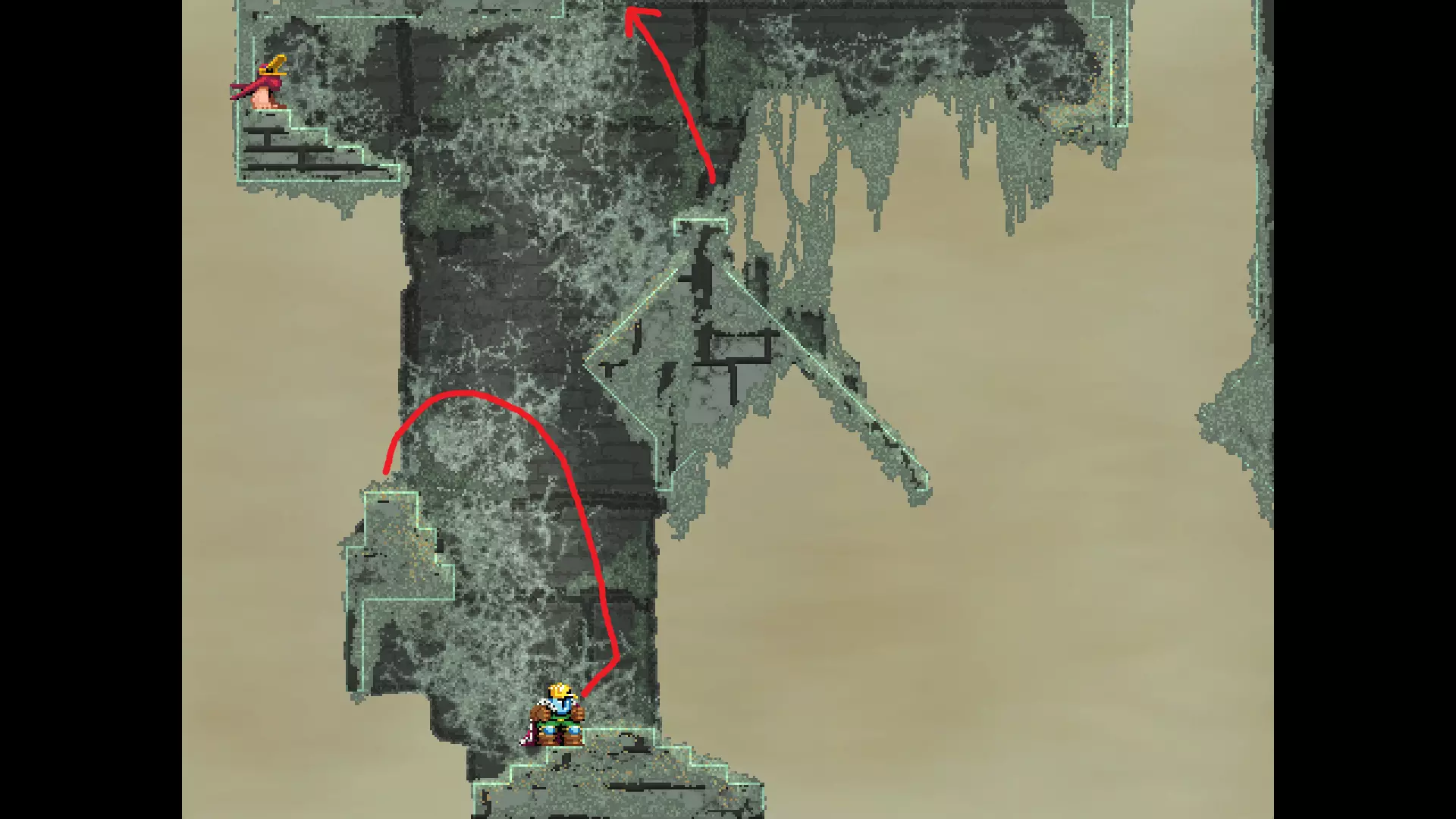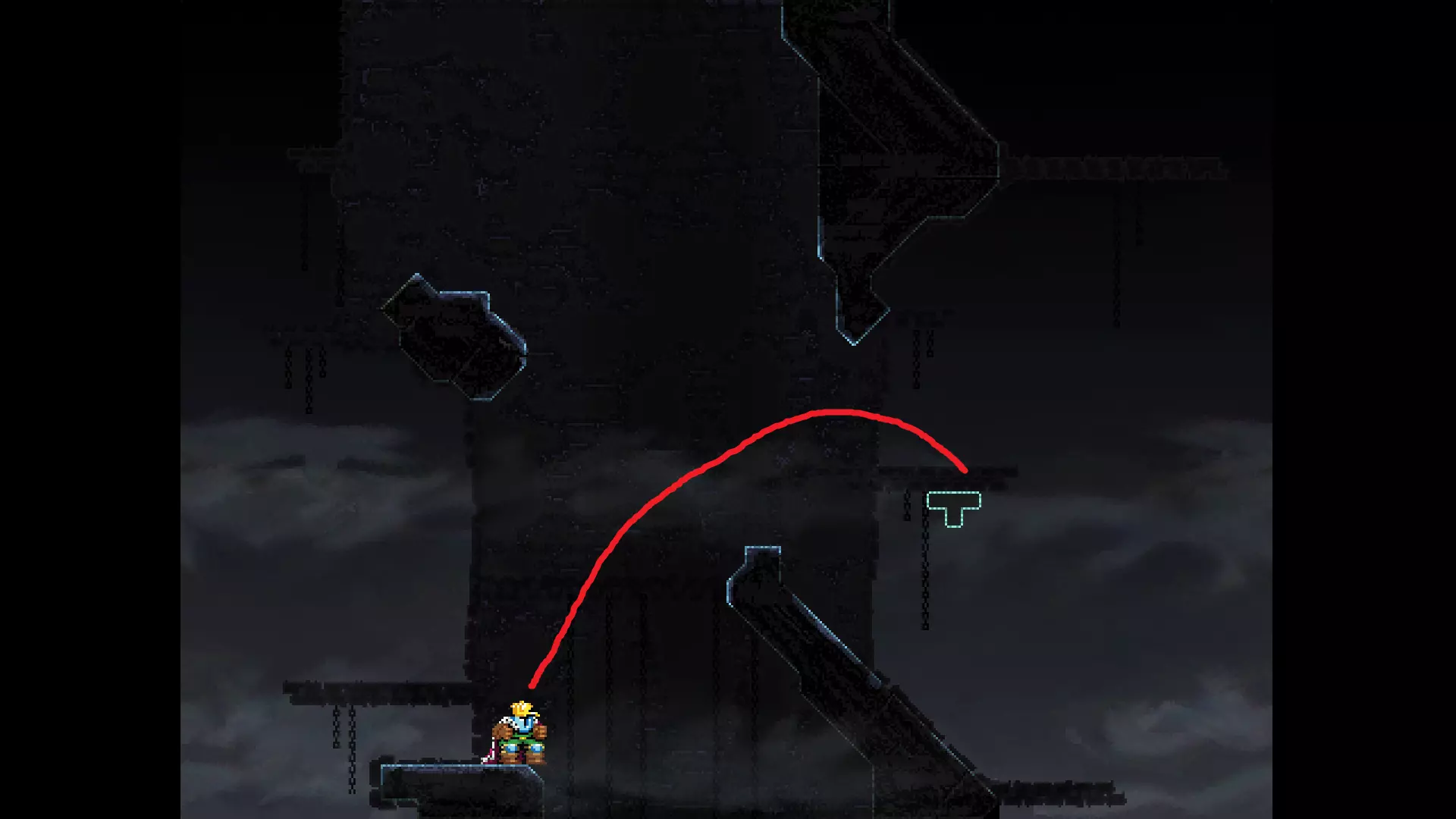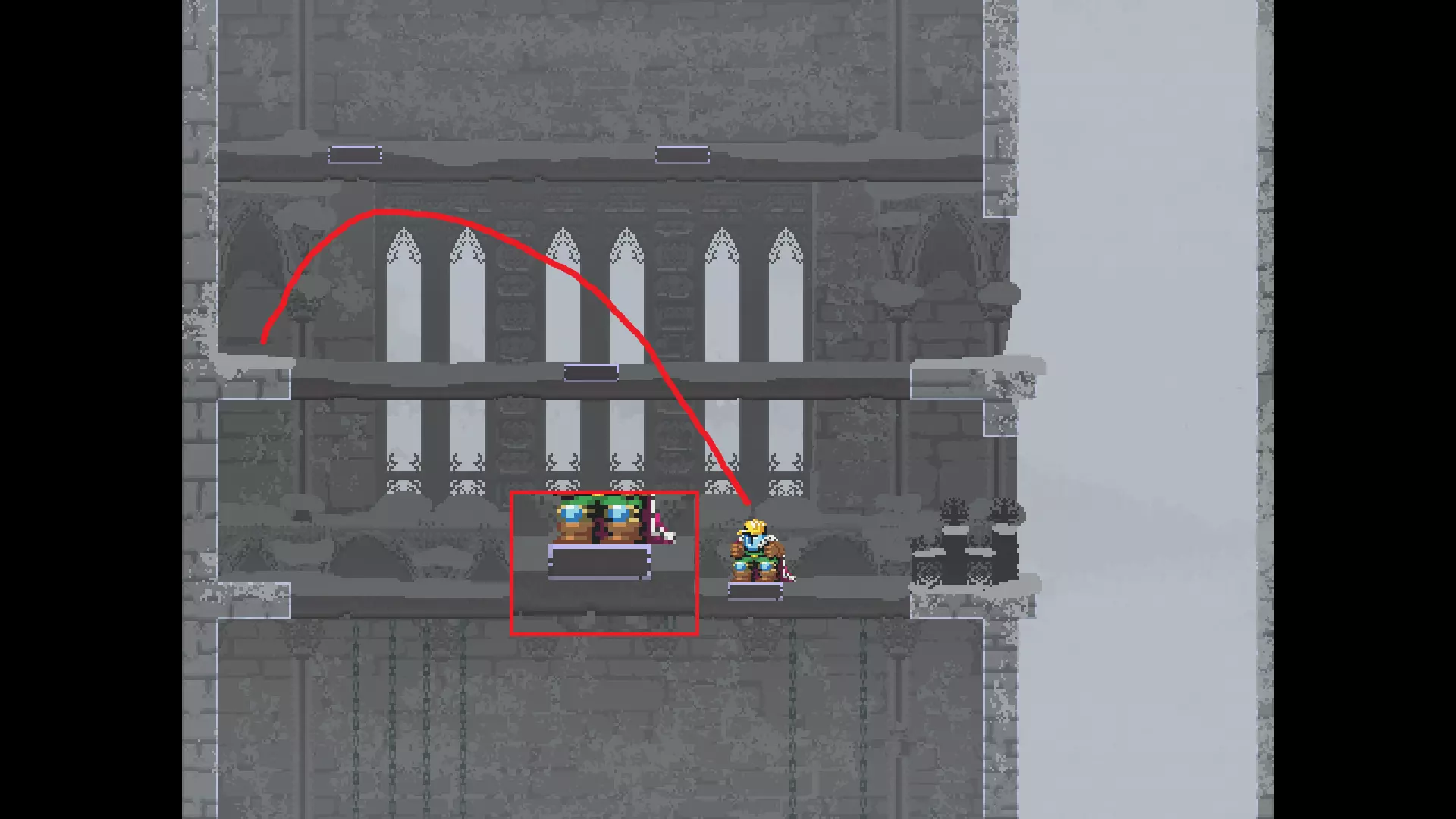 请注意,以下跳跃需要【亚像素级】的精准操作。即使你处于这个精确像素位置,也可能无法成功,除非你使用蛇形戒指稍微向右移动,确保自己处于正确的亚像素位置。