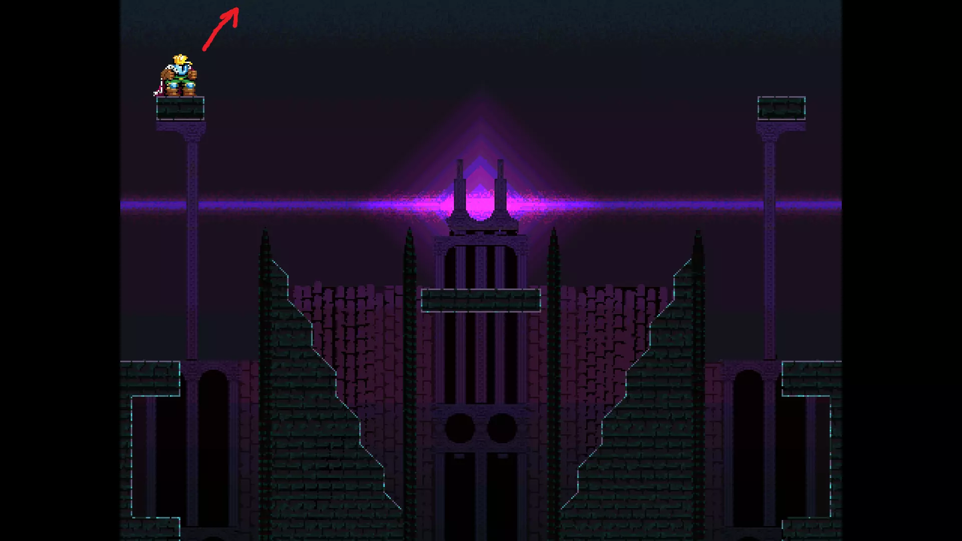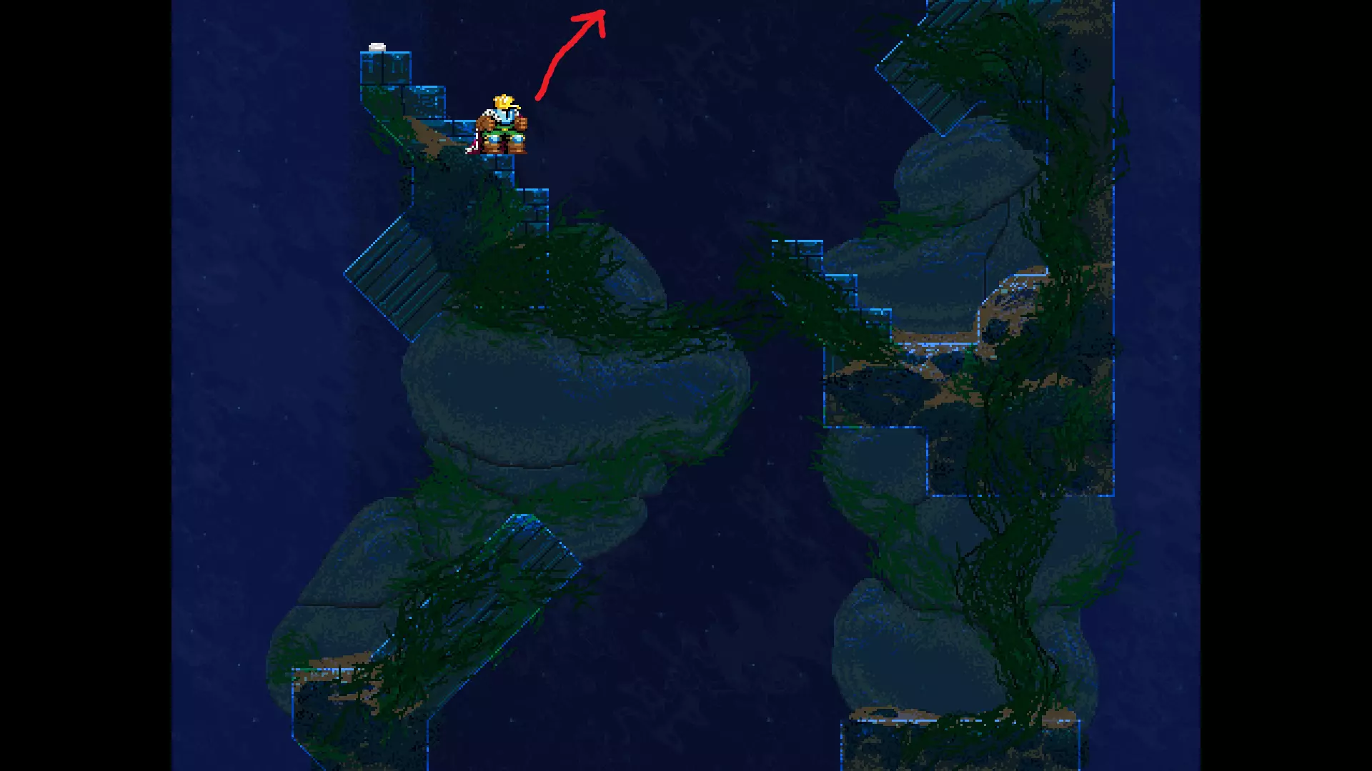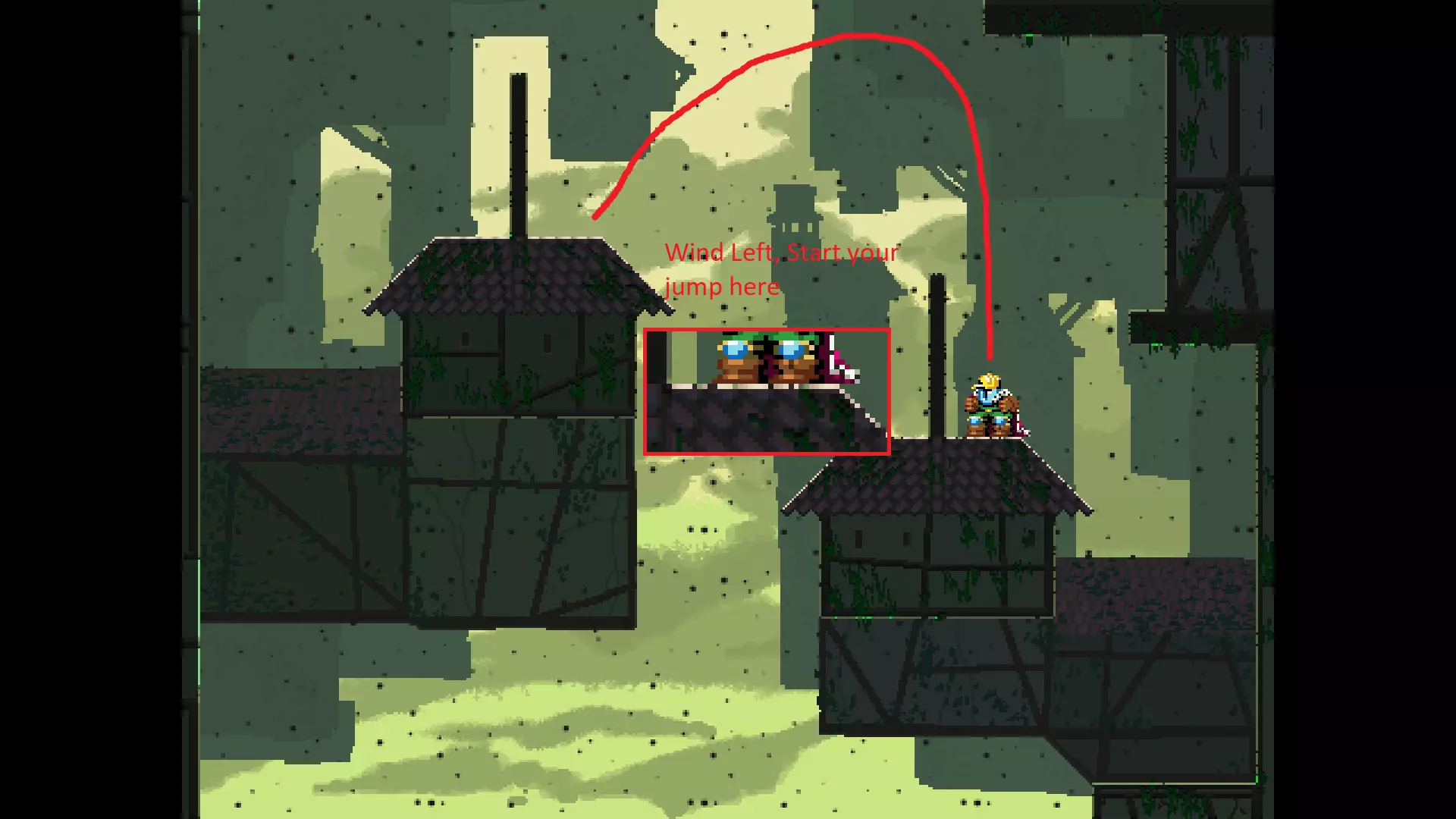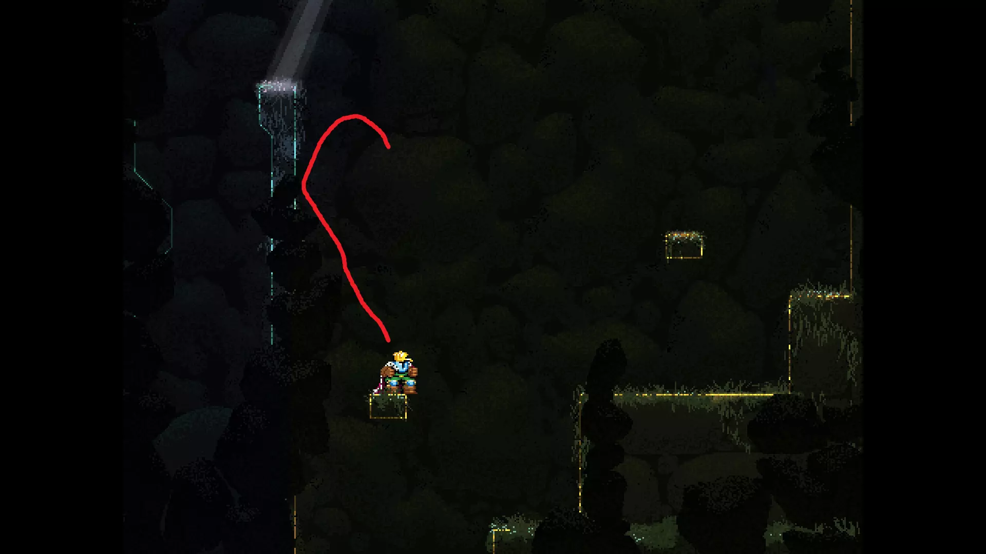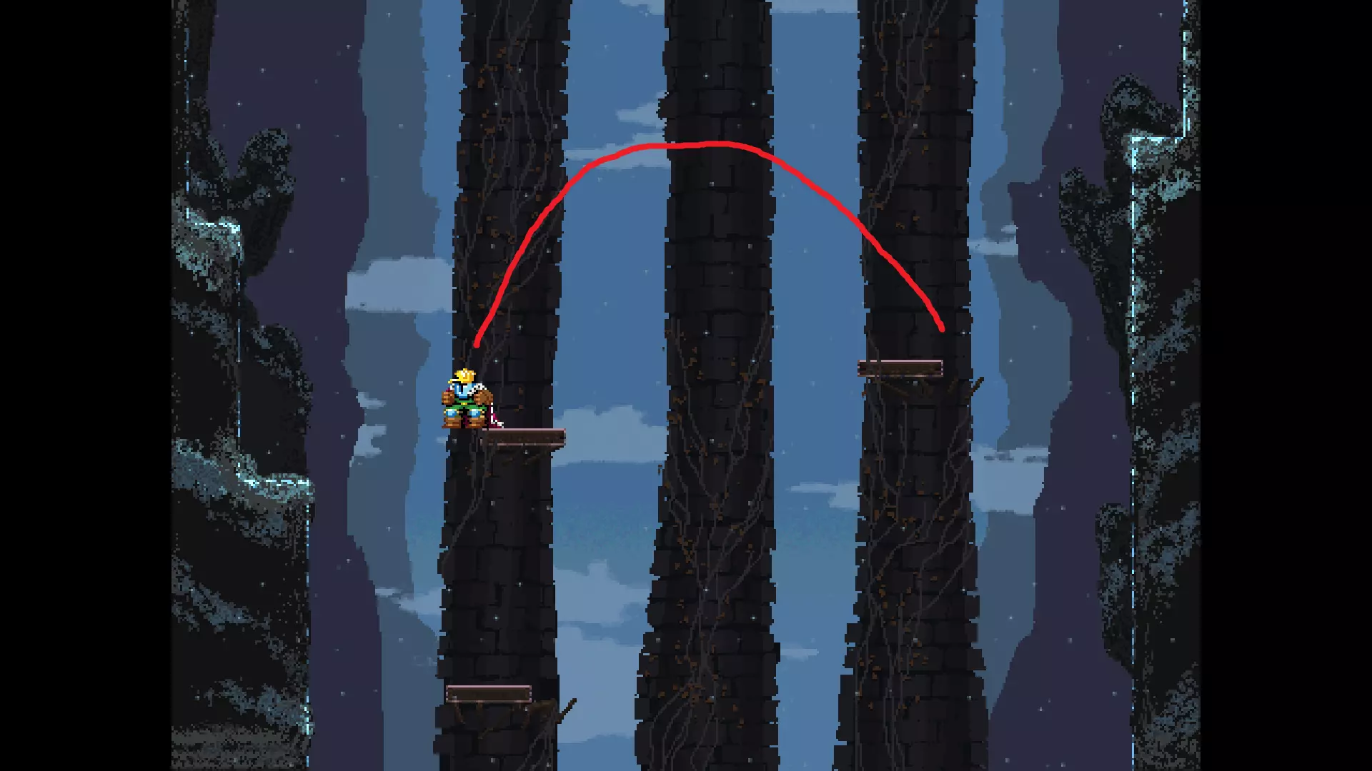 请注意,以下跳跃需要【亚像素级】的精准操作。即使你处于这个精确像素位置,也可能无法成功,除非你使用蛇形戒指稍微向右移动,确保自己处于正确的亚像素位置。