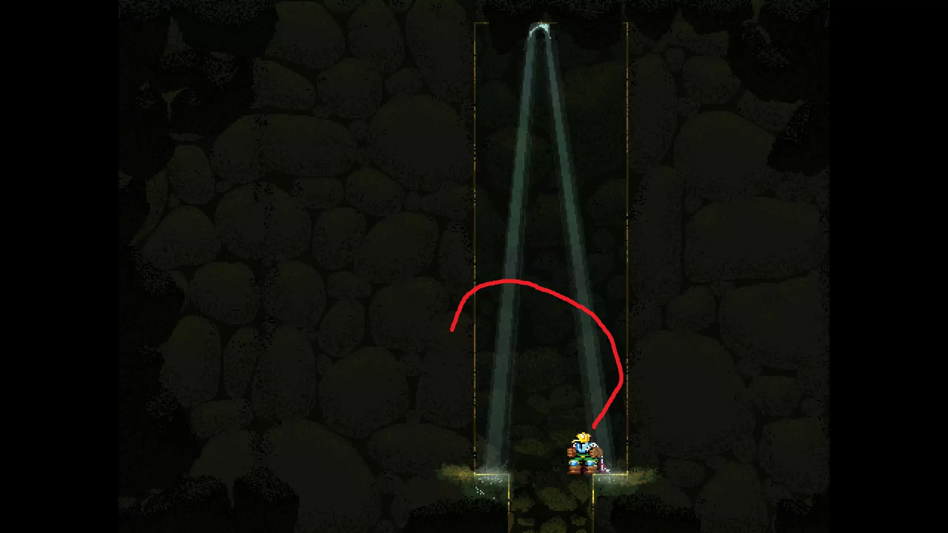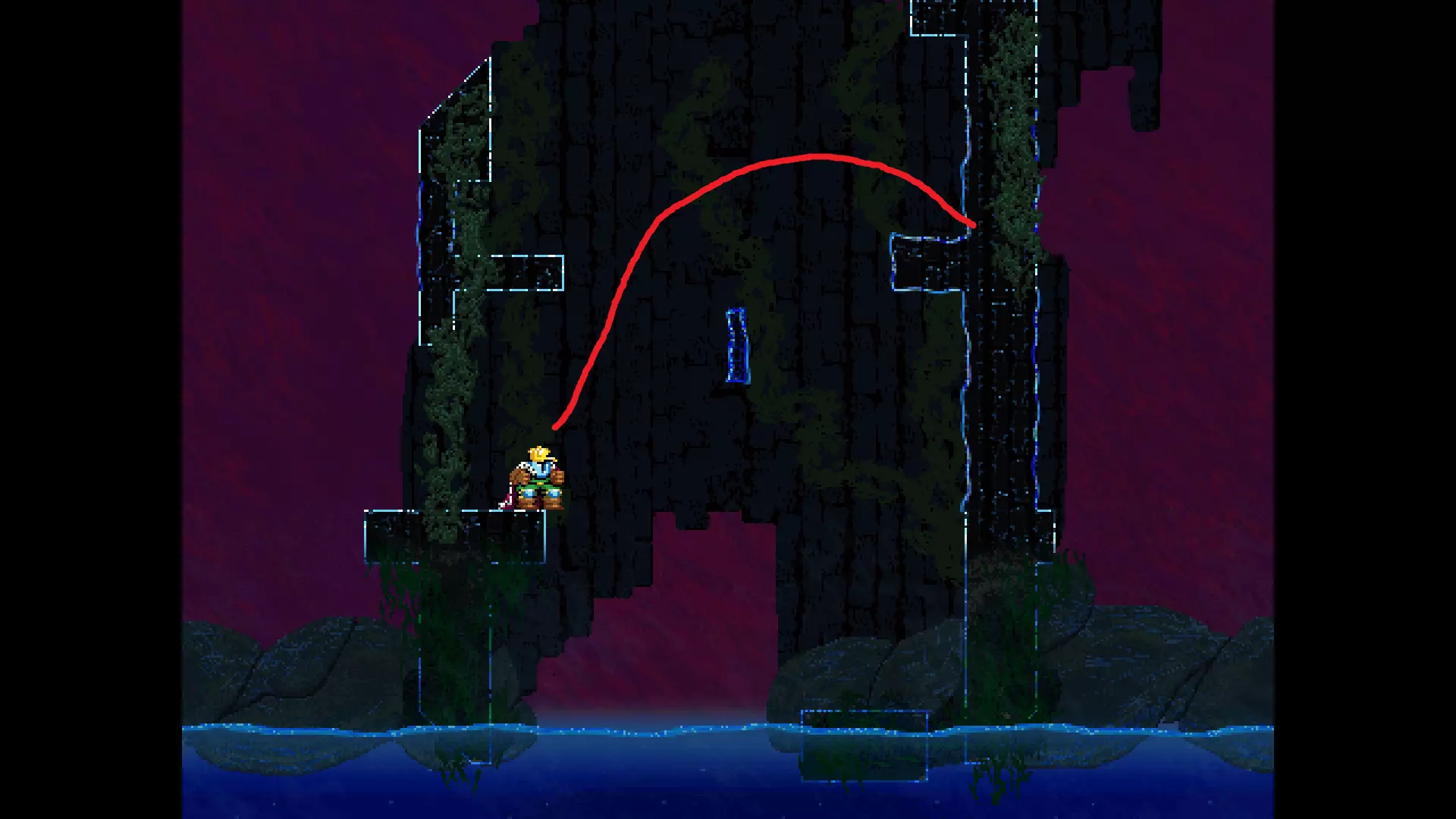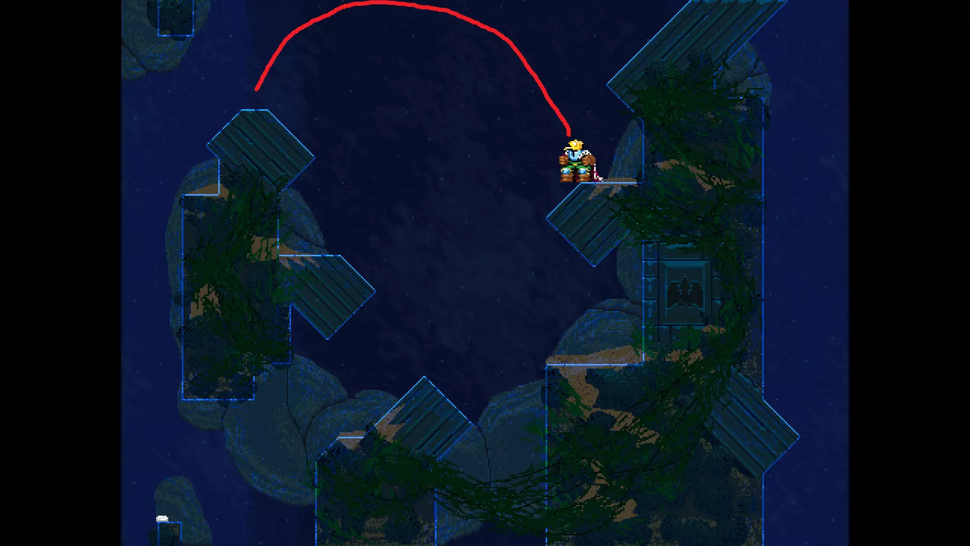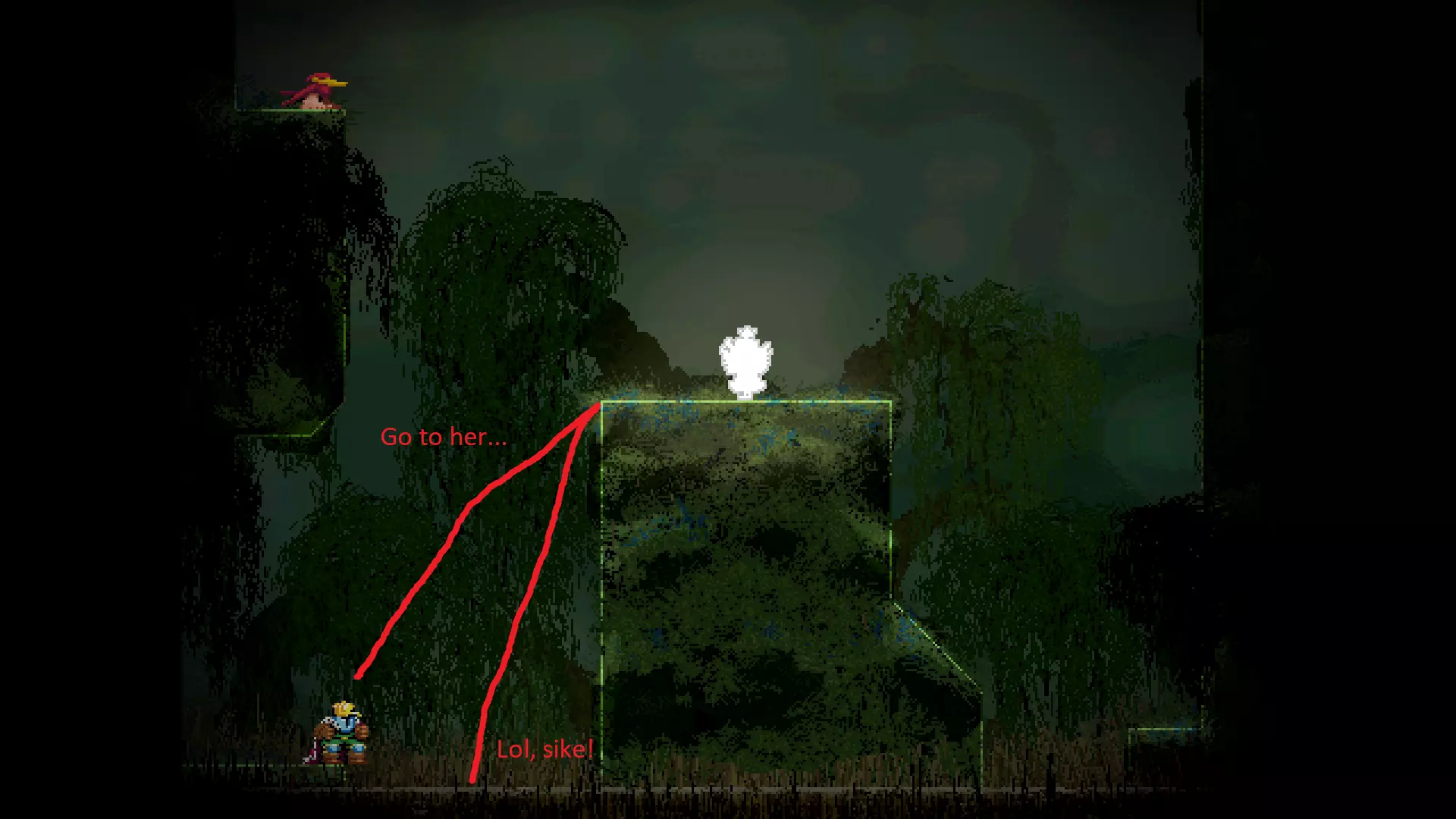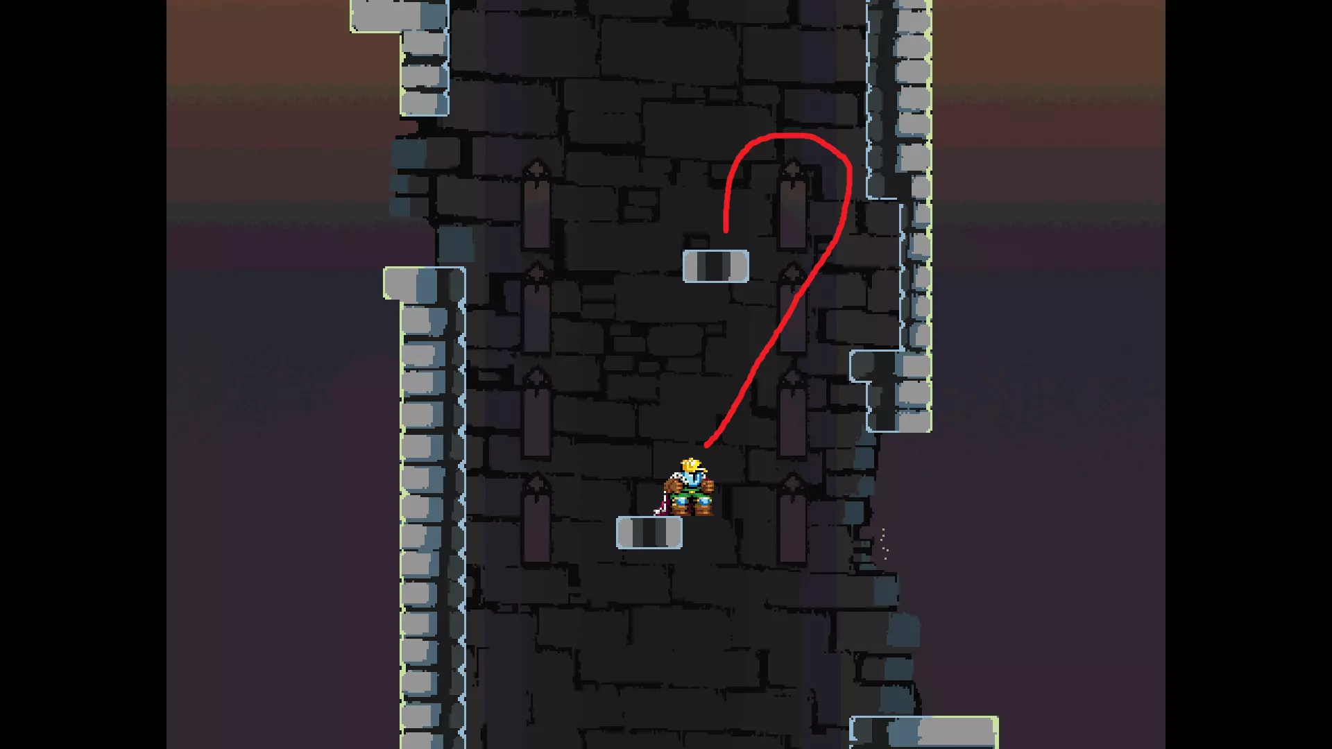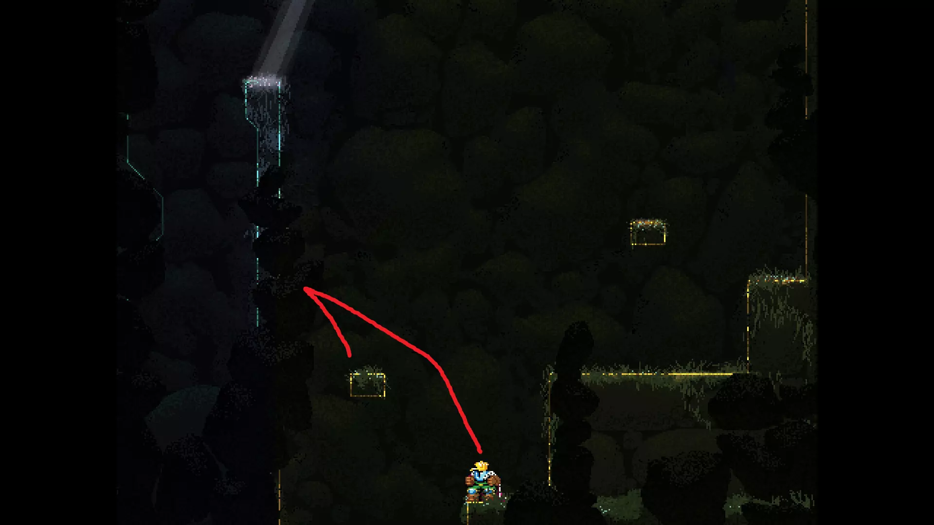 请注意,以下跳跃需要【亚像素级】的精准操作。即使你处于这个精确像素位置,也可能无法成功,除非你使用蛇形戒指稍微向右移动,确保自己处于正确的亚像素位置。