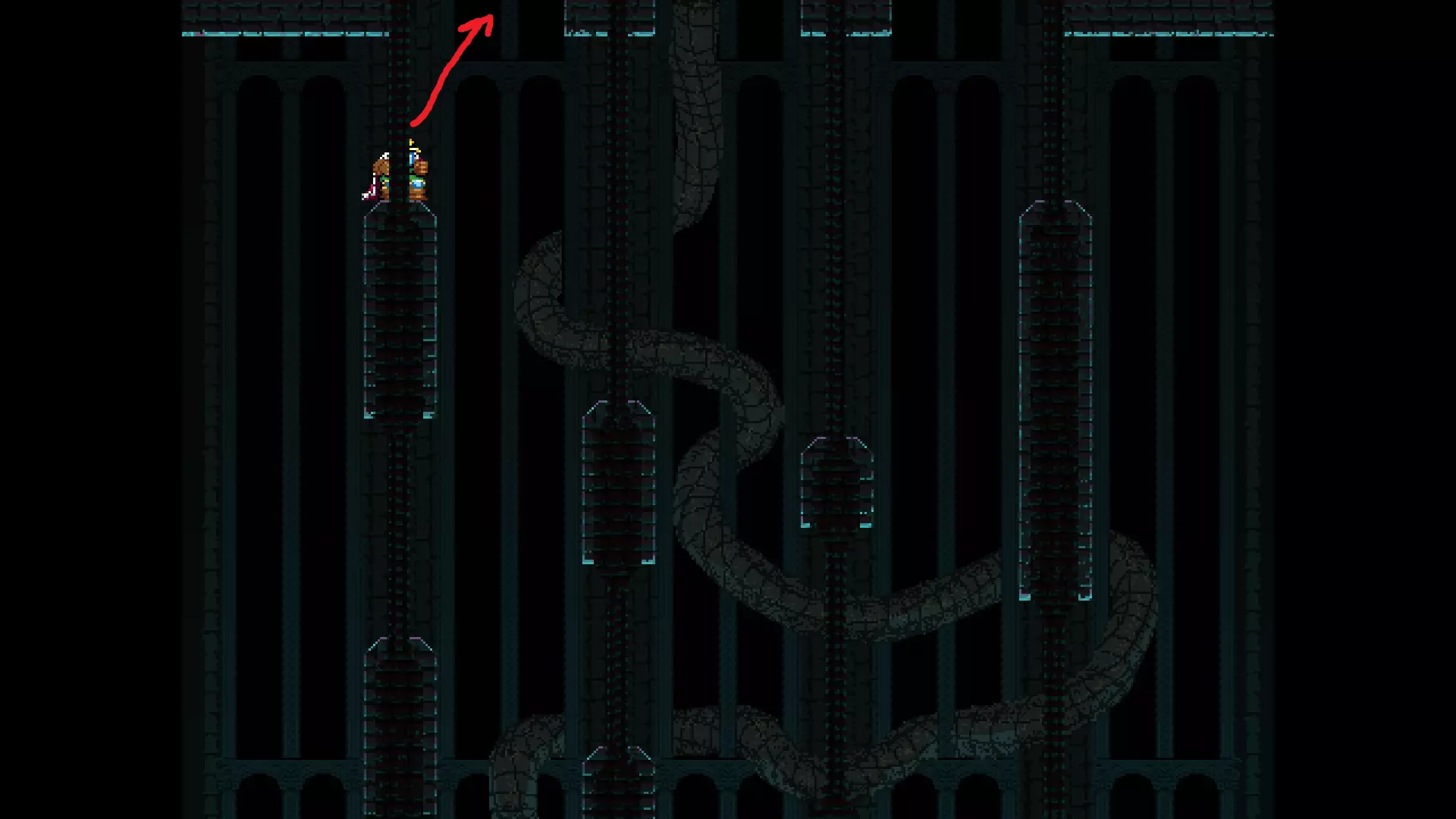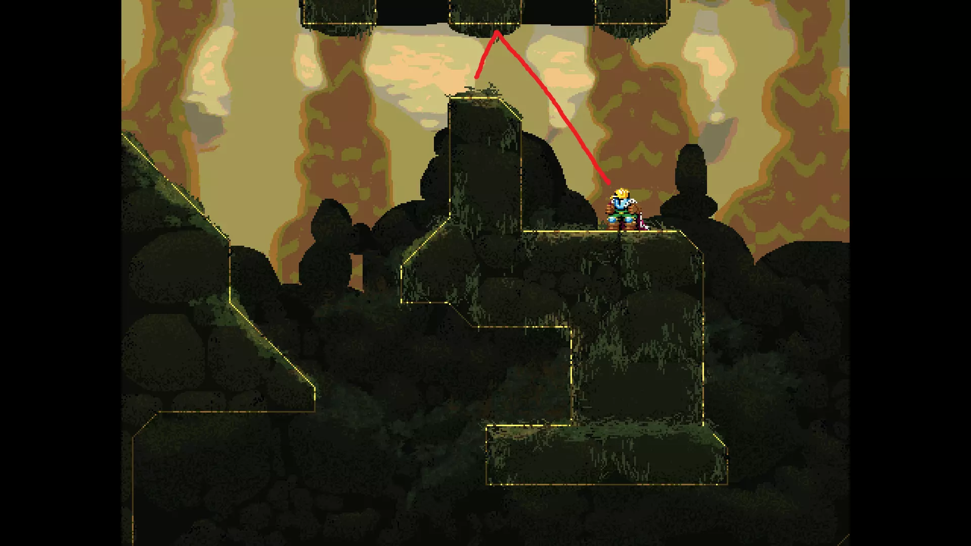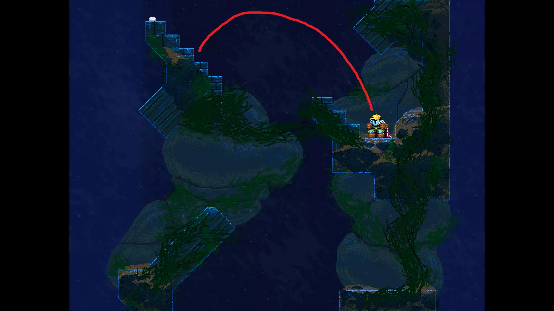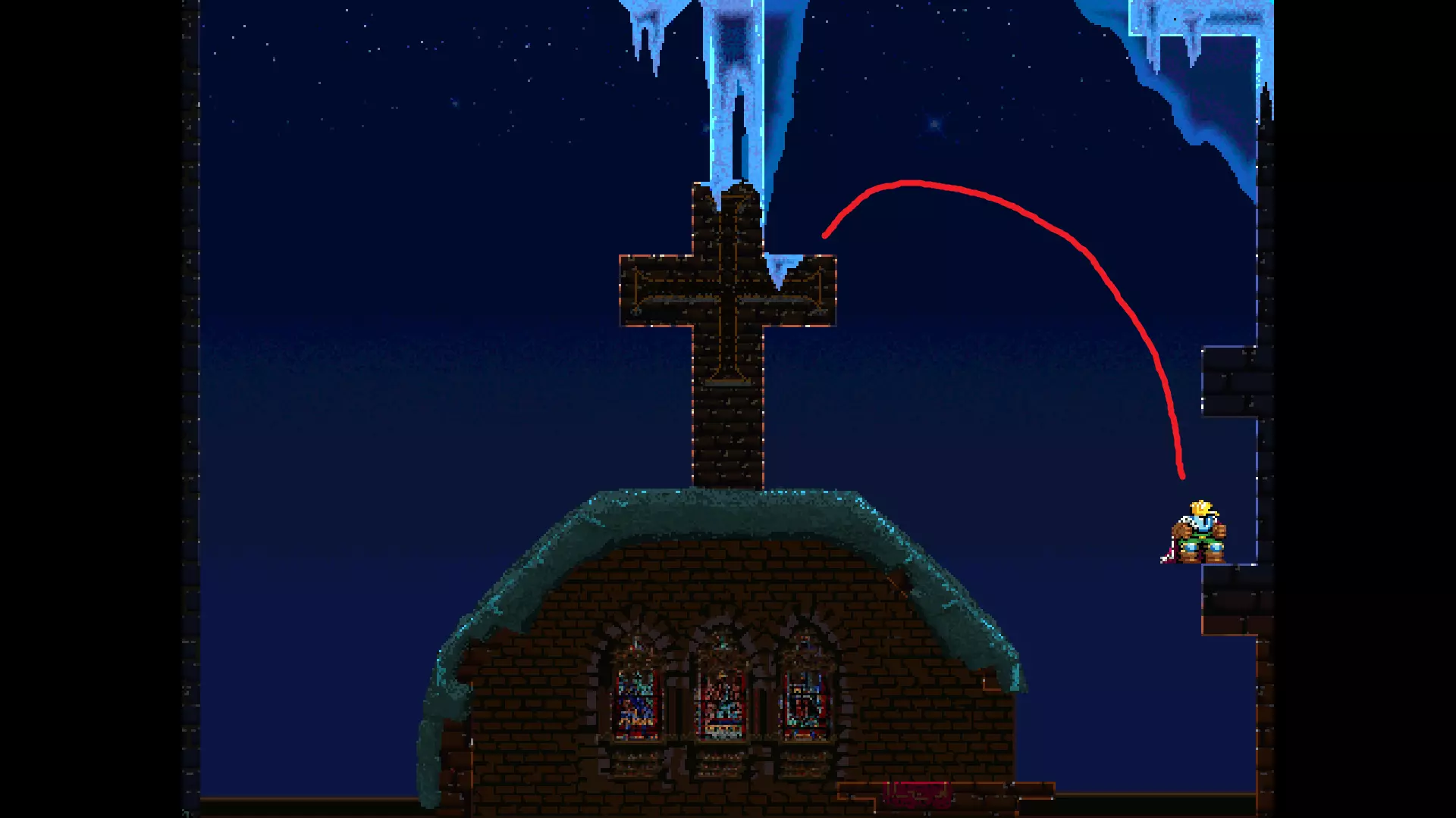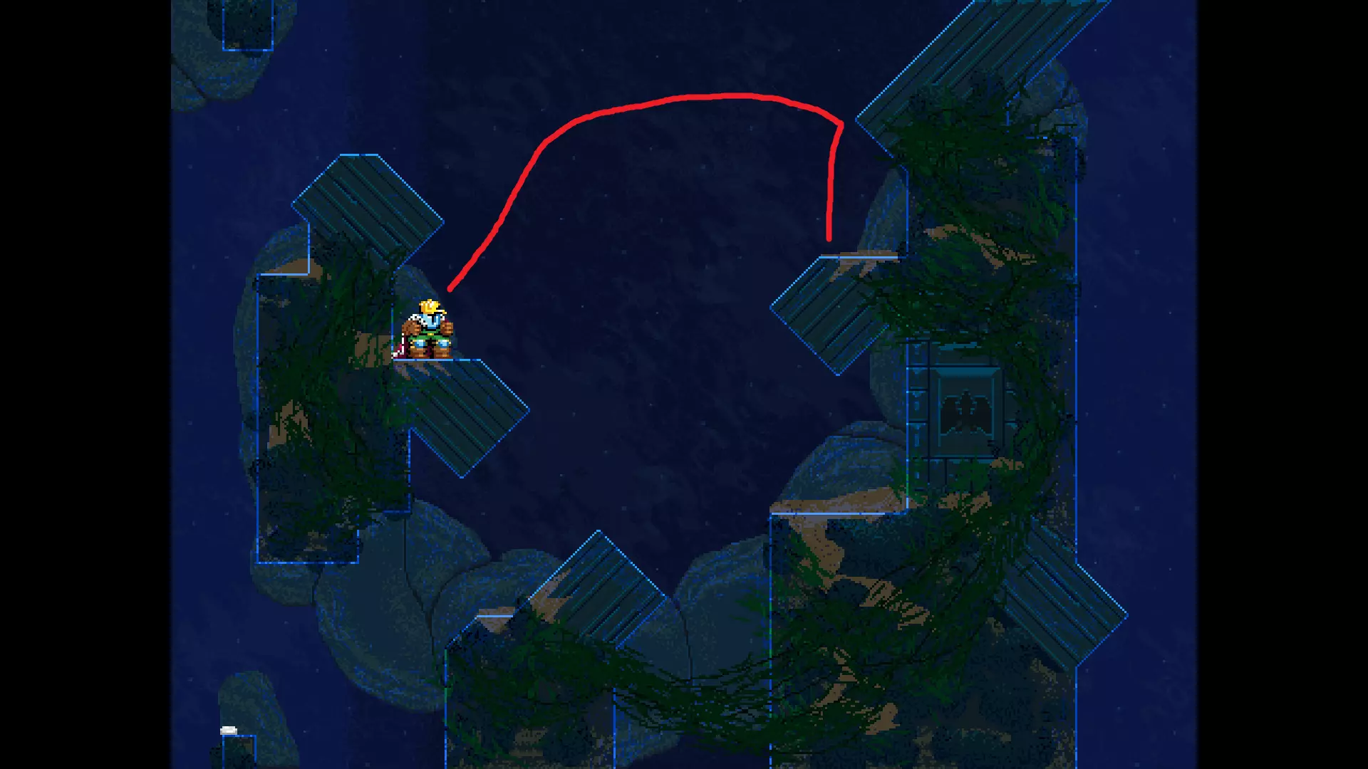 请注意,以下跳跃需要【亚像素级】的精准操作。即使你处于这个精确像素位置,也可能无法成功,除非你使用蛇形戒指稍微向右移动,确保自己处于正确的亚像素位置。