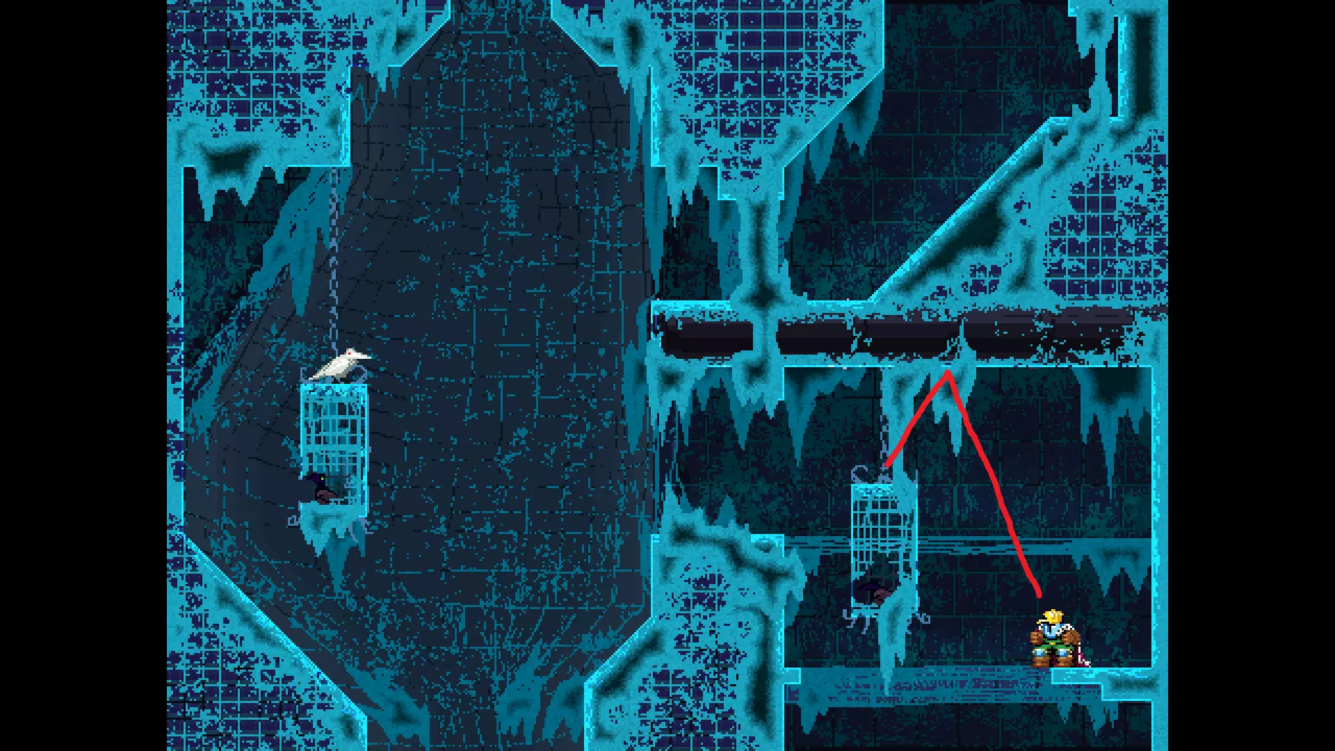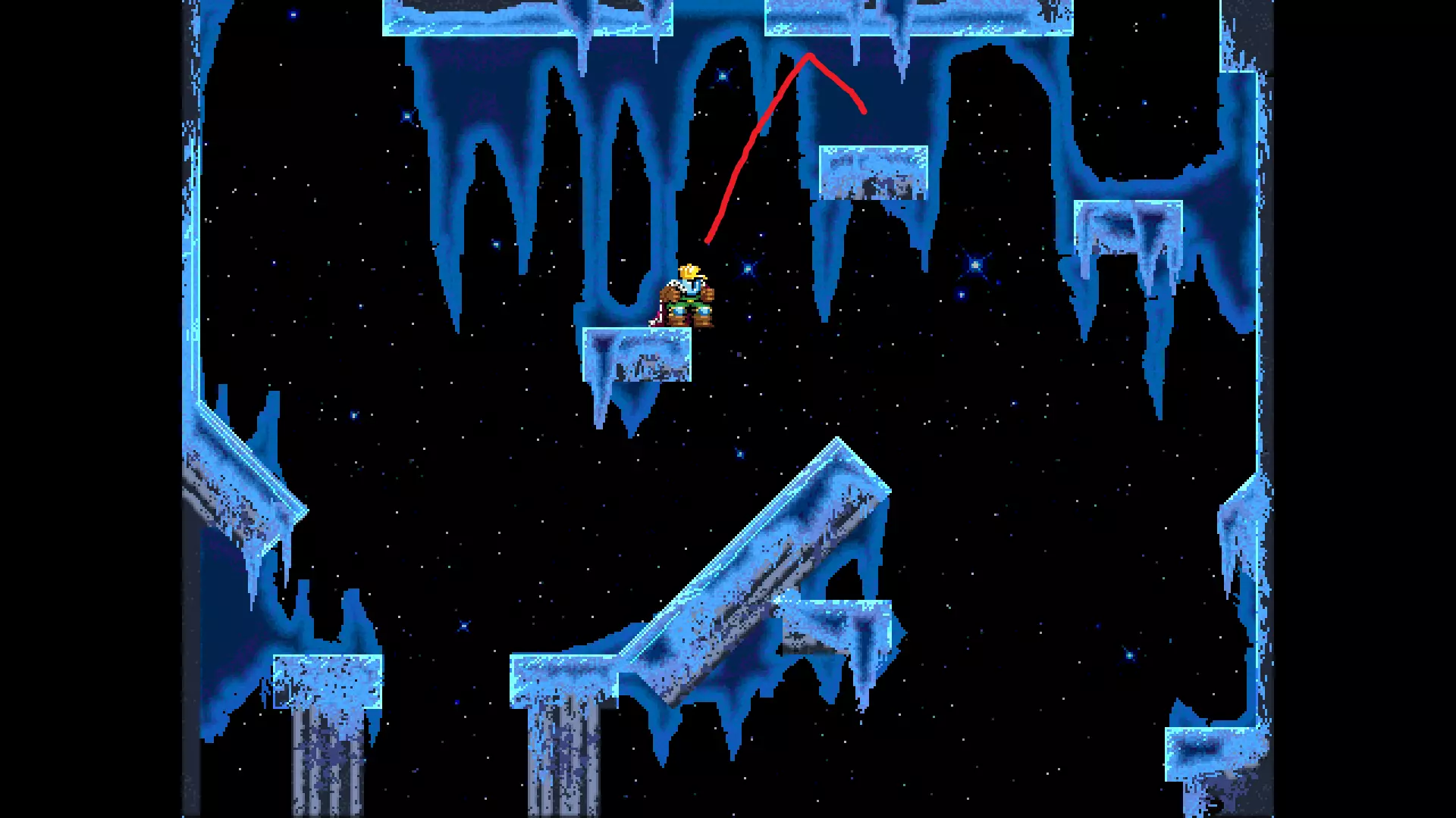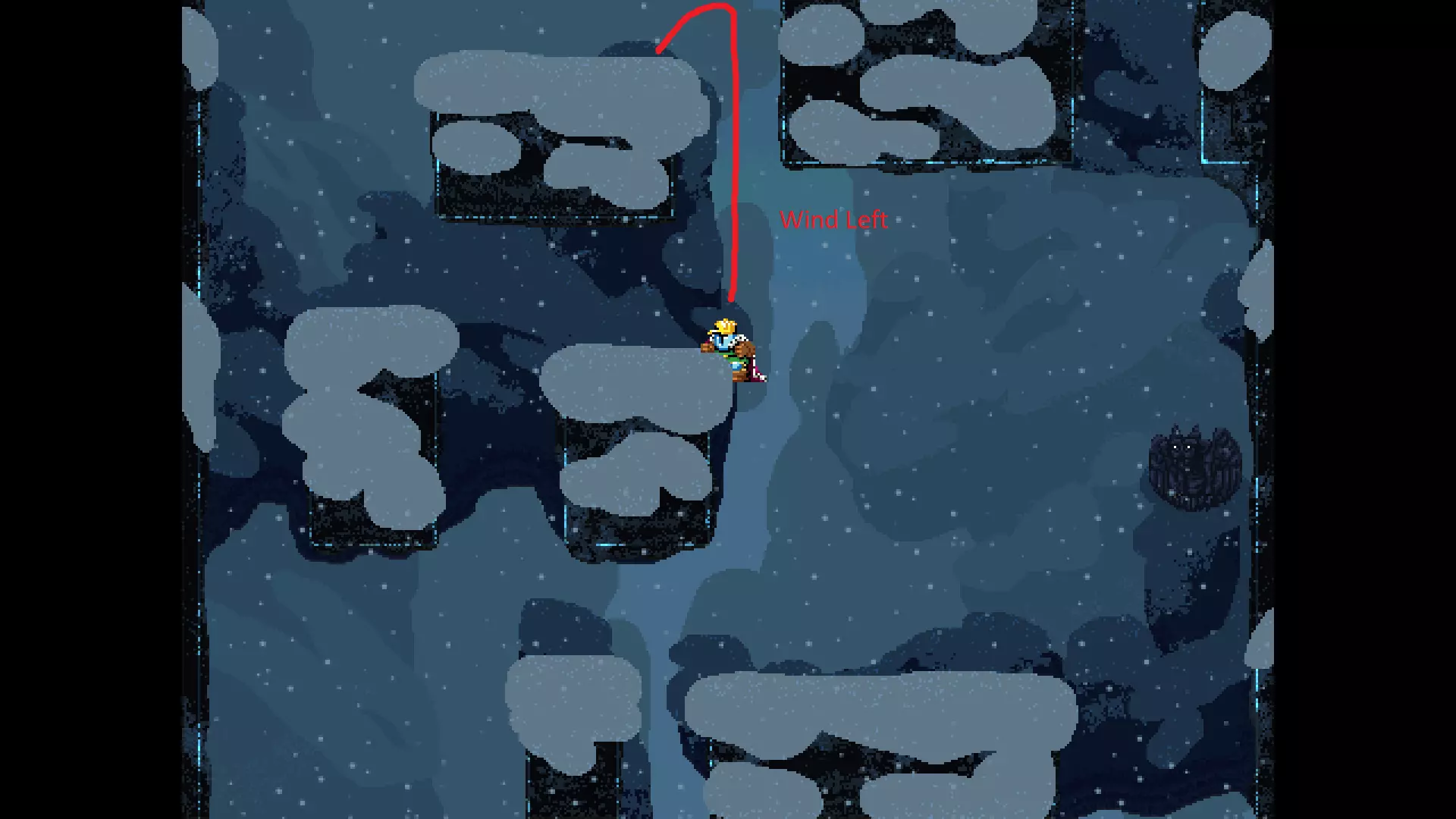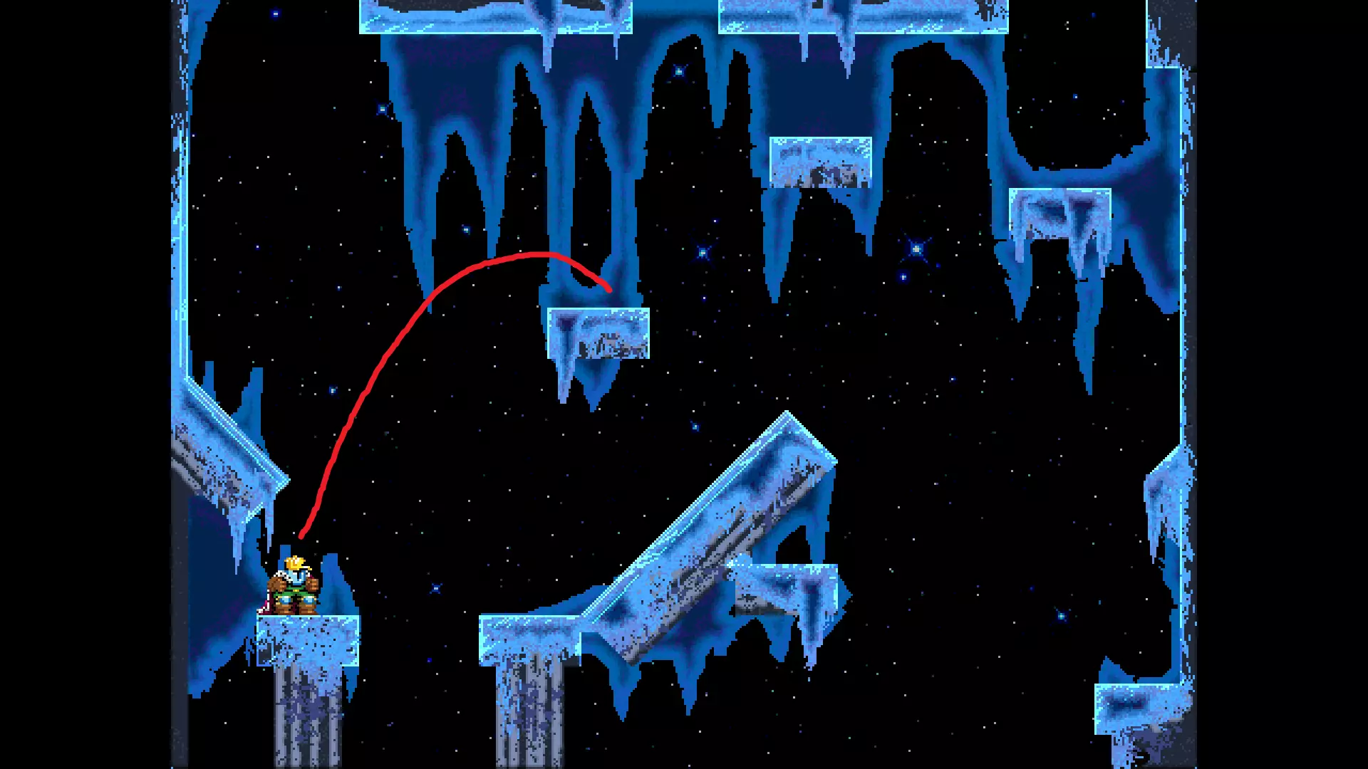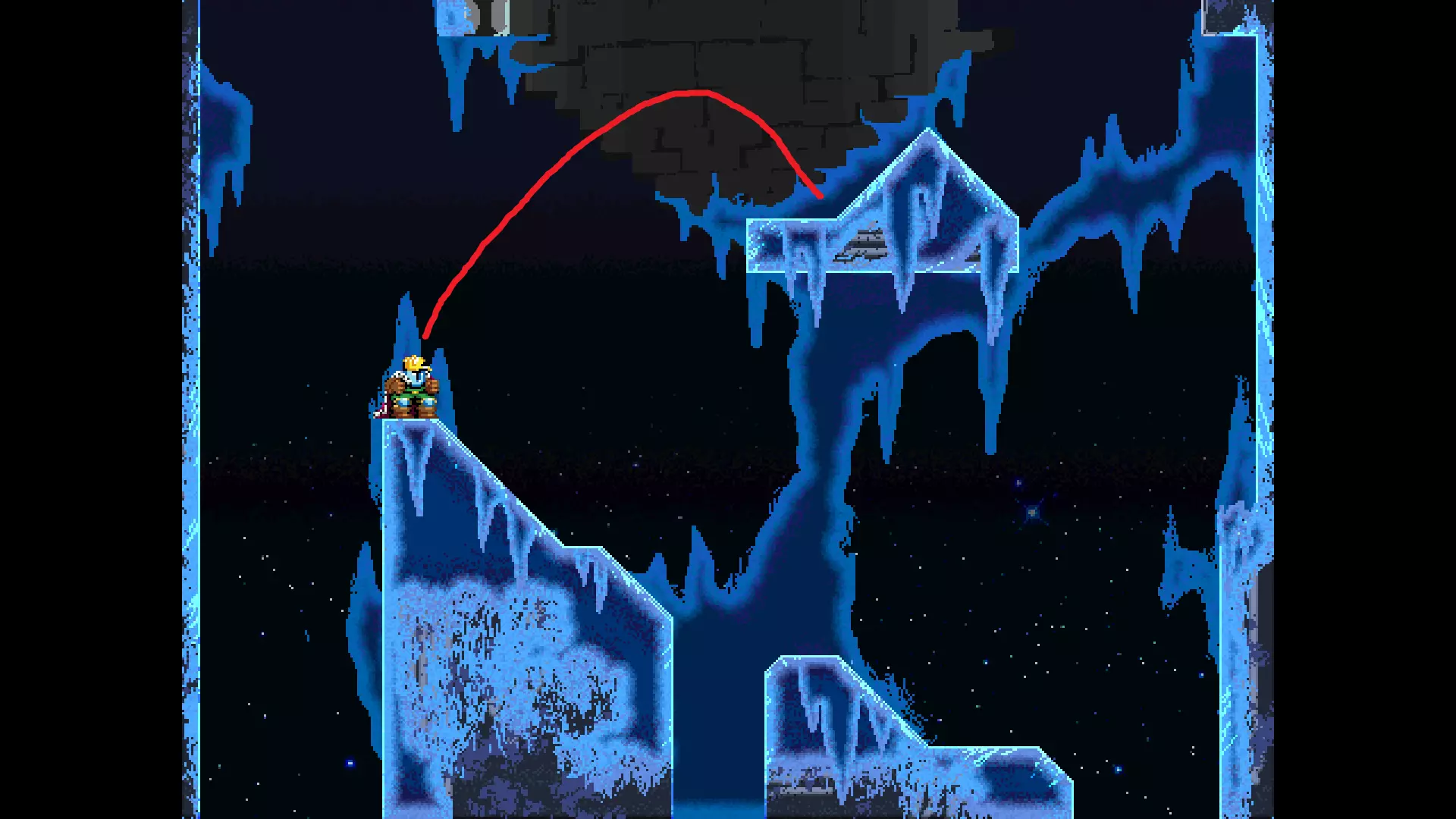 请注意,以下跳跃需要【亚像素级】的精准操作。即使你处于这个精确像素位置,也可能无法成功,除非你使用蛇形戒指稍微向右移动,确保自己处于正确的亚像素位置。