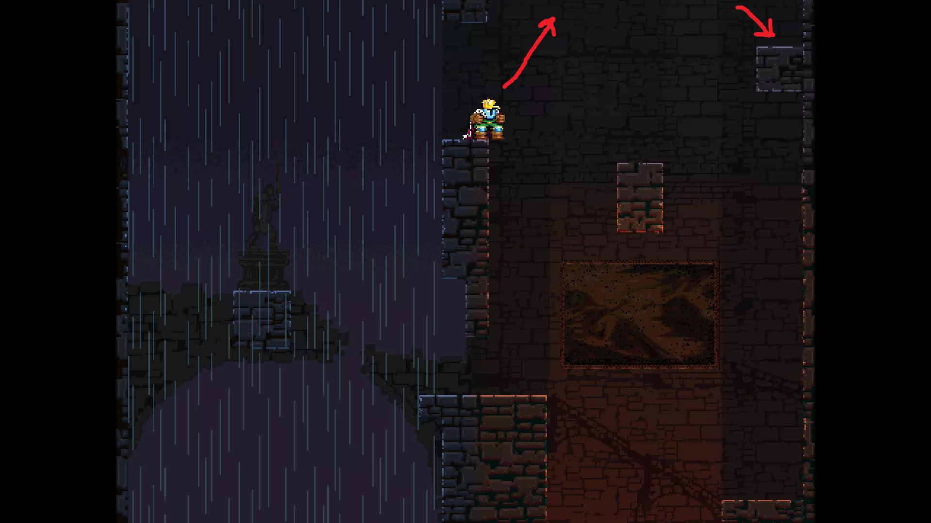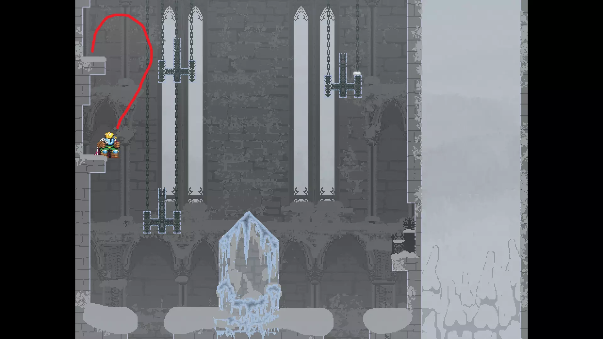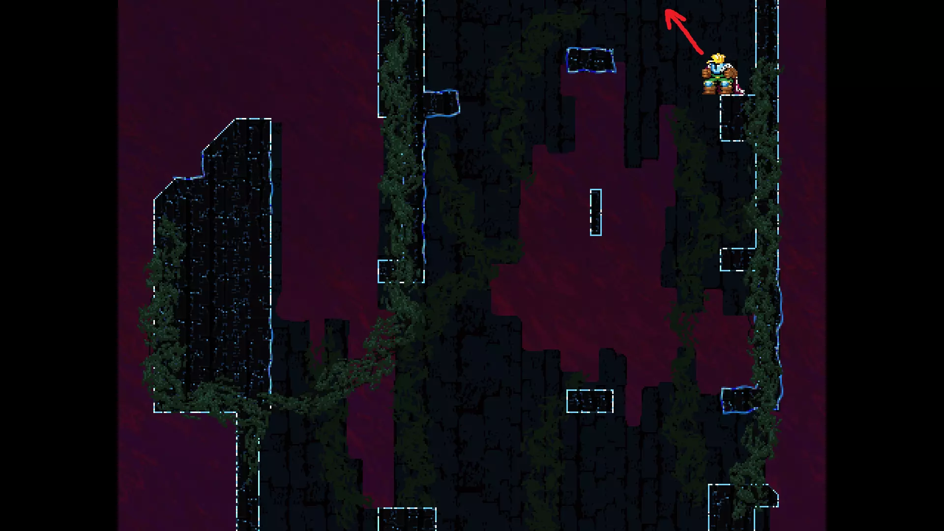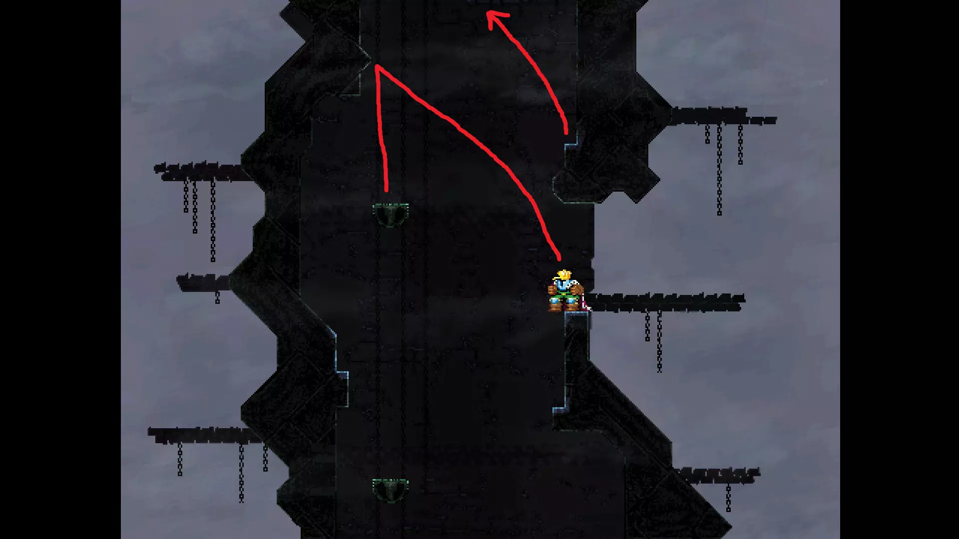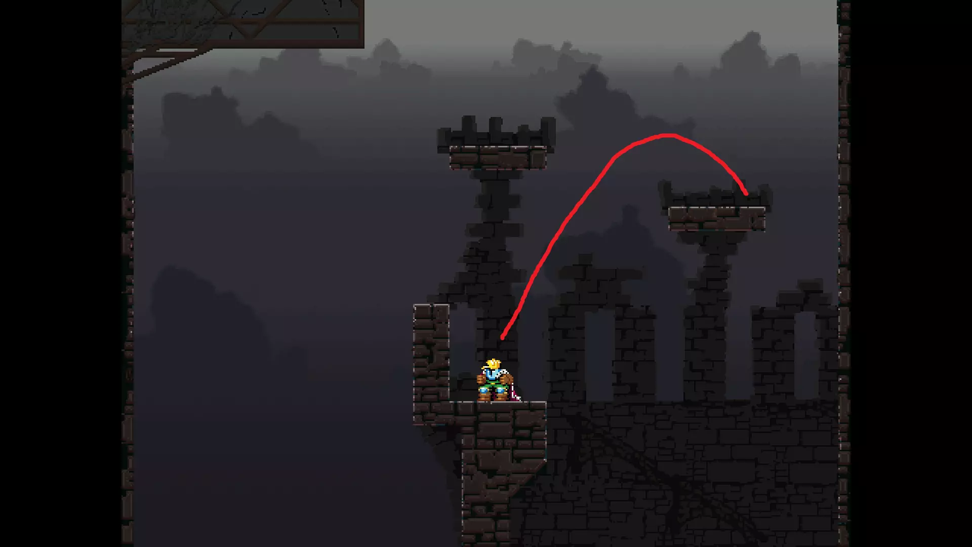 请注意,以下跳跃需要【亚像素级】的精准操作。即使你处于这个精确像素位置,也可能无法成功,除非你使用蛇形戒指稍微向右移动,确保自己处于正确的亚像素位置。