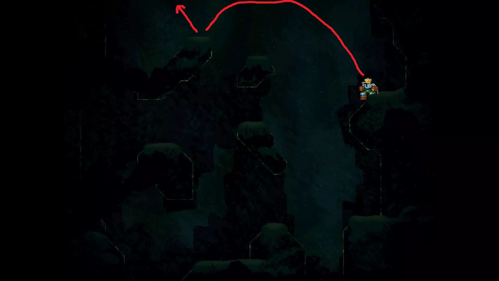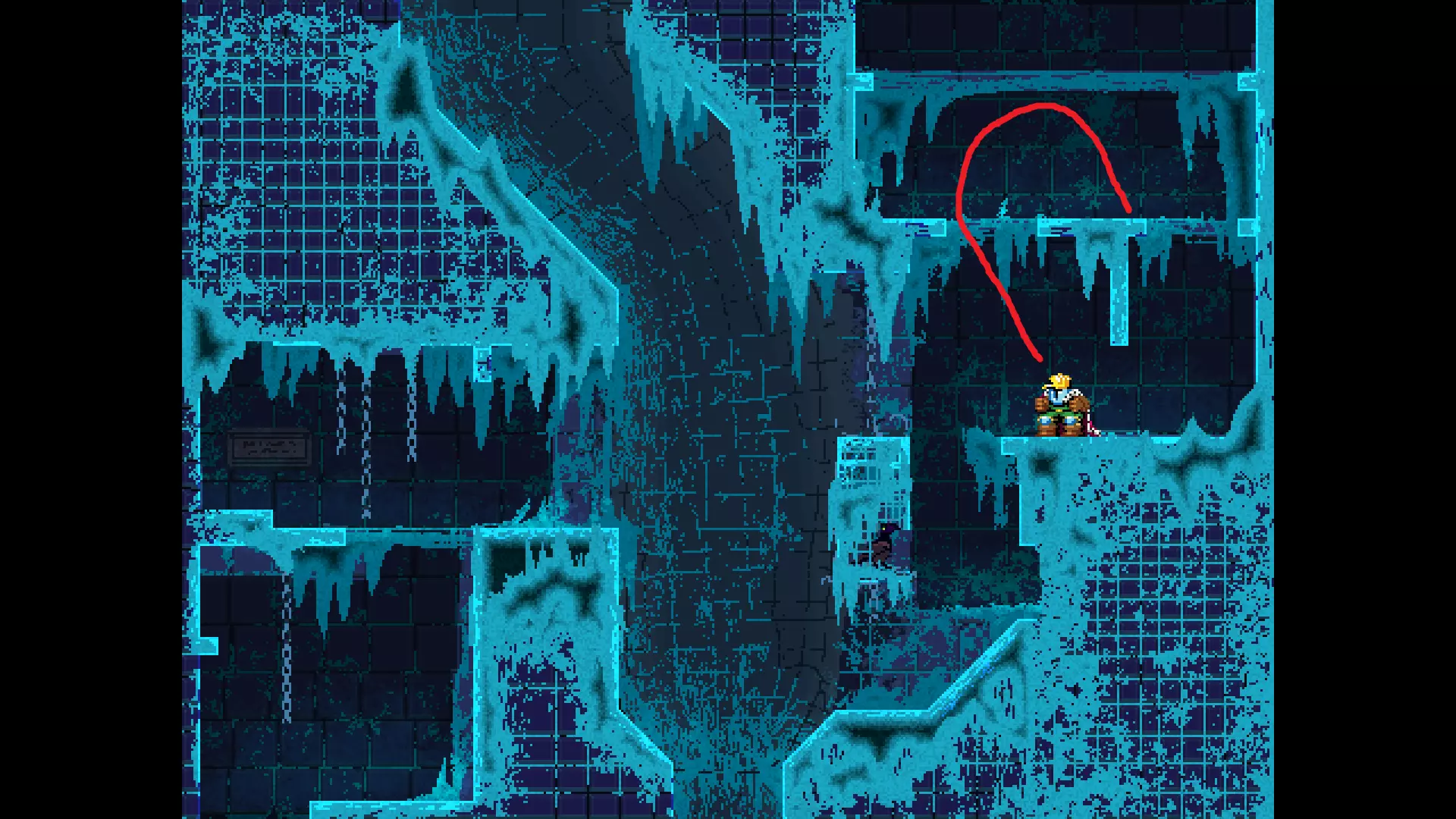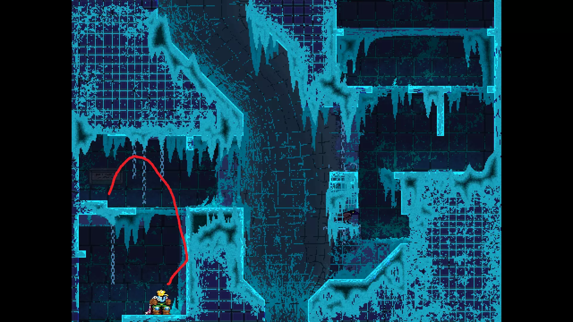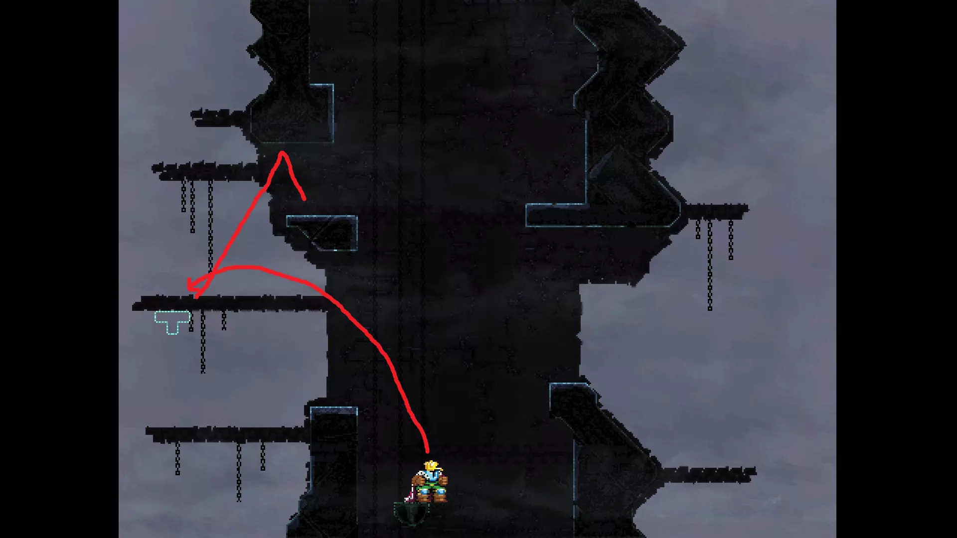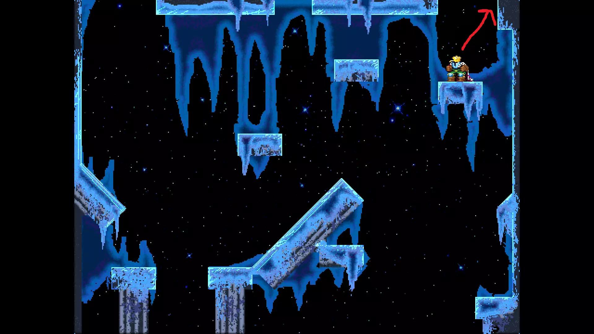 请注意,以下跳跃需要【亚像素级】的精准操作。即使你处于这个精确像素位置,也可能无法成功,除非你使用蛇形戒指稍微向右移动,确保自己处于正确的亚像素位置。