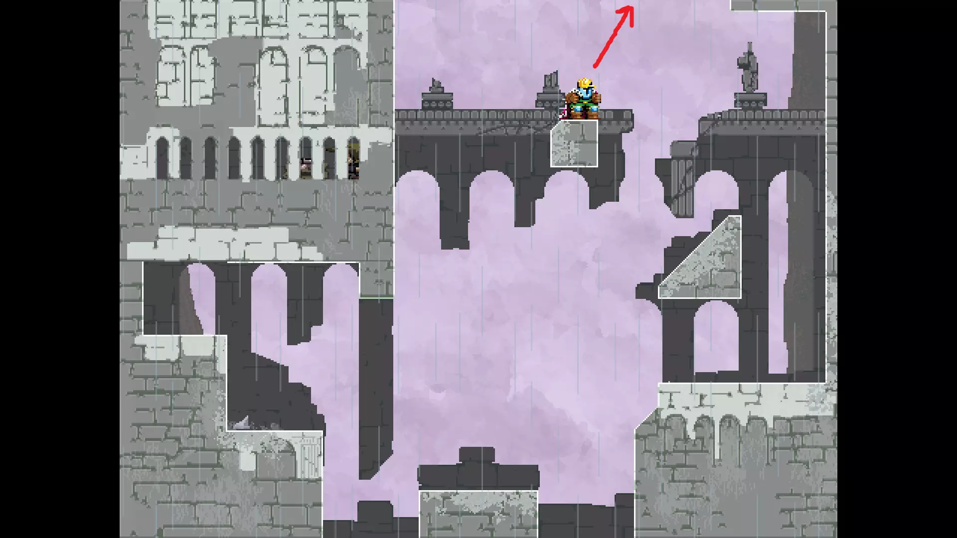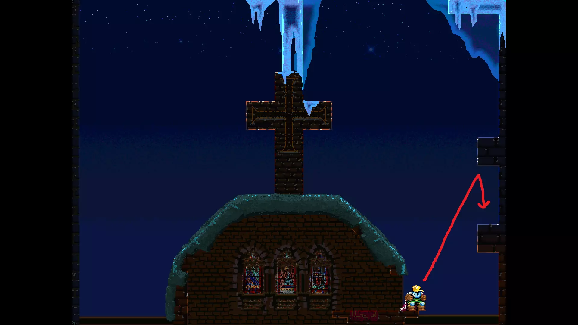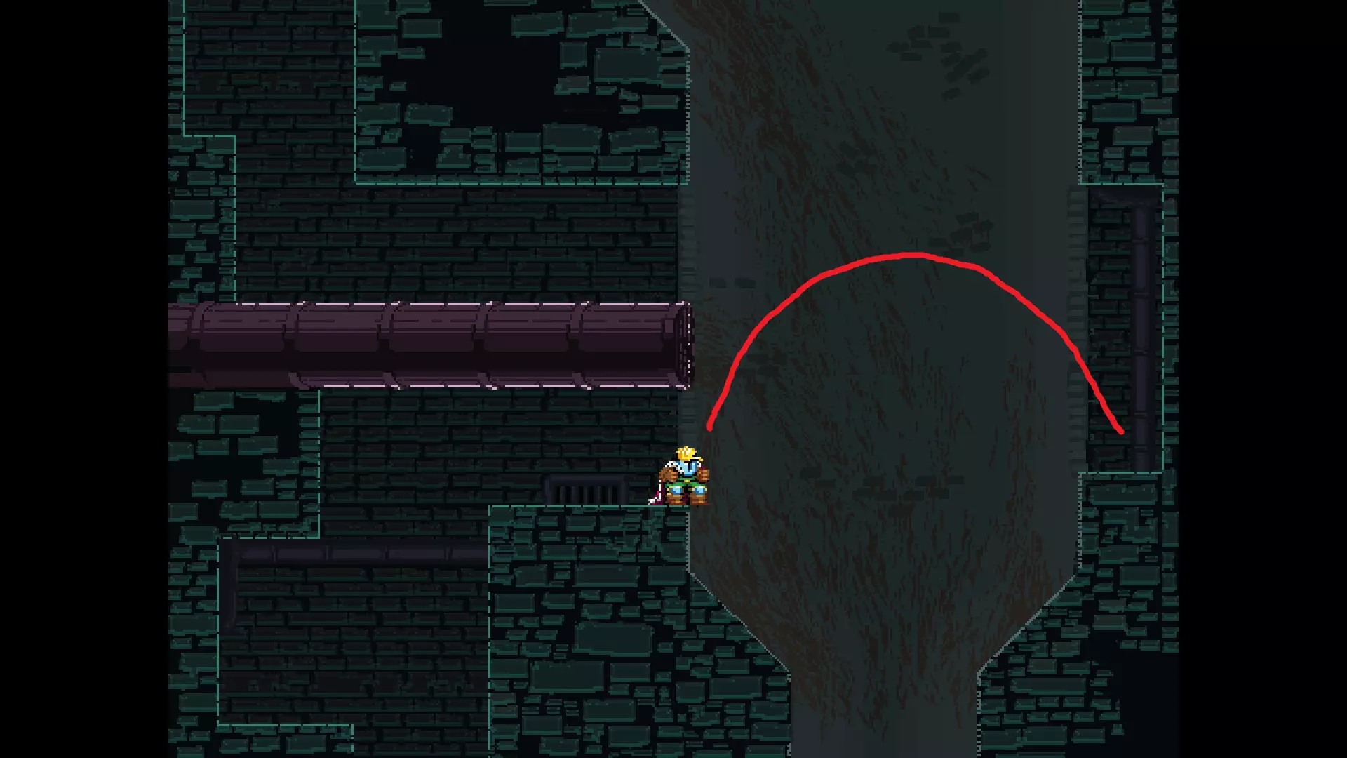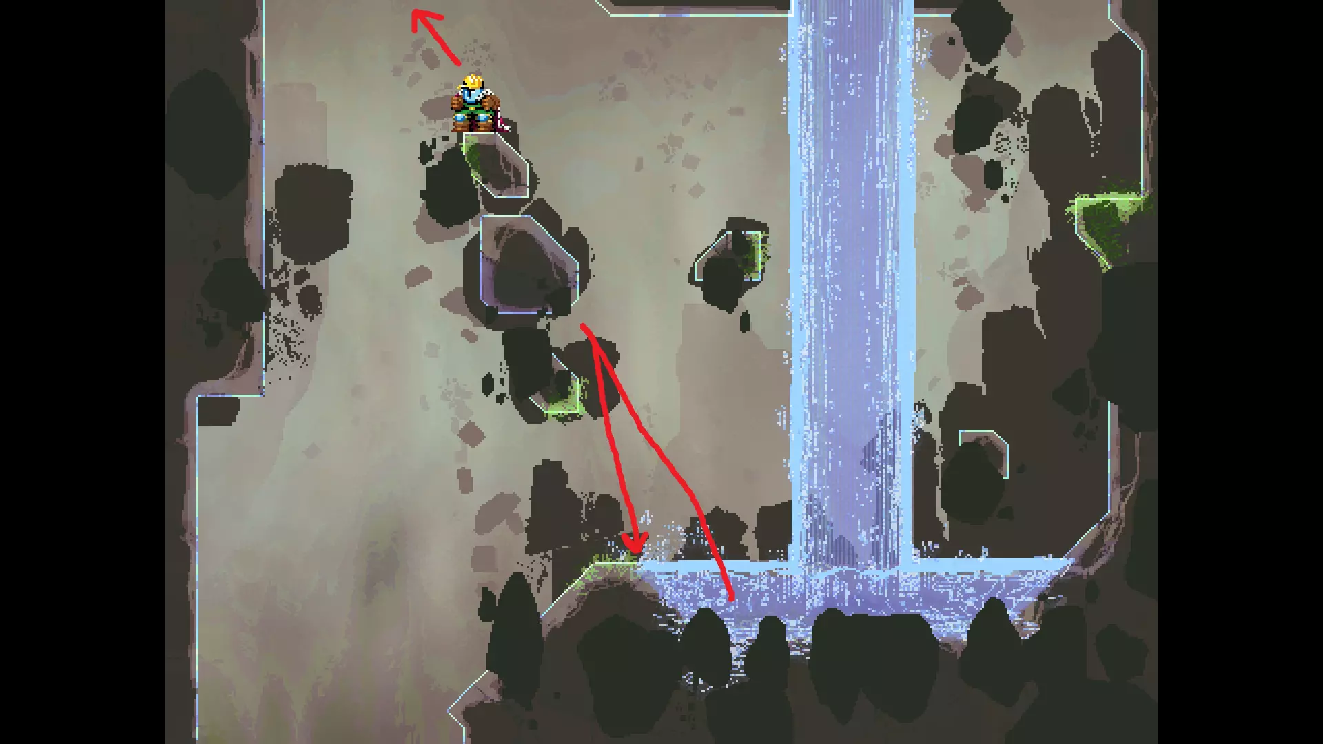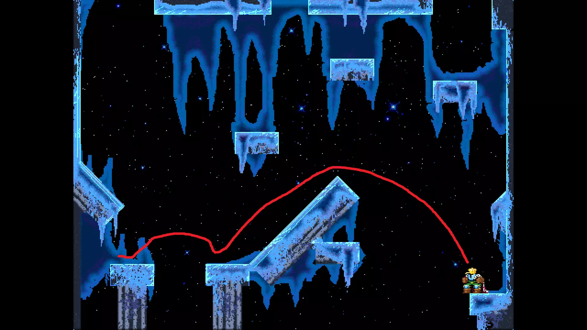 请注意,以下跳跃需要【亚像素级】的精准操作。即使你处于这个精确像素位置,也可能无法成功,除非你使用蛇形戒指稍微向右移动,确保自己处于正确的亚像素位置。