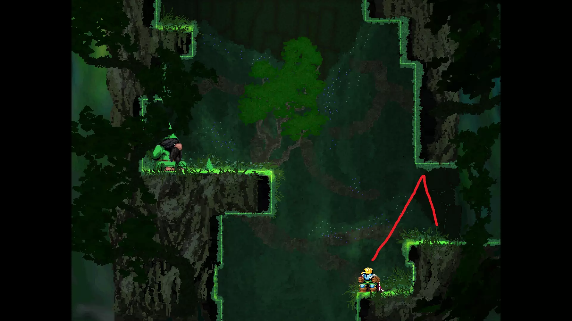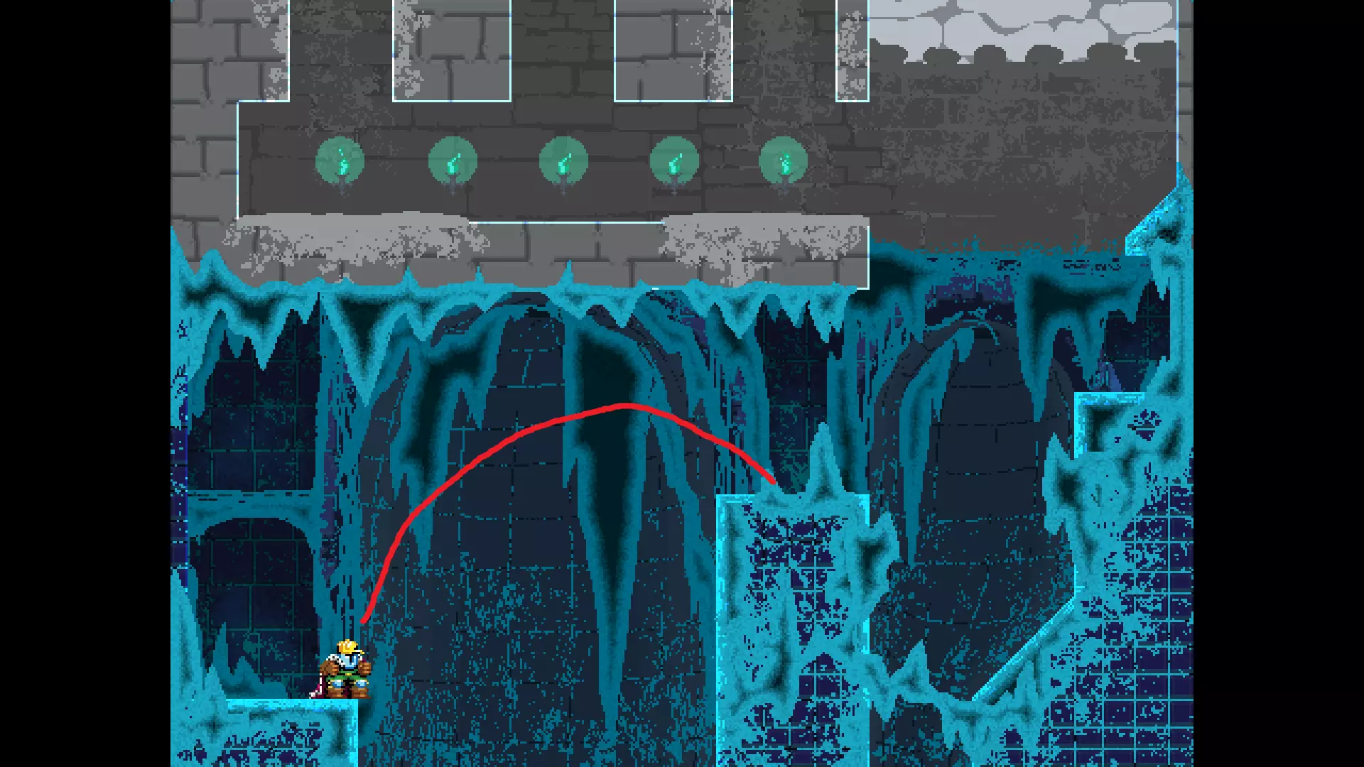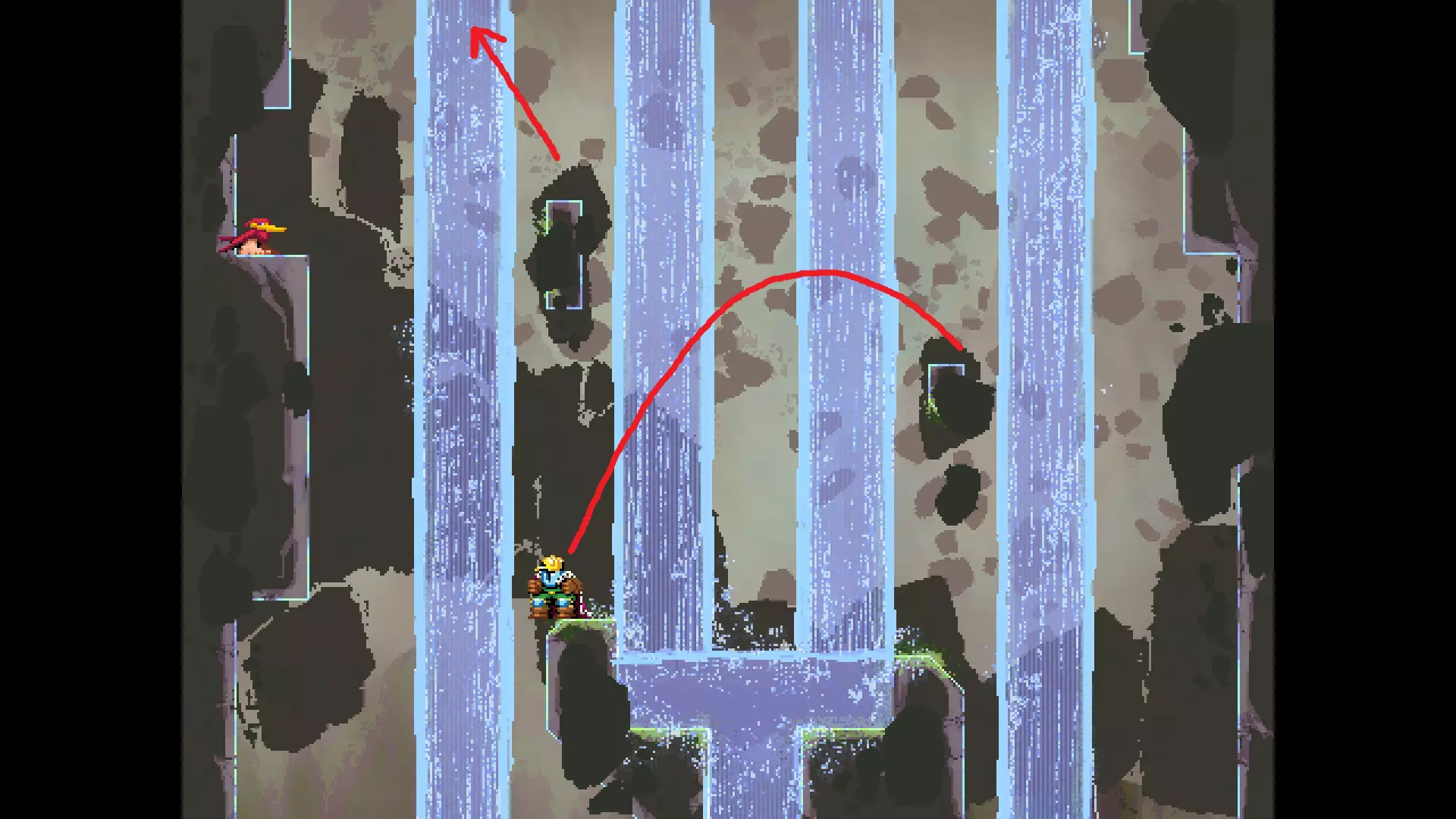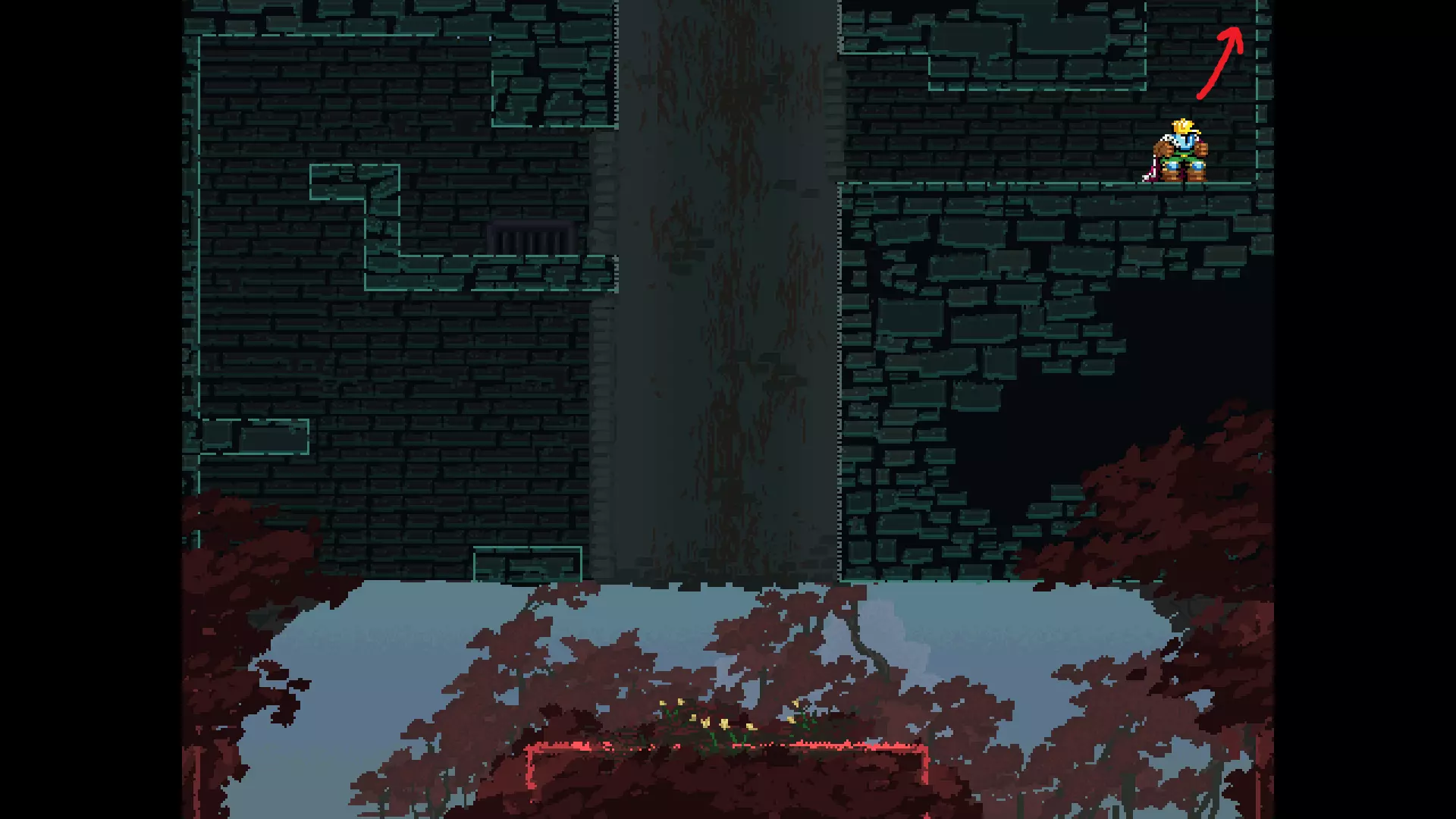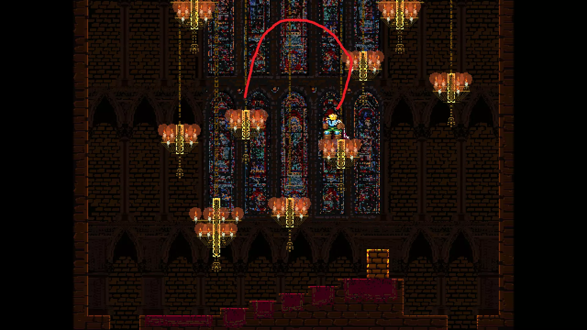请注意,以下跳跃需要【亚像素级】的精准操作。即使你处于这个精确像素位置,也可能无法成功,除非你使用蛇形戒指稍微向右移动,确保自己处于正确的亚像素位置。