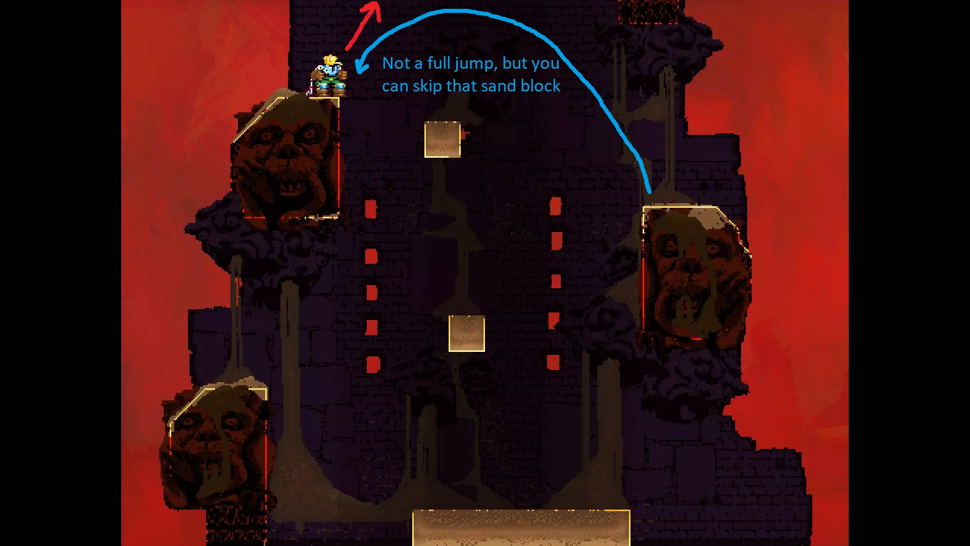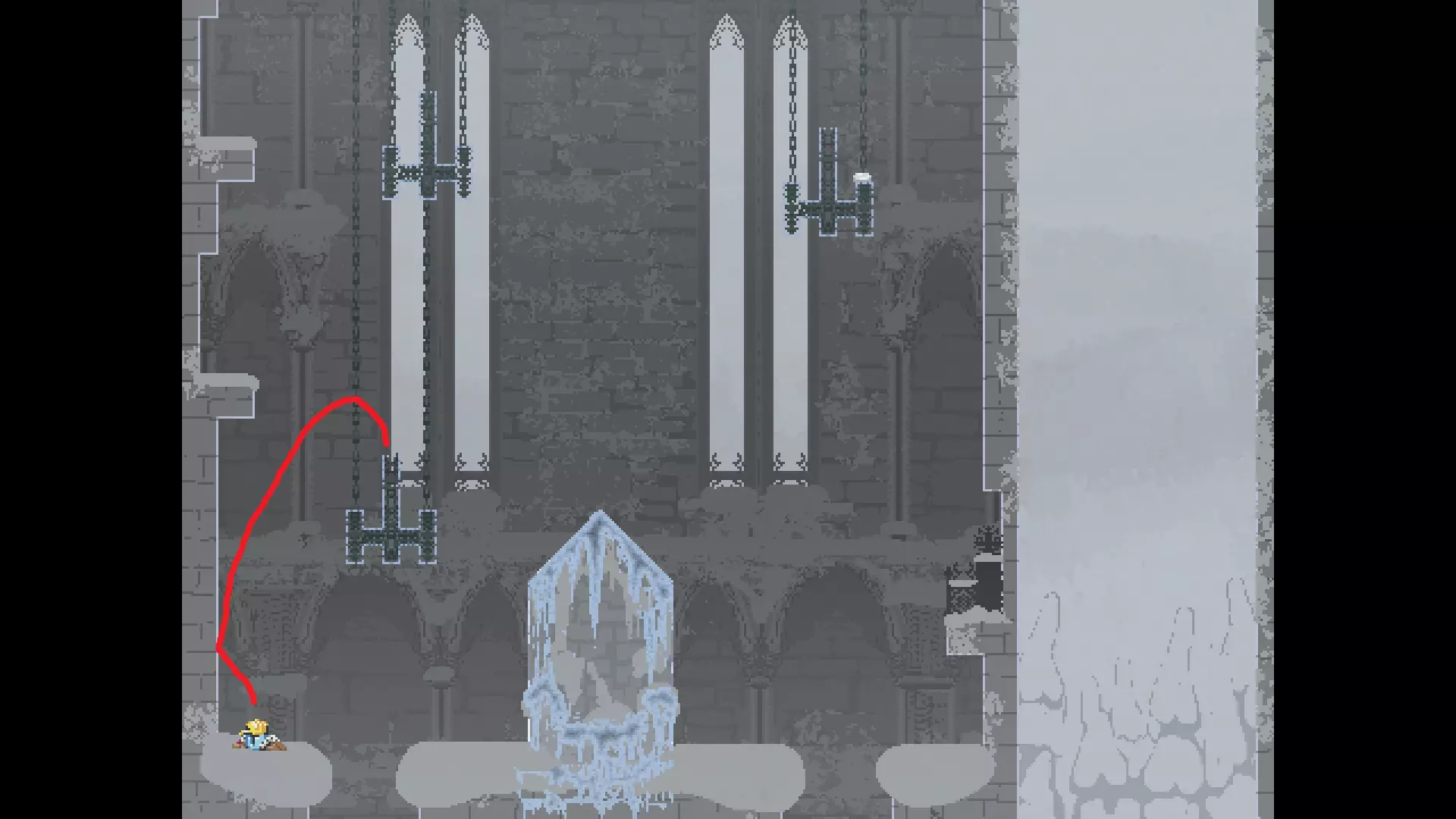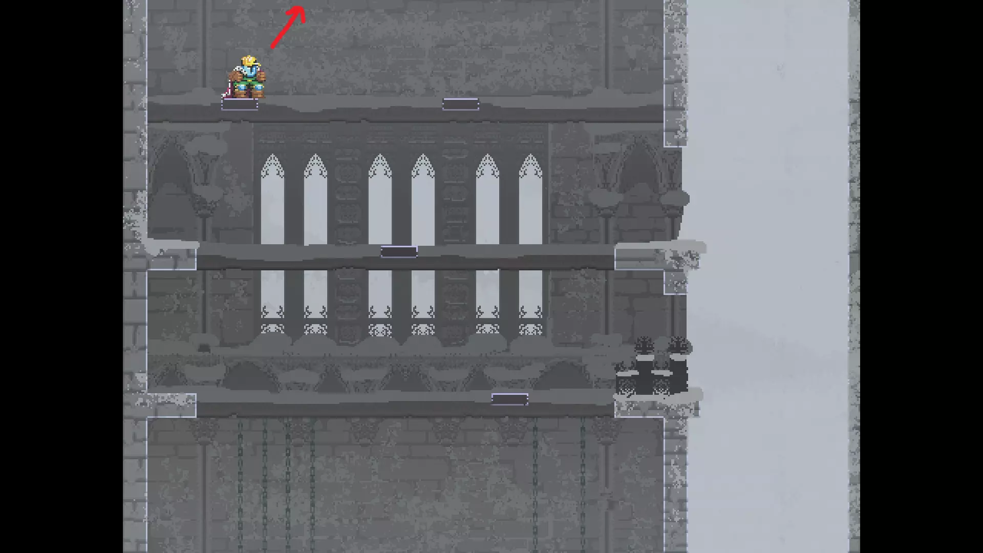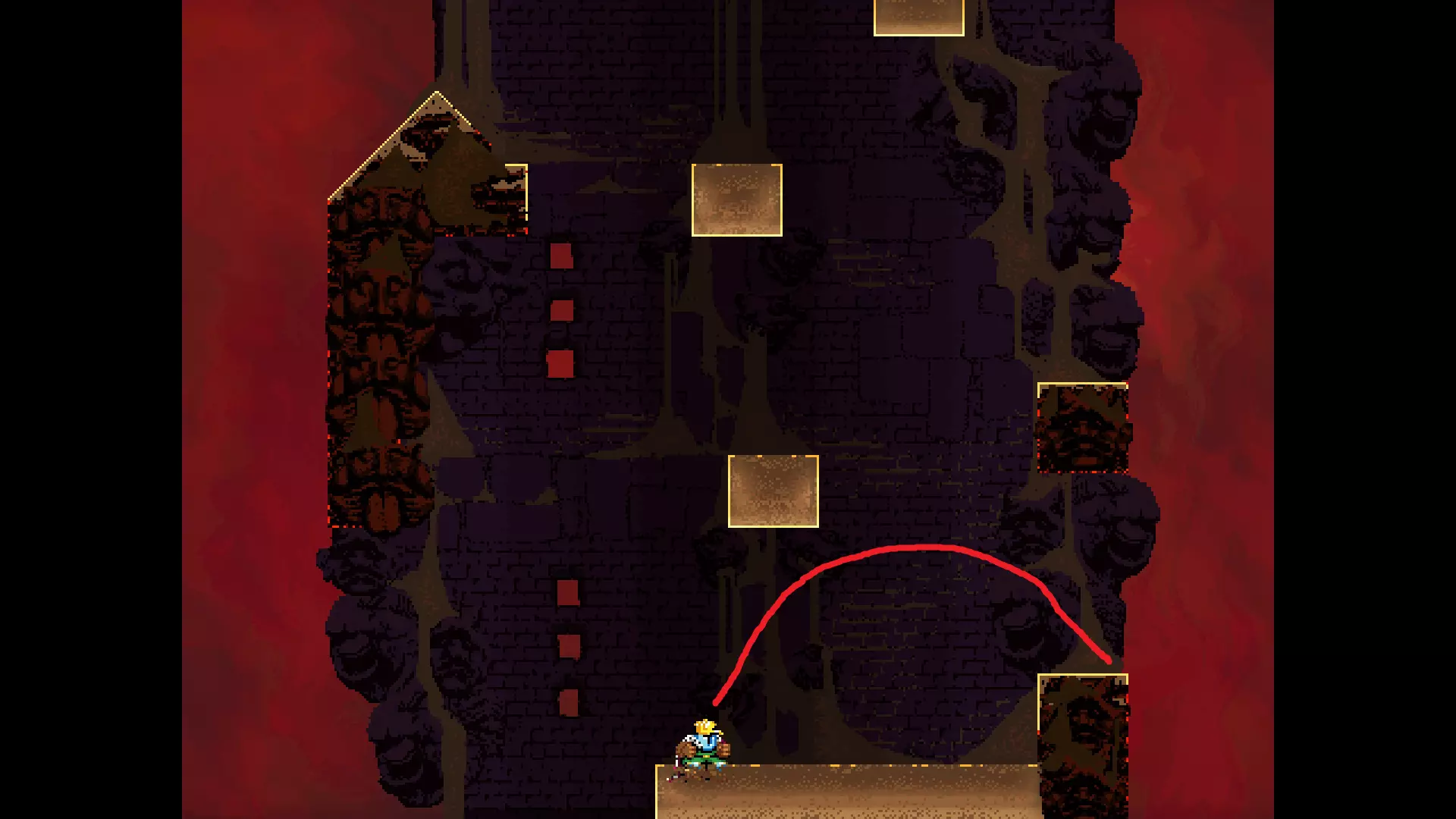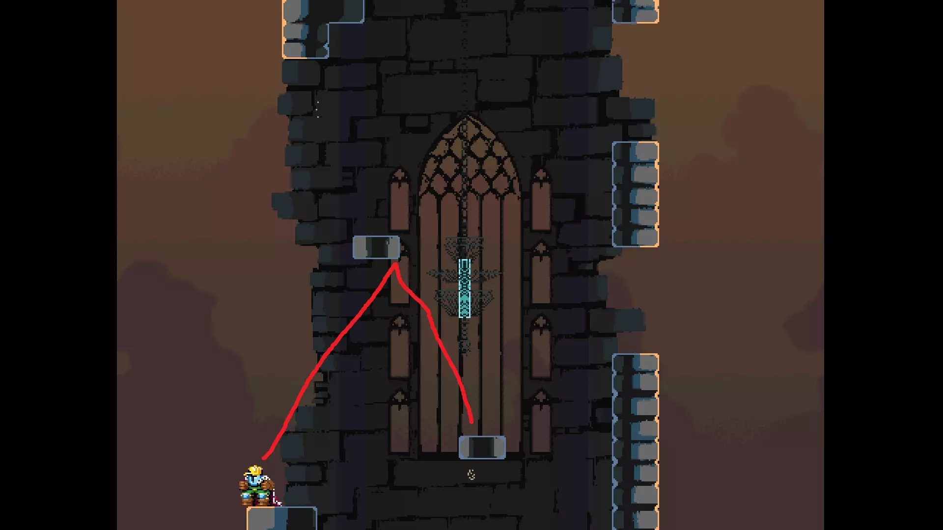 每个可全力施展的跳跃动作的截图与引导箭头。 简介 本指南旨在帮助那些需要一点额外帮助来冲过终点线的玩家。我是那种会观看他人通关视频并学习其操作的玩家。这款游戏本身已经足够困难,没必要再做一些不必要的跳跃。如果我能用全力跳跃来确保成功,我就会这么做。 如果你也是这样的玩家,那么本指南适合你。如果你想完全靠自己完成所有挑战,我尊重你,但请现在离开。 本指南并非旨在展示所有情况下最快或最佳的跳跃方式,而只是展示我能够确保使用全力跳跃就能成功的位置。请密切注意脚部的位置。有些跳跃比其他跳跃要精确得多。如果是像素级精准,我会显示脚部的放大窗口来帮助你对齐。特别感谢Jump King Discord中那些疯狂的人们,他们指出了我遗漏的许多跳跃点。尤其要感谢kebb、Memzy64u、DrJump_、Rossiyan和Abaddon。主游戏 - 传说中的宝贝