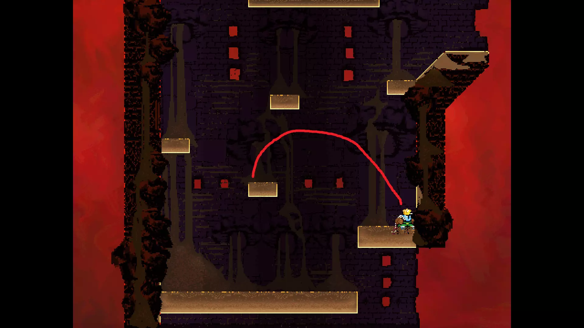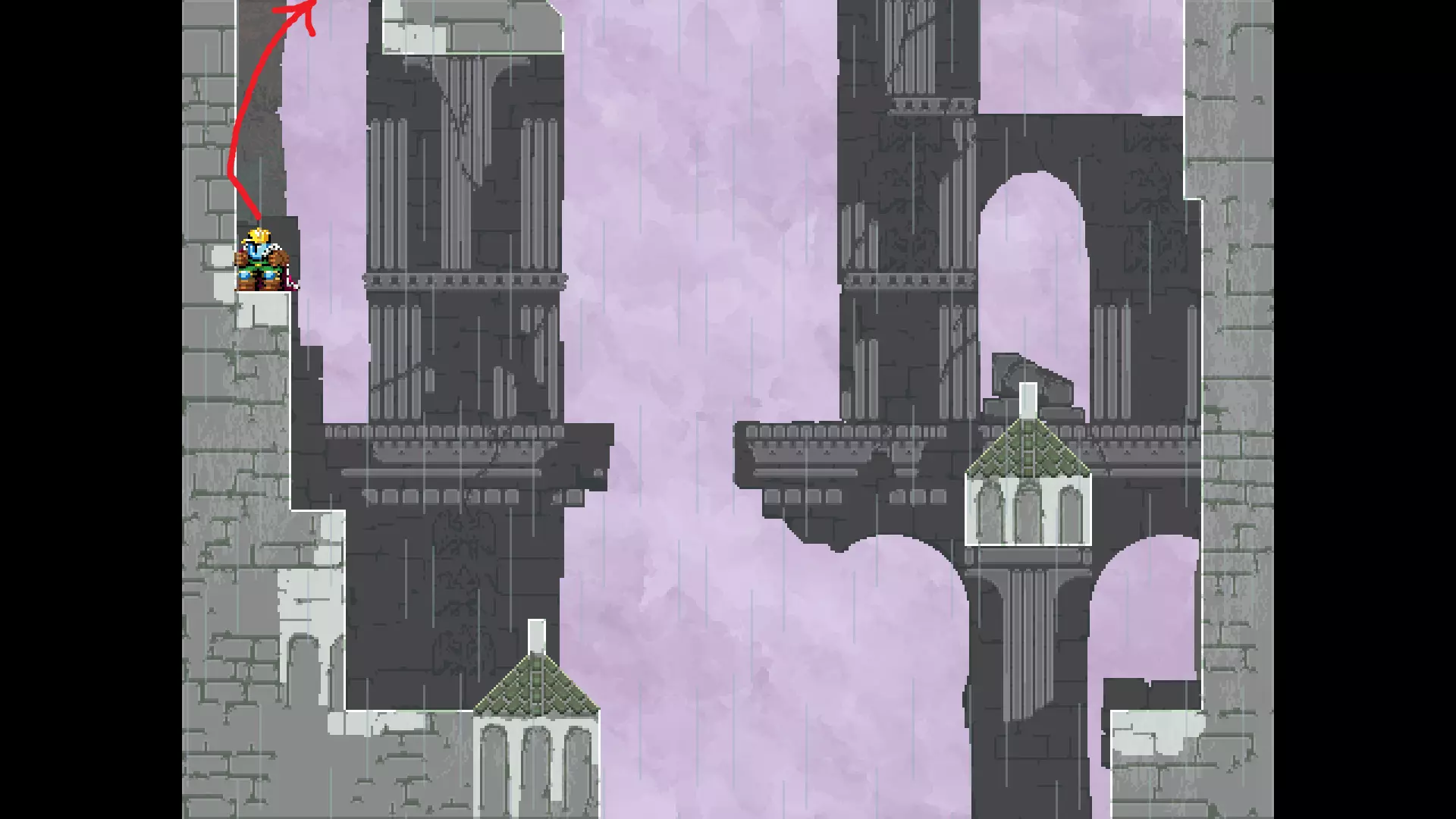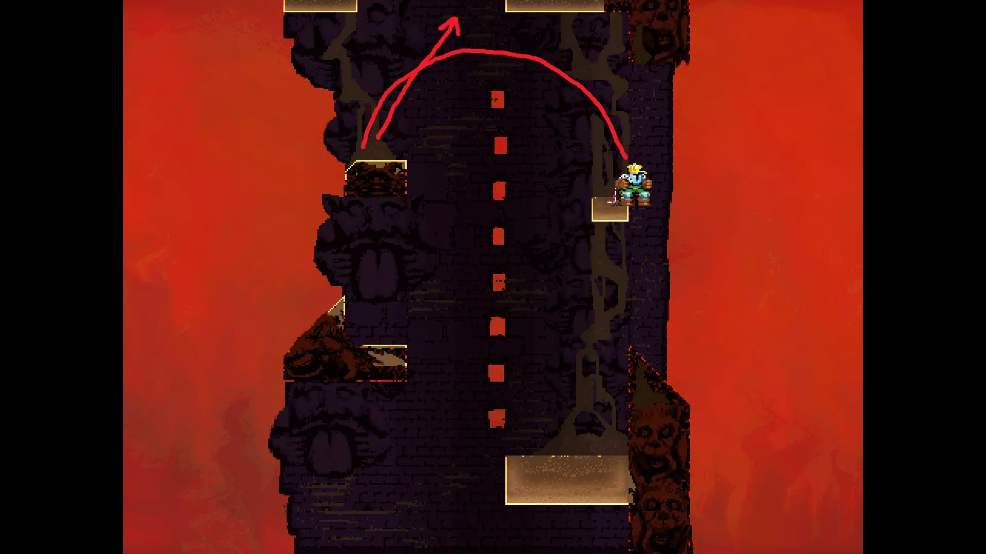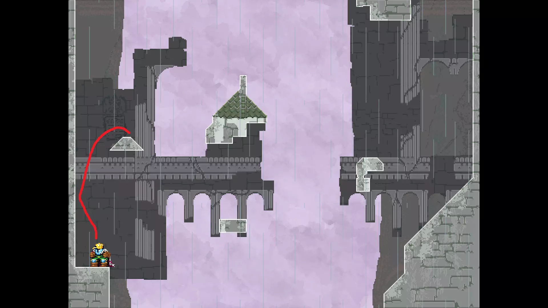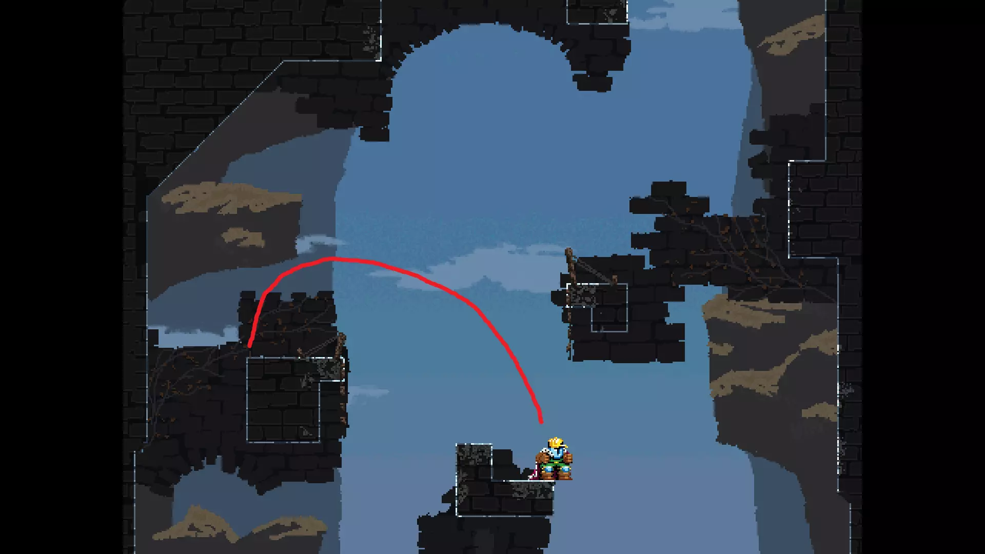 每个可全力施展的跳跃动作的截图与引导箭头。 简介 本指南旨在帮助那些需要一点额外帮助来冲过终点线的玩家。我是那种会观看他人通关视频并学习其操作的玩家。这款游戏本身已经足够困难,没必要再做一些不必要的跳跃。如果我能用全力跳跃来确保成功,我就会这么做。 如果你也是这样的玩家,那么本指南适合你。如果你想完全靠自己完成所有挑战,我尊重你,但请现在离开。 本指南并非旨在展示所有情况下最快或最佳的跳跃方式,而只是展示我能够确保使用全力跳跃就能成功的位置。请密切注意脚部的位置。有些跳跃比其他跳跃要精确得多。如果是像素级精准,我会显示脚部的放大窗口来帮助你对齐。特别感谢Jump King Discord中那些疯狂的人们,他们指出了我遗漏的许多跳跃点。尤其要感谢kebb、Memzy64u、DrJump_、Rossiyan和Abaddon。主游戏 - 传说中的宝贝