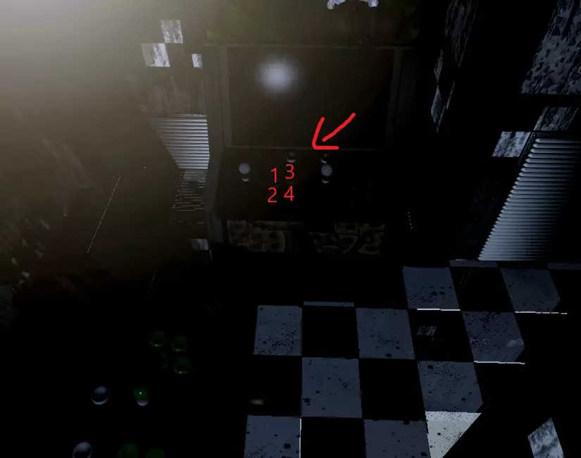之后前往那里获取最后一个气球。完成那个小游戏后,你会回到第一夜。当你回到第一夜时,前往7号监控并按以下精确顺序按下街机上的按钮