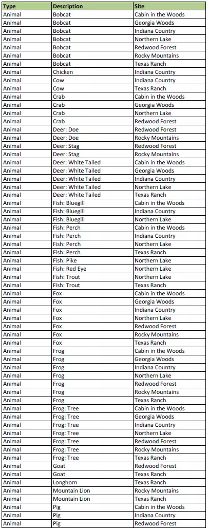 这些快速查询表将帮助你找到动物的位置。无需再在手册中反复翻阅。 【短吻鳄到野猪】