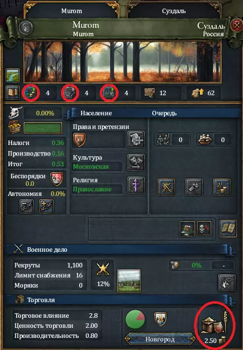 因此,贸易影响力将从喀山(右侧)传递至诺夫哥罗德(左侧)。 您的商人收入显示在左上角的面板上。