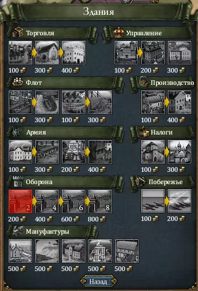 (上方的三个按钮是省份发展按钮,其右侧是升级等级,左下方是该省份生产的商品) 税收最好在大城市和国家首都提高。提升招募等级几乎毫无用处,仅为了提高最大招募量才进行升级(在游戏后期阶段有用)。除了直接提升省份发展度外,还可以建造能够提高省份各项指标的建筑。