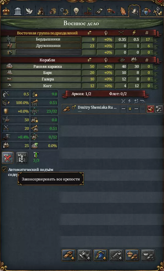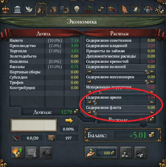 陆军和海军是任何国家的重要组成部分。但维持军队并非廉价的开销,因此有几个节省成本的要点: 始终保持核心陆军,在战争中不要完全依赖雇佣兵; 不要将军队维持在满编状态,以便保留雇佣兵的招募空间,雇佣兵会随着理念和改革变得更便宜,成为无需消耗宝贵兵员就能镇压叛乱的便捷工具。和平时期将军队规模降至最低(战争或叛乱时期再进行扩充)