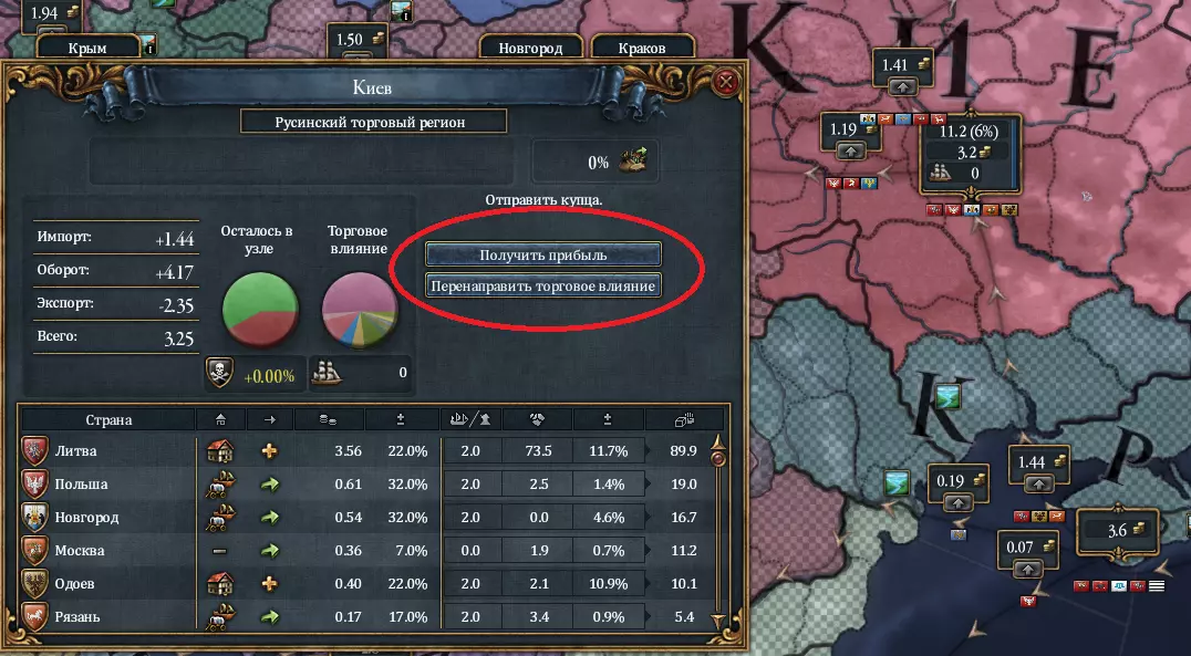 诺夫哥罗德贸易节点 (上方数字为影响力百分比,公爵领旁数字为贸易额) 要任命商人,请选择贸易地图并点击任意贸易节点。