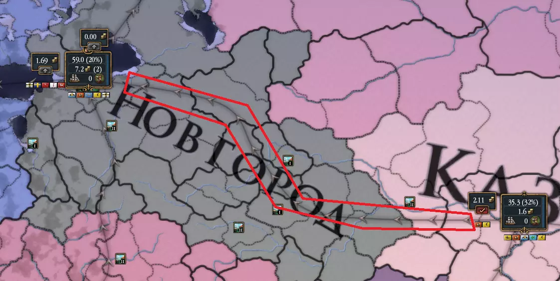 贸易地图上的节点(该地图的快捷键:У,返回:Ц)。不同节点的贸易额也不同,如果在一个节点拥有50%的影响力能赚取5杜卡特,那么在另一个节点可能就能赚取7杜卡特,因此有时将贸易影响力从低贸易额节点转移到高贸易额节点会更有利。例如:
