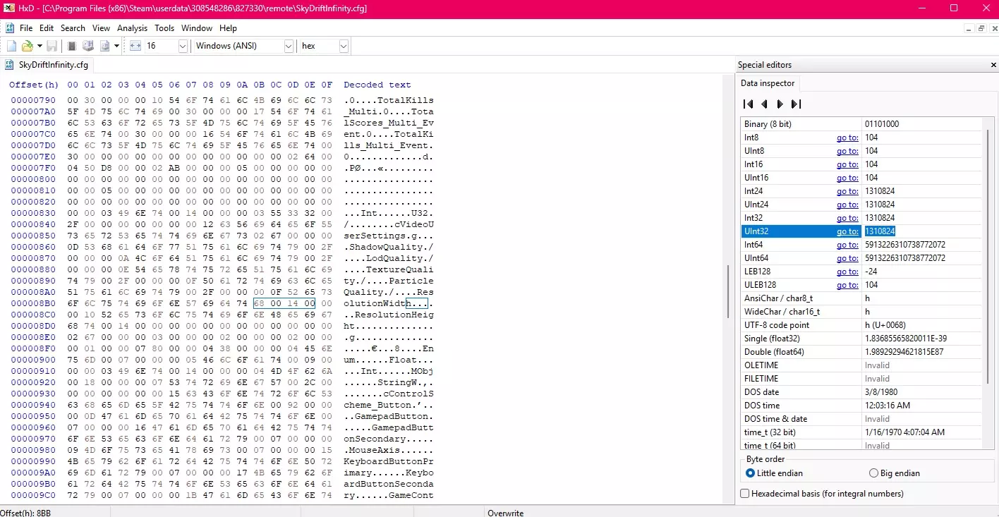 ### 如何更改分辨率的详细简易指南 #### 简介 本指南旨在帮助玩家更改游戏分辨率,目前除了此方法外,暂未发现其他解决方案。 游戏在播放完开场动画后,通常会锁定在左侧的小屏幕上,且不会根据玩家的分辨率进行调整。 游戏内没有提供更改分辨率的选项。 注:本指南基于用户EduRX2001提供的解决方案制作,所有功劳归于他。我只是将其整理得更易于理解,因为我自己在使用十六进制编辑器时也遇到了一些困难。 #### 步骤1 1. 下载并安装HxD: 在谷歌上搜索HxD并下载,这是一款免费的十六进制编辑器,我们将使用它来编辑游戏文件。 解压并安装该程序。 暂时无需打开它。步骤2 2 - 找到与游戏相关的文件: 你需要找到SkyDriftInfinity.cfg文件,该文件位于以下路径: C: Program Files (x86) Steam userdata SteamUserID 827330 remote (SteamUserID是你的个人ID,通常是一串数字。)