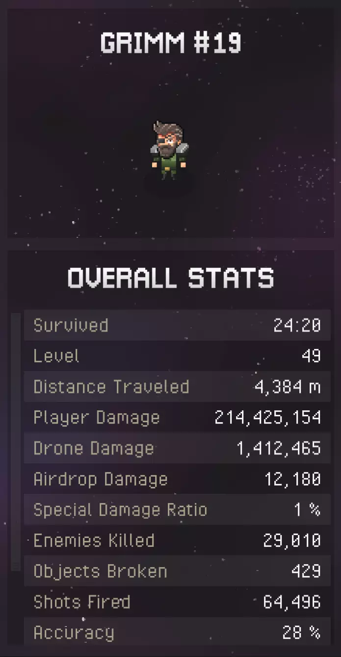 本指南将在一段时间内持续更新完善,因为抢先体验版中已经包含了相当多的地图和武器。欢迎大家在评论区贡献内容! 鸣谢! 本指南的大部分内容来源于我自己的测试、社区评论以及朋友的帮助,但部分细节和图片取自游戏文件或NIMRODS维基。 大家可以查看该维基以获取外部且准确的信息,其网站格式非常友好!属性 子弹伤害>子弹/火箭等命中时造成的伤害 >火箭的爆炸伤害也来源于此属性 射速>每秒射击次数 >最高为60 暴击率>造成暴击伤害的几率(基于子弹伤害和暴击加成) >最高为100% 暴击加成>暴击造成的额外伤害百分比 >基础值为100 >计算公式=暴击伤害=[子弹伤害*(1+暴击加成)] 子弹数量>每次射击发射的子弹数 >小数部分视为“几率”(2.2代表2发子弹,有五分之一的几率额外获得1发子弹 穿透力>子弹可穿透的敌人数量 >虽然对火箭弹有效,但不确定它们是否真的能穿透 弹匣容量>需要重新装弹前可射击的次数 换弹速度>装弹的速度 >似乎被解读为“每秒装弹次数”,例如数值为3时0装填速度约为三分之一秒 子弹散布>发射子弹的散布范围 >确切数值不确定,但25的散布值大约对应1米的散布范围(推测,因为不清楚游戏内1米具体是多少) 子弹射程>子弹飞行的距离(以米为单位) >直接影响伤害衰减(衰减公式未知) 子弹速度>子弹飞行速度(米/秒) >速度越高,射程越远,伤害衰减越少 子弹大小>子弹的体积 >0.00大小约为5厘米(基于推测),1.0大约为半米 较大的子弹命中速度更快,但也更容易被墙壁阻挡而失效 击退力>基础击退百分比 100%大约为一米的击退距离 特殊能力>根据下挂配件改变基础数值 每个下挂配件都有各自的每击伤害计算公式,具体公式尚不明确 下挂配件充能速率>影响充能速度,或每次充能的次数 基于击杀或升级充能的下挂配件,其基础充能次数会加上超出100%部分的数值 效果范围>效果范围的百分比,例如爆炸范围、火焰区域、特斯拉跳跃范围等 最大生命值>当前最大生命值 生命 regeneration>生命值再生速率(HP/秒) 治疗加成>获得治疗时的治疗量百分比(基础治疗量为20时,150%的治疗效果会回复30点生命值,以此类推) 护甲>原始伤害减免 - 1点护甲可使受到的单次伤害减少1点。 >若某次攻击的伤害低于你的护甲值,则该次攻击只会造成1点伤害 闪避技能>闪避概率(百分比) >最高为70(可能会更高,但我达到70后就再也没见过闪避升级选项了) 移动速度>移动速度(单位:米/秒) 技能充能速率>角色技能充能速率 - 例如冲刺、狂怒、燃烧瓶 视野范围>基础视野范围的增加百分比 >不确定具体的基础视野范围,估计为15米 敌人生成速率>敌人生成的速度/数量这意味着前期能获得更多经验值,但后期挑战也更大 经验值获取率>经验值拾取的百分比加成 资源掉落率>敌人掉落资源的概率倍数百分比 资源额外获取概率>从矿脉/可破坏物中获得额外资源的百分比概率 信用点掉落概率>从怪物/可破坏物中获得额外信用点的百分比概率 信用点加成>获得信用点数量的百分比倍数 空投容量>出现额外选项的百分比概率 >基础数量为3 >134%=必定出现4个选项,167%=必定出现5个选项,以此类推 >据我观察,最大值为8个(299%) >显然并非所有空投舱都受此影响?【拾取范围】:以米为单位的地面物品拾取距离 本指南若出现在除Steam社区指南外的其他平台,均为未经允许的盗用内容 武器介绍!