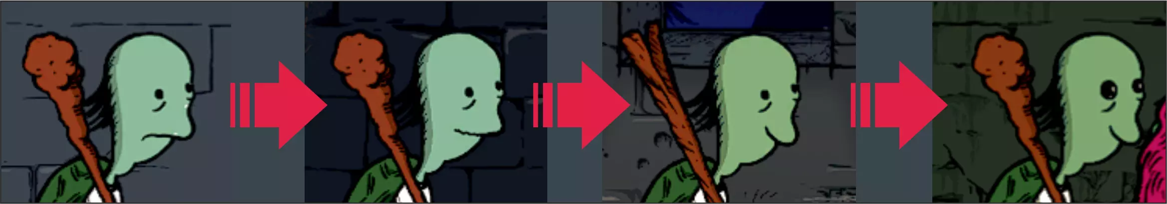 变形药水=大脑+眼睛 使用后会暂时将你变成紫色怪物。 塔楼里的怪物会停止攻击你,但已集结的同伴会立刻想要杀死你。 如果连续喝下2瓶这种药水,你会永久变成怪物。 如果喝下3瓶,你会变成一把扫帚。 此外,还可以将这种药水扔向敌人,把他们变成物品。这非常有帮助,尤其是当敌人占据了对你不利的位置并阻碍你前进时。