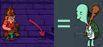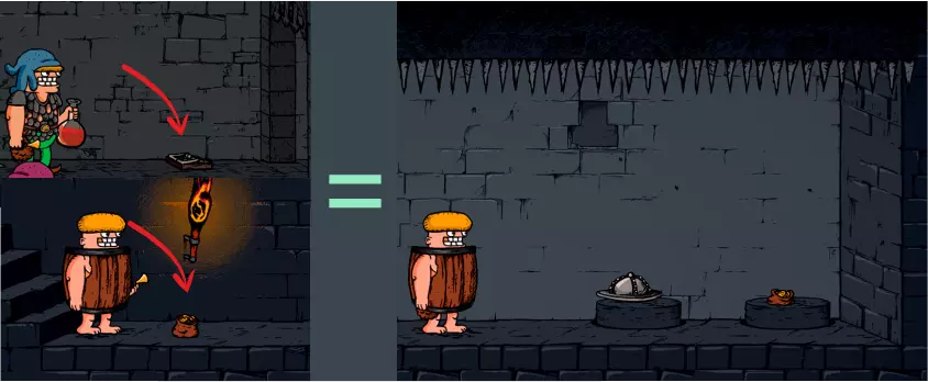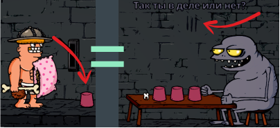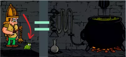 他会让你下注玩“猜杯子”游戏——猜硬币在哪个杯子下面。 为了获得更好的奖励,重要的不是价值,而是赌注的重量。把重物放在平台上——可以是尸体、铁砧、可靠的同伴,或者你沉甸甸的钱包。 确认游戏时要小心——很容易把同伴或自己的生命押上。此外,在他那边的墙上可以直接看到游戏将进行到多少场胜利——请注意他那边墙上的横线数量。 游戏胜利后(或击败戒指持有者后),可以领取剩余的奖励。为此,你需要站在某个高处(铁砧/凳子),或者用非常长的武器(大多数双手武器或戒指怪的尸体都可以)来击碎战利品。 炼金 如果在楼层上发现了青蛙,那么其中一扇门后会有一口大锅和一堆配料。