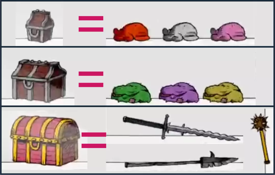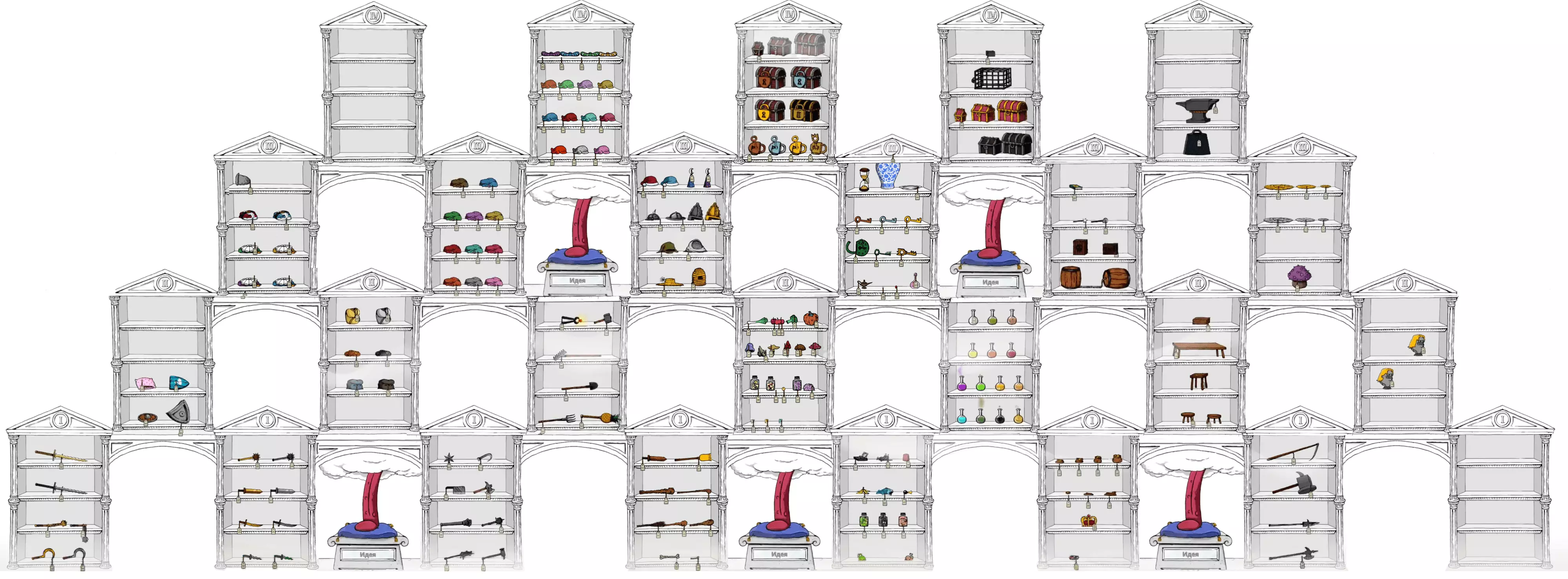 从小宝箱中经常会开出所有11种颜色的布帽; 从中宝箱中会开出所有颜色的布制服装; 从带金色镶边的大粉宝箱中会开出各种贵重武器、盔甲及其他珍贵物品。 需要注意的是,“经常”并不意味着“总是”。宝箱中也可能会出现其他物品。 这是我们购买了这3种宝箱各约50个后的统计结果。 我们开启其他类型的宝箱数量较少,如果您有相关统计数据,欢迎在评论区分享。游戏内所有物品 您可以在此处查看所有可购买/出售的物品(完整收集还缺少二楼右侧的几个雕像。一旦找到它们,我们将更新截图)