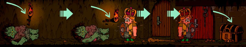 在单个洞穴关卡中,常见的门被由拱门构成的迷宫所取代。 虽然关卡总共只有3个,但在其中花费的时间甚至可能比在塔楼的9层还要多(尤其是当你想探索所有房间寻找战利品,而不是直接寻找出口时)。 你的同伴在洞穴中的心情会逐渐变差。如果他们过于沮丧,就会攻击你。对此要小心,定期给盟友扔些硬币。没有金币时,要么赶紧前往出口,要么将伙伴留在某个房间里。详情请见【伙伴】部分。 这里没有陷阱。你不会在这里遇到尖刺、深渊、铁砧或是断头戟。唯一可能踩到的东西是爆炸蘑菇。 敌人数量众多。房间里挤满了手持不错武器的怪物,有时还会遇到 troll、蝙蝠和疯狂的冒险者。 黑暗房间更多了。当塔中房间的火炬熄灭时,就得“赶紧溜”。这样的房间有很多。整体而言,洞穴场景采用了黑暗阴森的色调。在洞穴中可以找到: 黑色的新型宝箱 各种蘑菇(根据颜色不同,能在极短时间内提供一种药水效果)。甚至还有一个单独的成就——尝试每一种蘑菇(包括会爆炸的那种)。隐藏的宝藏室与特殊宝箱 要找到宝藏室,需先找到有 troll( troll)和硬币的房间。 (也可根据地上的硬币来判断,因为 troll( troll)可能出现在多个房间)。 该房间通常出现在洞穴的同一层,但也可能在第二层或第三层。 击败 troll( troll)后,击打墙上的火炬,秘密门就会打开。 门后有硬币和一个用皇家锁封印的特殊宝箱。